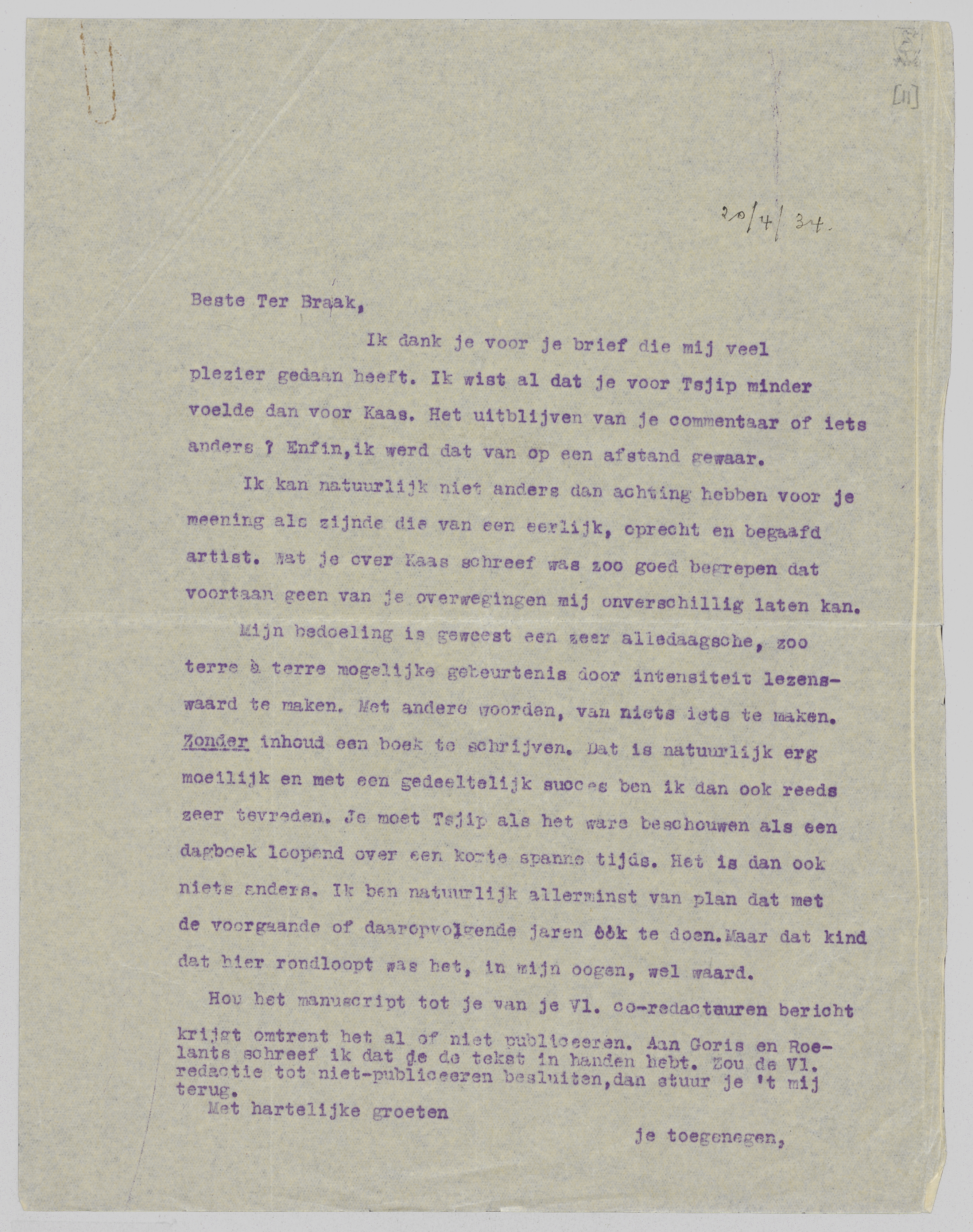 Ik dank je voor je brief die mij veel plezier gedaan heeft. Ik wist al dat je voor Tsjip minder voelde dan voor Kaas. Het uitblijven van je commentaar of iets anders? Enfin, ik werd dat van op een afstand gewaar.