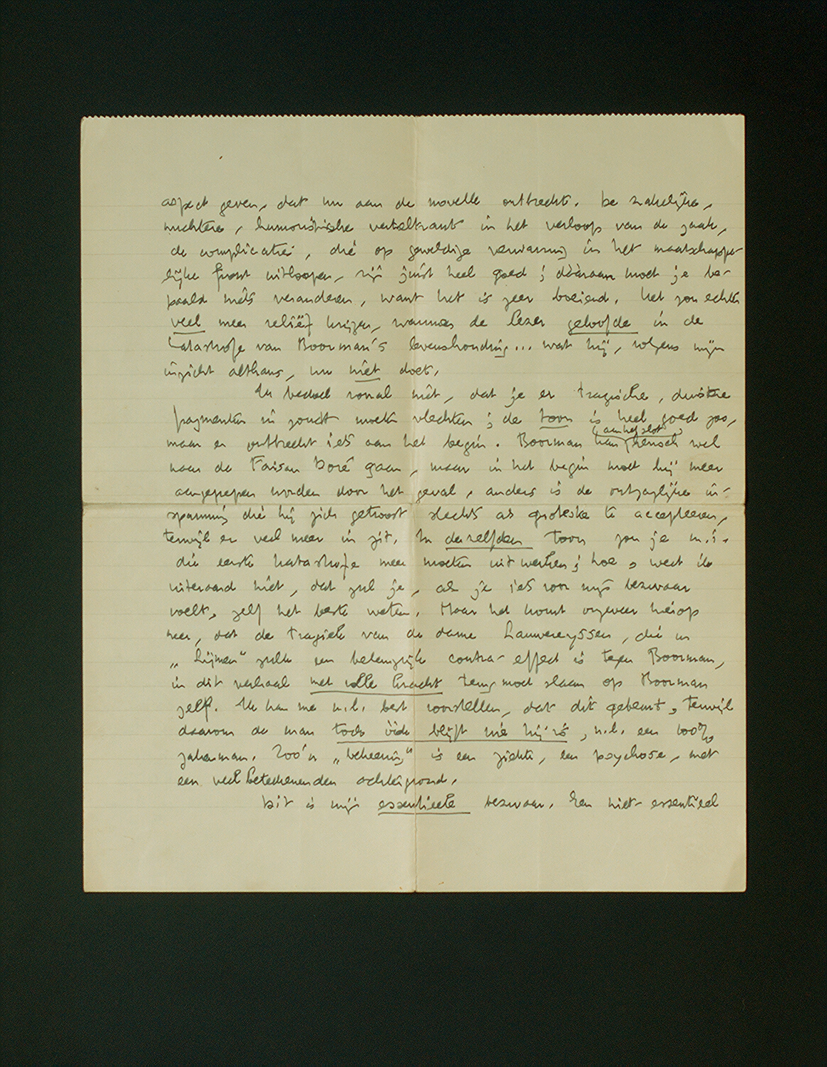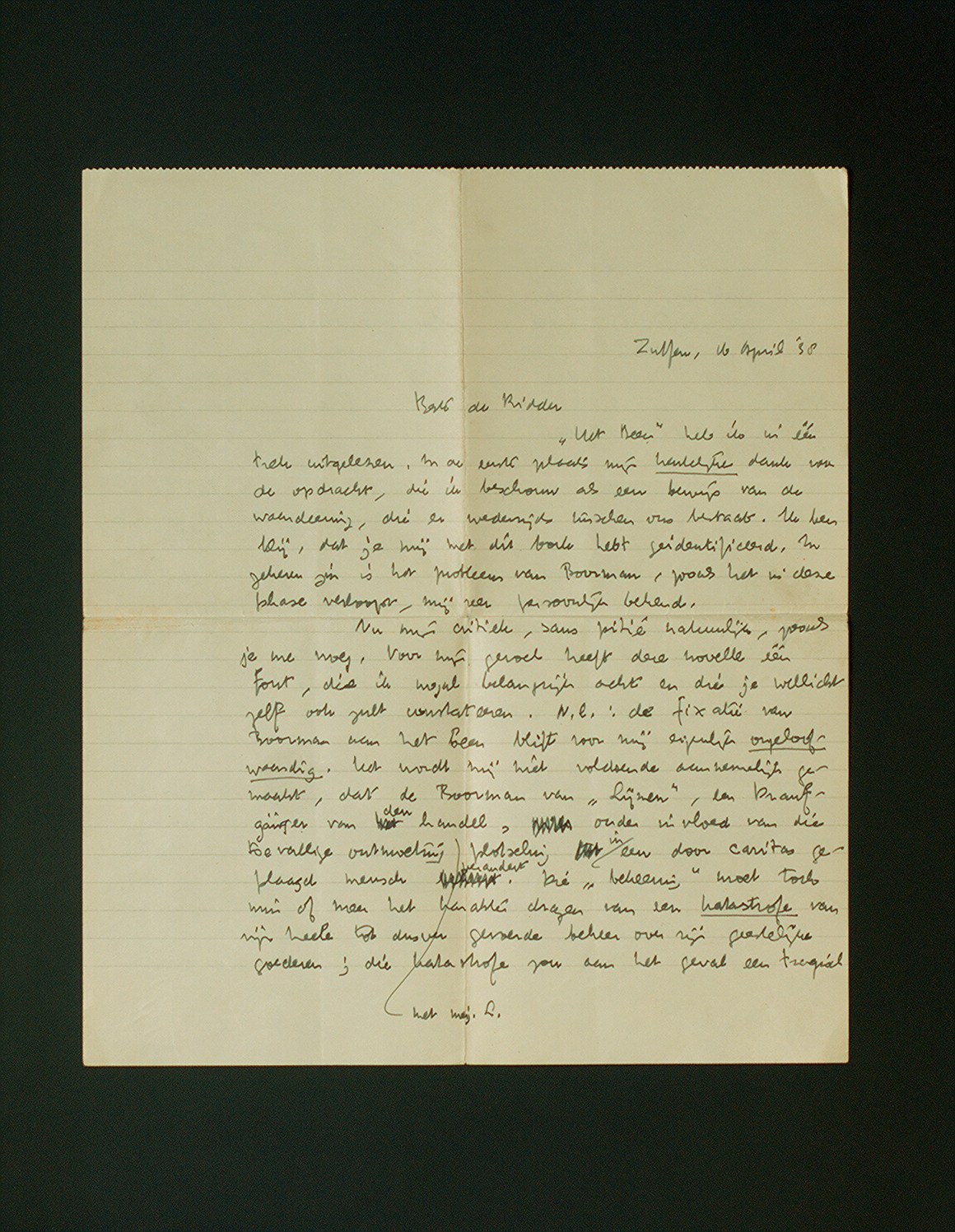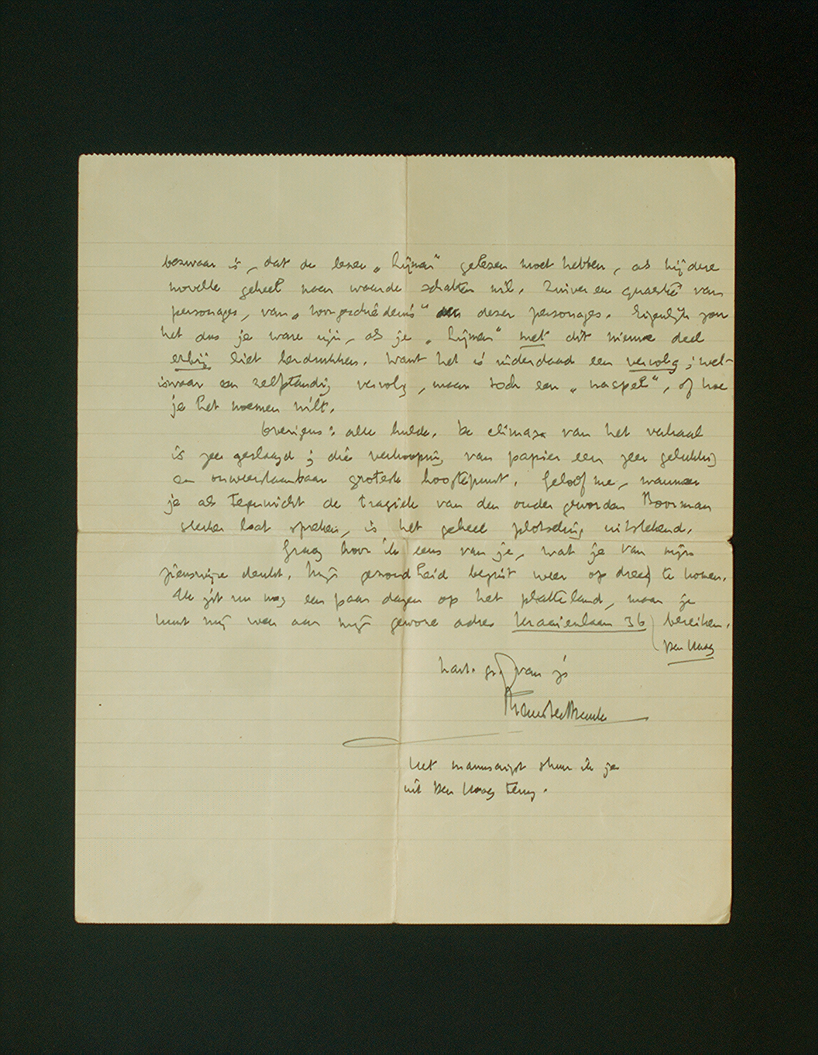 ‘Het Been’ heb ik in één trek uitgelezen. In de eerste plaats mijn hartelijke dank voor de opdracht, die ik beschouw als een bewijs van de waardeering, die er wederzijds tusschen ons bestaat. Ik ben blij, dat je mij met dit boek hebt geidentificeerd. In zekeren zin is het probleem van Boorman, zooals het in deze phase verloopt, mij zeer persoonlijk bekend.