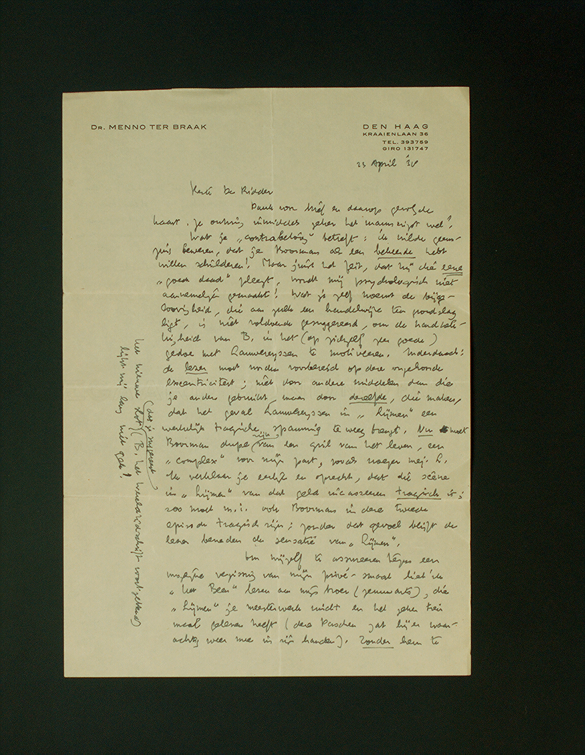Wat je ‘contrabetoog’ betreft: ik wilde geenszins beweren, dat je Boorman als een bekeerde hebt willen schilderen! Maar juist het feit, dat hij die eene ‘goede daad’ pleegt, wordt mij psychologisch niet aannemelijk gemaakt! Wat je zelf noemt de bijgeloovigheid, die aan zulk een handelwijze ten grondslag ligt, is niet voldoende gesuggereerd, om de hardnekkigheid van B. in het (op zichzelf zeer goede) gedoe met Lauwereyssen te motiveeren. Inderdaad: de lezer moet worden voorbereid op deze ongehoorde excentriciteit; niet door andere middelen dan die je anders gebruikt, maar door dezelfde, die maken, dat het geval Lauwereyssen in ‘Lijmen’ een werkelijk tragische spanning te weeg brengt. Nu moet Boorman dupe zijn van een gril van het leven, een ‘complex’ voor mijn part, zooals vroeger mej. L. Ik verklaar je eerlijk en oprecht, dat die scêne in ‘Lijmen’ van dat geld incasseeren tragisch is; zoo moet m.i. ook Boorman in deze tweede episode tragisch zijn; zonder dat gevoel blijft de lezer beneden de sensatie van ‘Lijmen’.