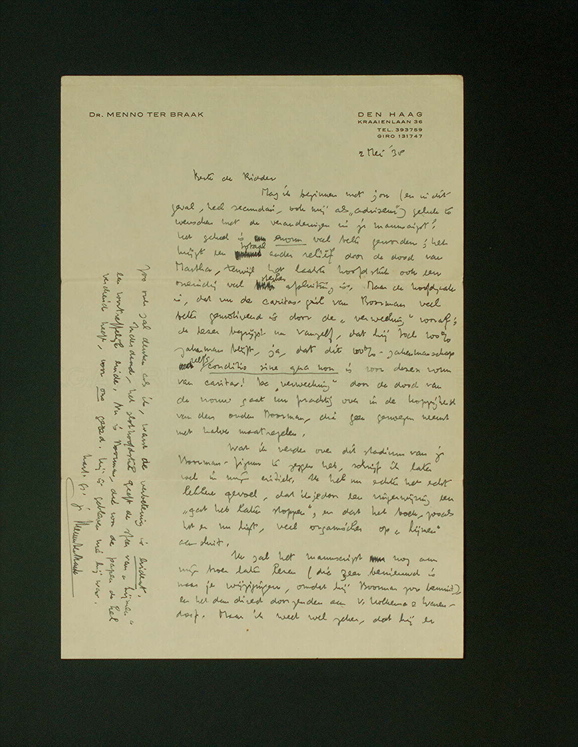 Mag ik beginnen met jou (en in dit geval, heel secundair, ook mij als ‘adviseur’) geluk te wenschen met de veranderingen in je manuscript? Het geheel is enorm veel beter geworden; het krijgt een totaal ander reliëf door de dood van Martha, terwijl het laatste hoofdstuk ook een oneindig veel sterker afsluiting is. Maar de hoofdzaak is, dat nu de caritas-gril van Boorman veel beter gemotiveerd is door de ‘verweeking’ vooraf; de lezer begrijpt nu vanzelf, dat hij toch 100% zakenman blijft, ja, dat dit 100%-zakenmanschap zelfs conditio sine qua non is voor dezen vorm van caritas! De ‘verweeking’ door de dood van de vrouw gaat nu prachtig over in de koppigheid van den ouden Boorman, die geen genoegen neemt met halve maatregelen.