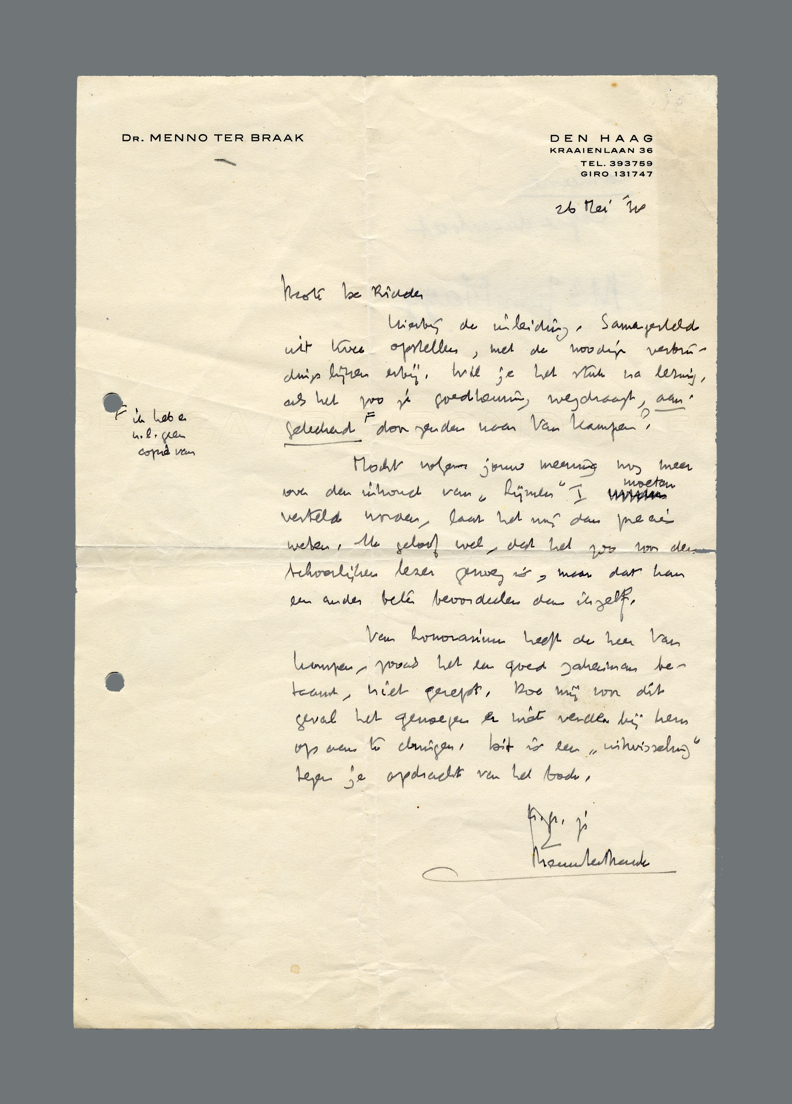 Van honorarium heeft de heer Van Kampen, zooals het een goed zakenman betaamt, niet gerept. Doe mij voor dit geval het genoegen er niet verder bij hem op aan te dringen. Dit is een ‘uitwisseling’ tegen je opdracht van het boek.