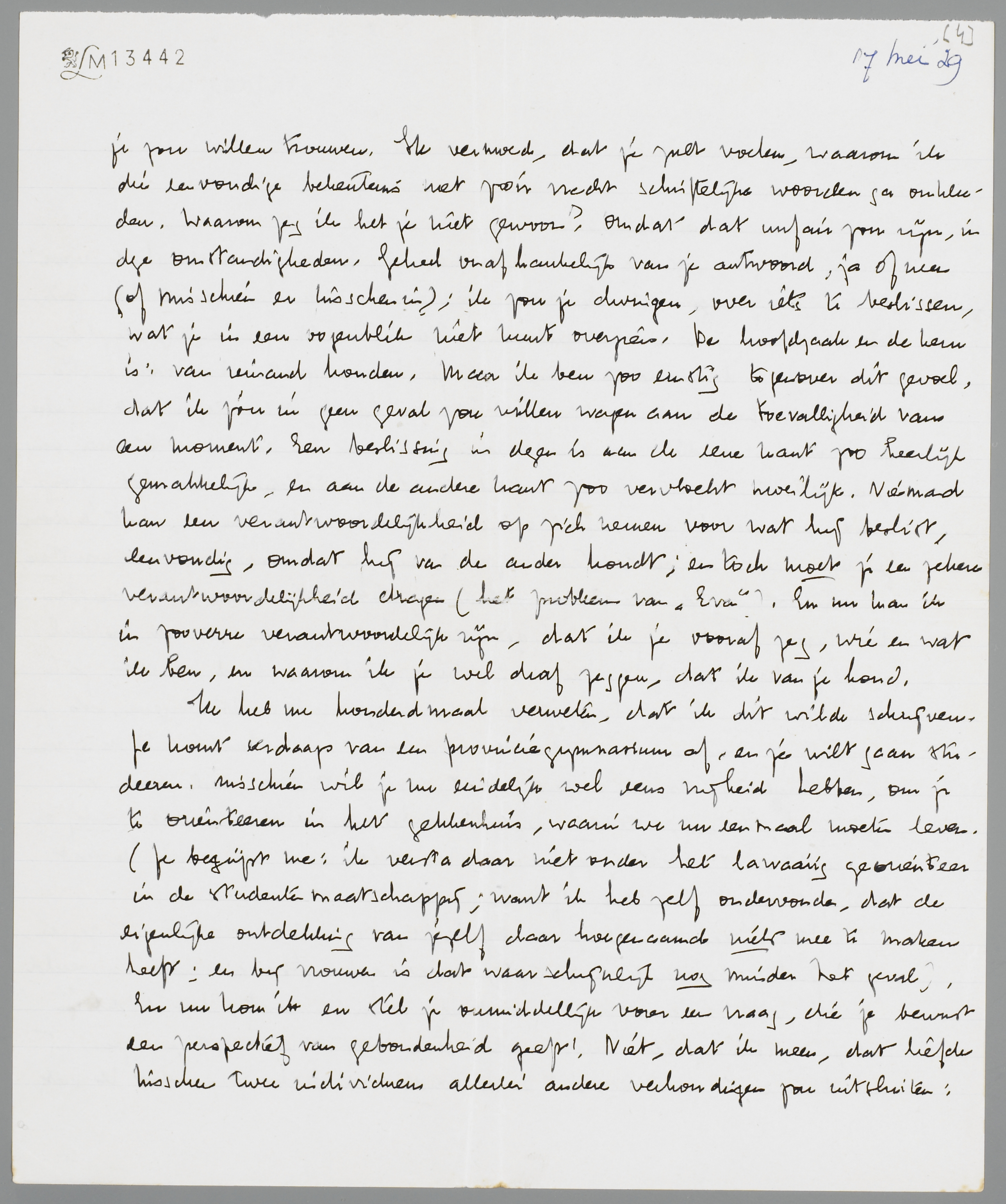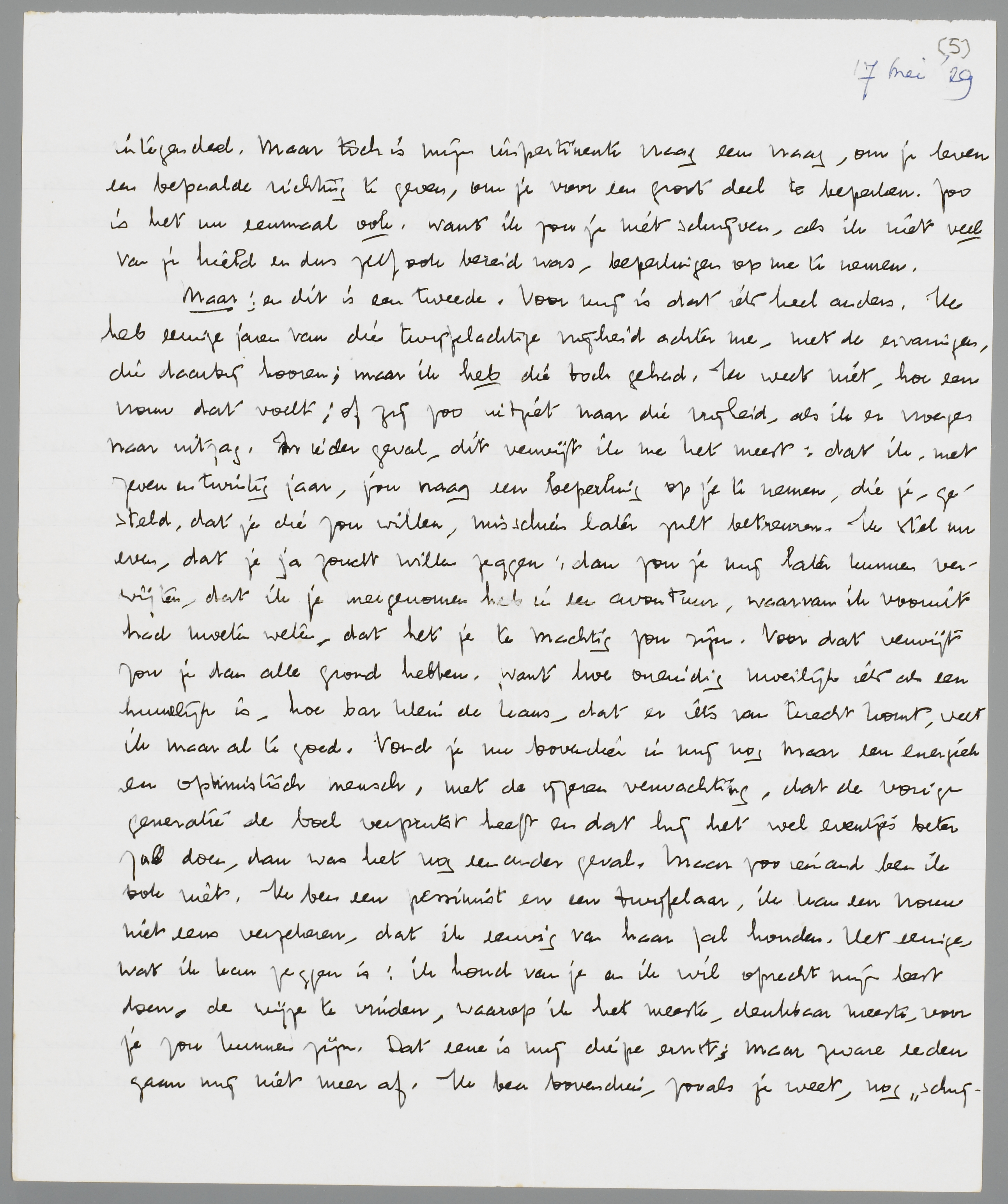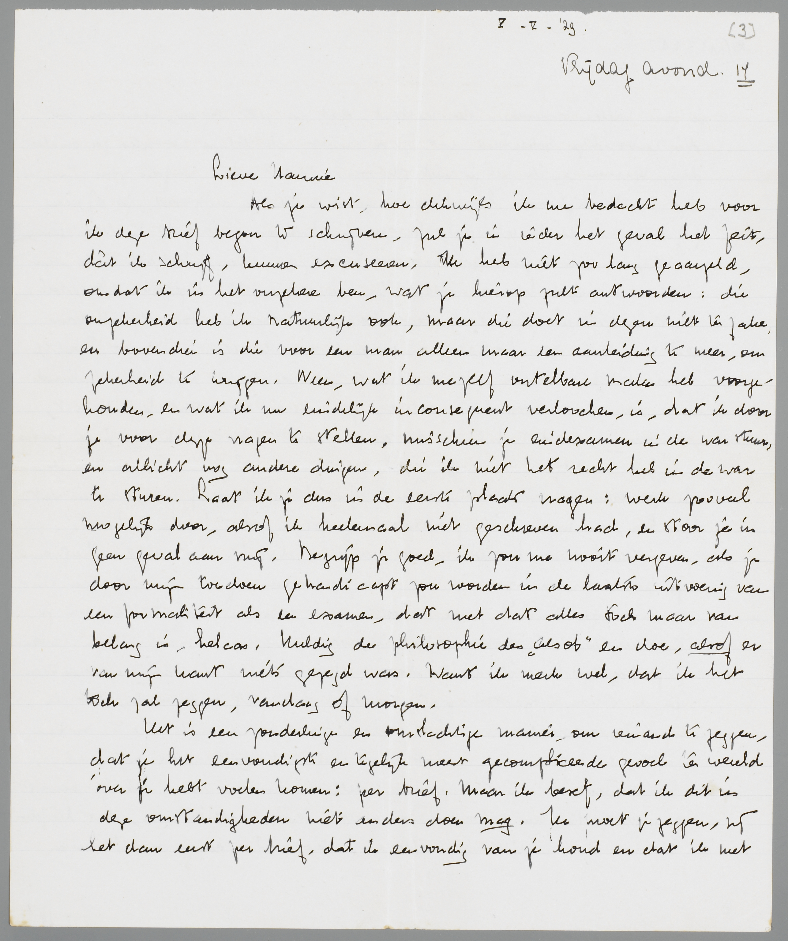 Ik heb me honderdmaal verweten, dat ik dit wilde schrijven. Je komt eerdaags van een provinciegymnasium af, en je wilt gaan studeeren. Misschien wil je nu eindelijk wel eens vrijheid hebben, om je te orienteeren in het gekkenhuis, waarin we nu eenmaal moeten leven. (Je begrijpt me: ik versta daar niet onder het lawaaiig georienteer in de studentenmaatschappij; want ik heb zelf ondervonden, dat de eigenlijke ontdekking van jezelf daar hoegenaam niets mee te maken heeft; en bij vrouwen is dat waarschijnlijk nog minder het geval). En nu kom ik en stel je onmiddellijk voor een vraag, die je bewust een perspectief van gebondenheid geeft! Niet, dat ik meen, dat liefde tusschen twee individuen allerlei andere verhoudingen zou uitsluiten: integendeel. Maar toch is mijn impertinente vraag een vraag, om je leven een bepaalde richting te geven, om je voor een groot deel te beperken. Zoo is het nu eenmaal ook, want ik zou je niet schrijven, als ik niet veel van je hield en dus zelf ook bereid was, beperkingen op me te nemen.