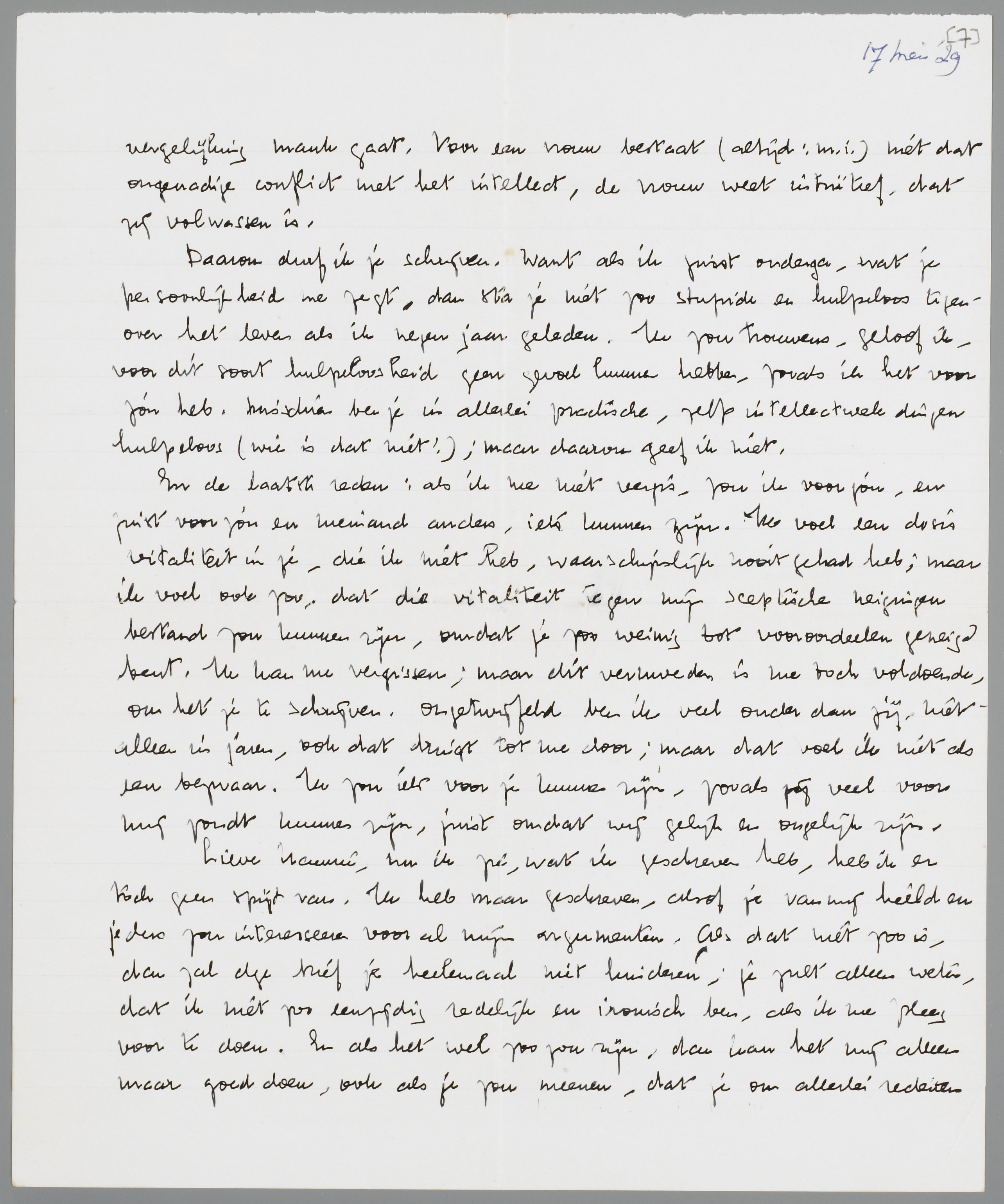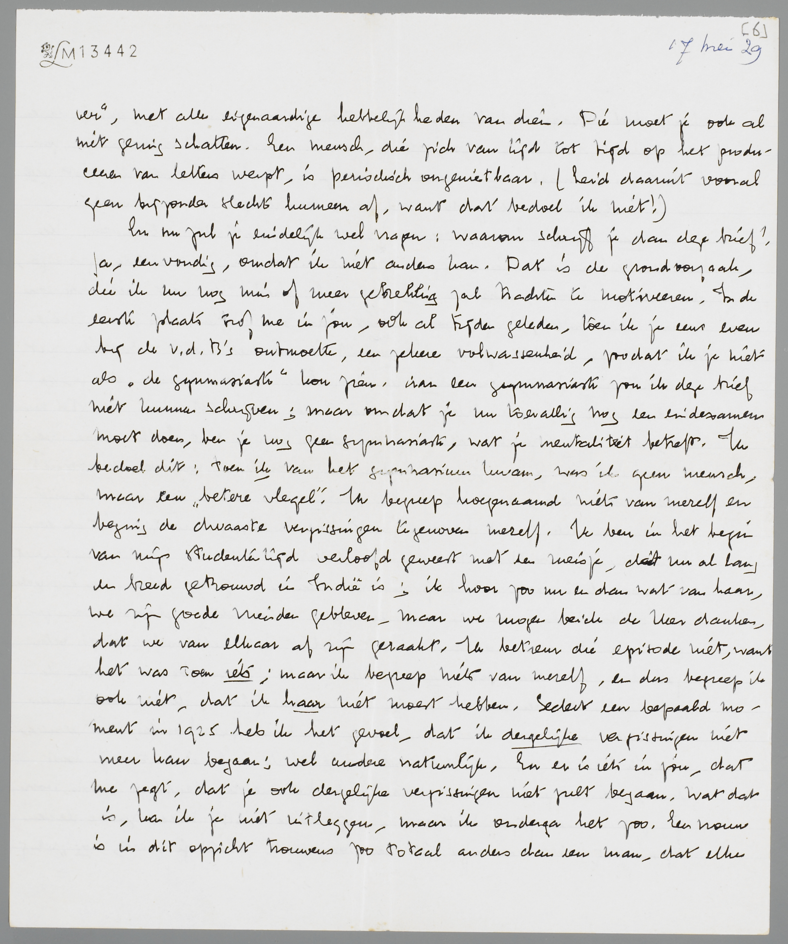 En nu zul je eindelijk wel vragen: waarom schrijf je dan deze brief? Ja, eenvoudig, omdat ik niet anders kan. Dat is de grondoorzaak, die ik nu nog min of meer gebrekkig zal trachten te motiveeren. In de eerste plaats trof me in jou, ook al tijden geleden, toen ik je eens even bij de v.d.B's ontmoette, een zekere volwassenheid, zoodat ik je niet als ‘de gymnasiaste’ kon zien. Aan een gymnasiaste zou ik deze brief niet kunnen schrijven, maar omdat je nu toevallig nog een eindexamen moet doen, ben je nog geen gymnasiaste, wat je mentaliteit betreft. Ik bedoel dit: toen ik van het gymnasium kwam, was ik geen mensch, maar een ‘betere vlegel’. Ik begreep hoegenaamd niets van mezelf en beging de dwaaste vergissingen tegenover mezelf. Ik ben in het begin van mijn studententijd verloofd geweest met een meisje, dat nu al lang en breed getrouwd in Indië is; ik hoor zoo nu en dan wat van haar, we zijn goede vrienden gebleven, maar we mogen beiden de Heer danken, dat we van elkaar af zijn geraakt. Ik betreur die episode niet, want het was toen iets; maar ik begreep niets van mezelf, en dus begreep ik ook niet, dat ik haar niet moest hebben. Sedert een bepaald moment in 1925 heb ik het gevoel, dat ik dergelijke vergissingen niet meer kan begaan; wel andere natuurlijk. En er is iets in jou, dat me zegt, dat je ook dergelijke vergissingen niet zult begaan. Wat dat is, kan ik je niet uitleggen, maar ik onderga het zoo. Een vrouw is in dit opzicht trouwens zoo totaal anders dan een man, dat elke vergelijking mank gaat. Voor een vrouw bestaat (altijd: m.i.) niet dat ongenadige conflict met het intellect, de vrouw weet intuïtief, dat zij volwassen is.
