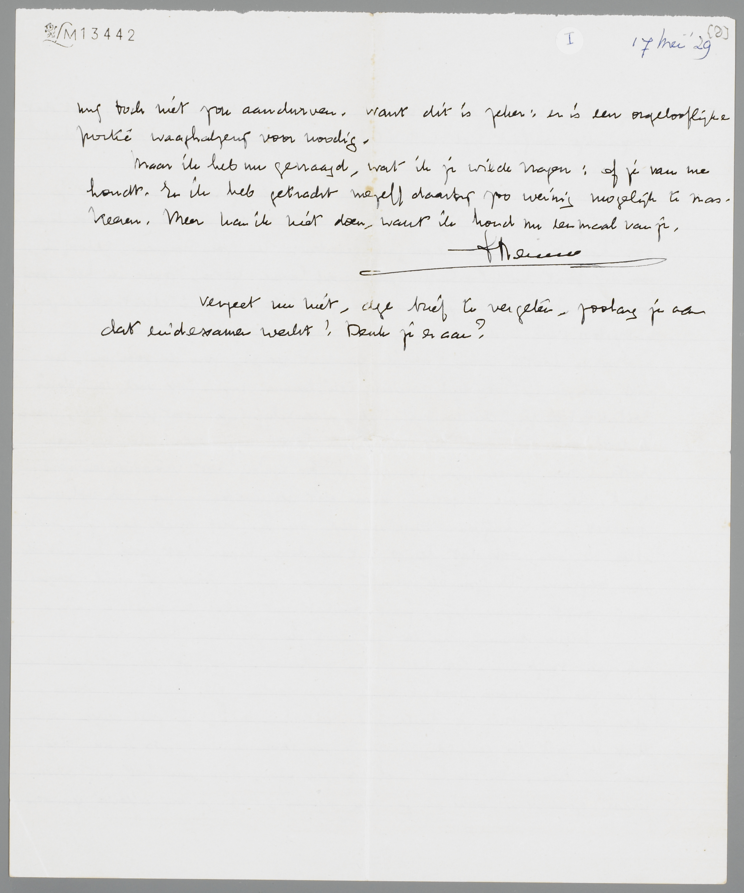 Maar ik heb nu gevraagd, wat ik je wilde vragen: of je van me houdt. En ik heb getracht mezelf daarbij zoo weinig mogelijk te maskeeren. Meer kan ik niet doen, want ik houd nu eenmaal van je.