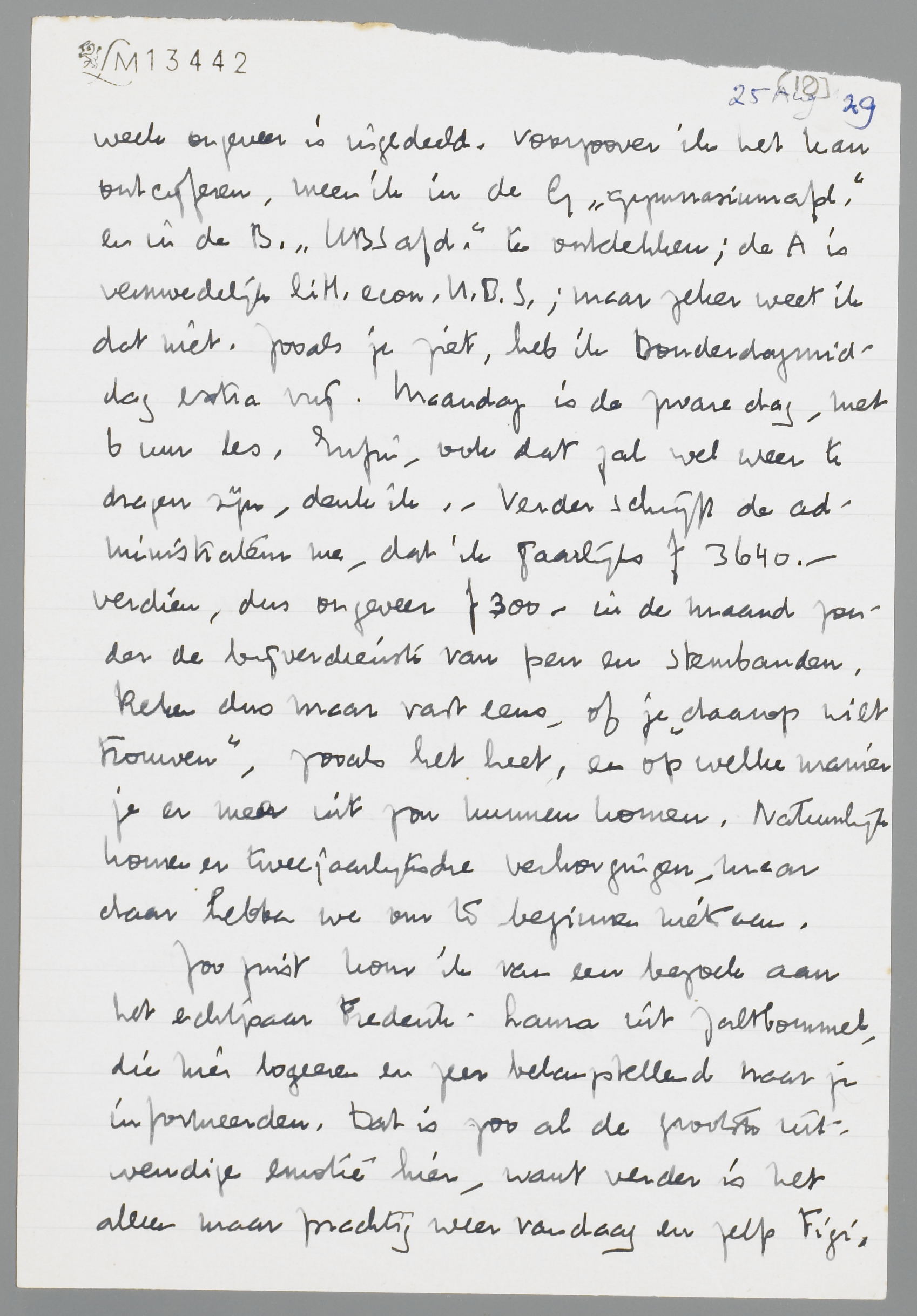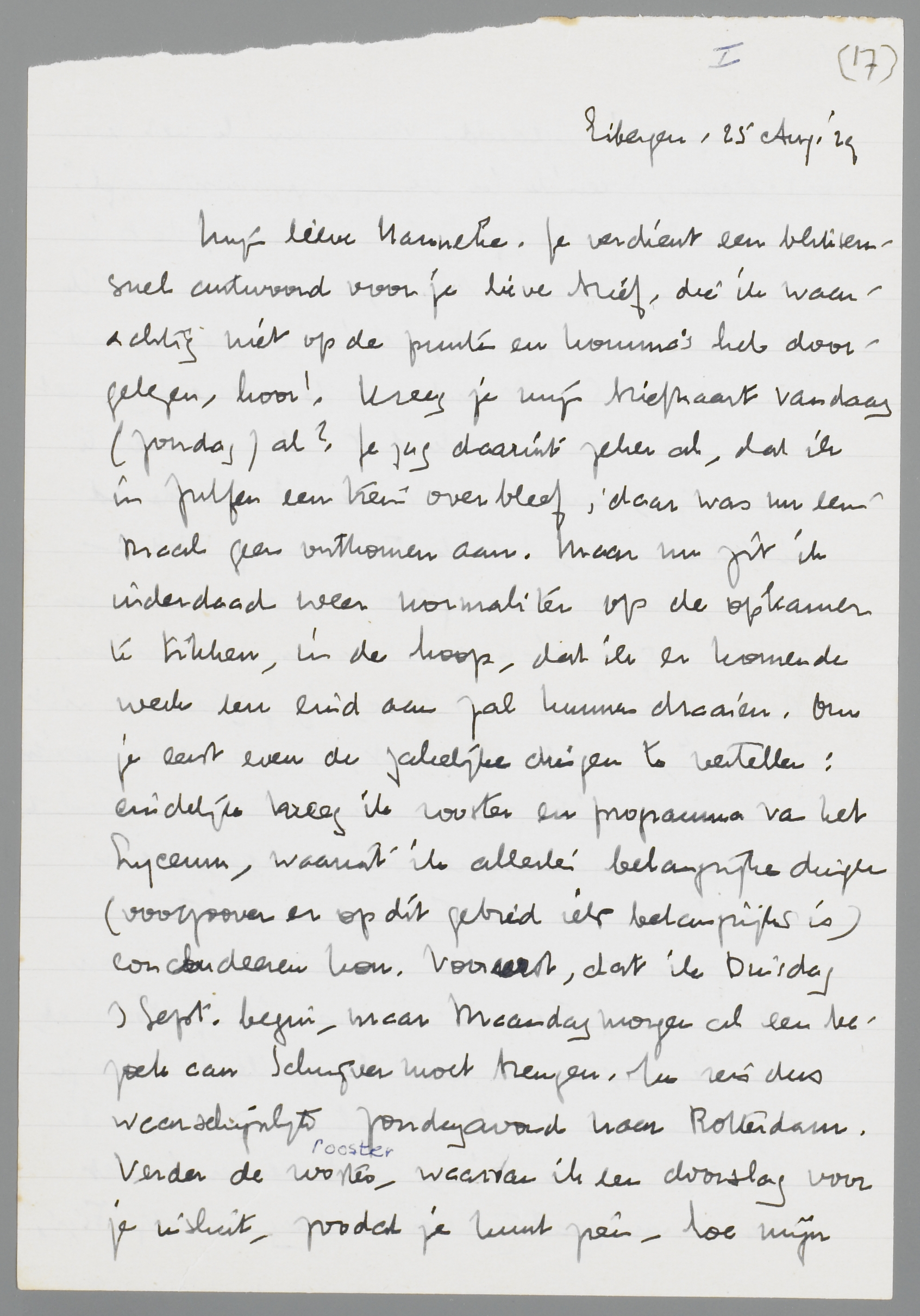 Je verdient een bliksemsnel antwoord voor je lieve brief, die ik waarachtig niet op de punten en komma's heb doorgelezen, hoor! Kreeg je mijn briefkaart vandaag (Zondag) al? Je zag daaruit zeker al, dat ik in Zutfen een trein overbleef; daar was nu eenmaal geen ontkomen aan. Maar nu zit ik inderdaad weer normaliter op de opkamer te tikken, in de hoop, dat ik er komende week een eind aan zal kunnen draaien. Om je eerst even de zakelijke dingen te vertellen: eindelijk kreeg ik rooster en programma van het Lyceum, waaruit ik allerlei belangrijke dingen (voorzoover er op dit gebied iets belangrijks is) concludeeren kon. Vooreerst, dat ik Dinsdag 3 Sept. begin, maar Maandagmorgen al een bezoek aan Schrijver moet brengen. Ik reis dus waarschijnlijk Zondagavond naar Rotterdam. Verder de rooster, waarvan ik een doorslag voor je insluit, zoodat je kunt zien, hoe mijn week ongeveer is ingedeeld. Voorzoover ik kan ontcijferen, meen ik in de G ‘gymnasiumafd.’ en in de B. ‘HBSafd.’ te ontdekken; de A is vermoedelijk litt. econ. H.B.S.; maar zeker weet ik dat niet. Zooals je ziet, heb ik Donderdagmiddag extra vrij. Maandag is de zware dag, met 6 uur les. Enfin, ook dat zal wel weer te dragen zijn, denk ik. - Verder schrijft de administrateur me, dat ik jaarlijks ƒ3640._ verdien, dus ongeveer ƒ300_ in de maand zonder de bijverdienste van pen en stembanden. Reken dus maar vast eens, of je ‘daarop wilt trouwen’, zooals het heet, en op welke manier je er mee uit zou kunnen komen. Natuurlijk komen er tweejaarlijkse verhoogingen, maar daar hebben we om te beginnen niets aan.