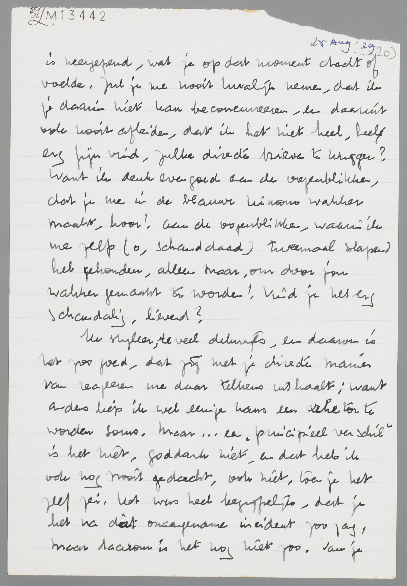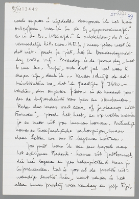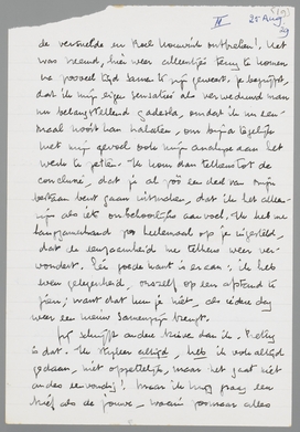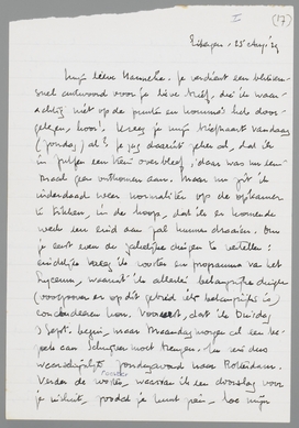 Ik styleer, te veel dikwijls, en daarom is het zoo goed, dat jij met je directe manier van reageeren me daar telkens uit haalt; want anders liep ik wel eenige kans een [?] te worden soms. Maar... een ‘principieel verschil’ is het niet, goddank niet, en dat heb ik ook nog nooit gedacht, ook niet, toen je het zelf zei. Het was heel begrijpelijk, dat je het na dat onaangename incident zoo zag, maar daarom is het nog niet zoo. Van je moeder, waar ik overigens zoo erg prettig mee kan opschieten en zoo heelemaal ‘op voet van gelijkheid’ kan praten, blijft het me toch bevreemden, deze wijze van reactie op zulke dingen, die dan toch wel in de eerste plaats persoonlijk verstaan eischen!
