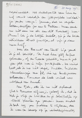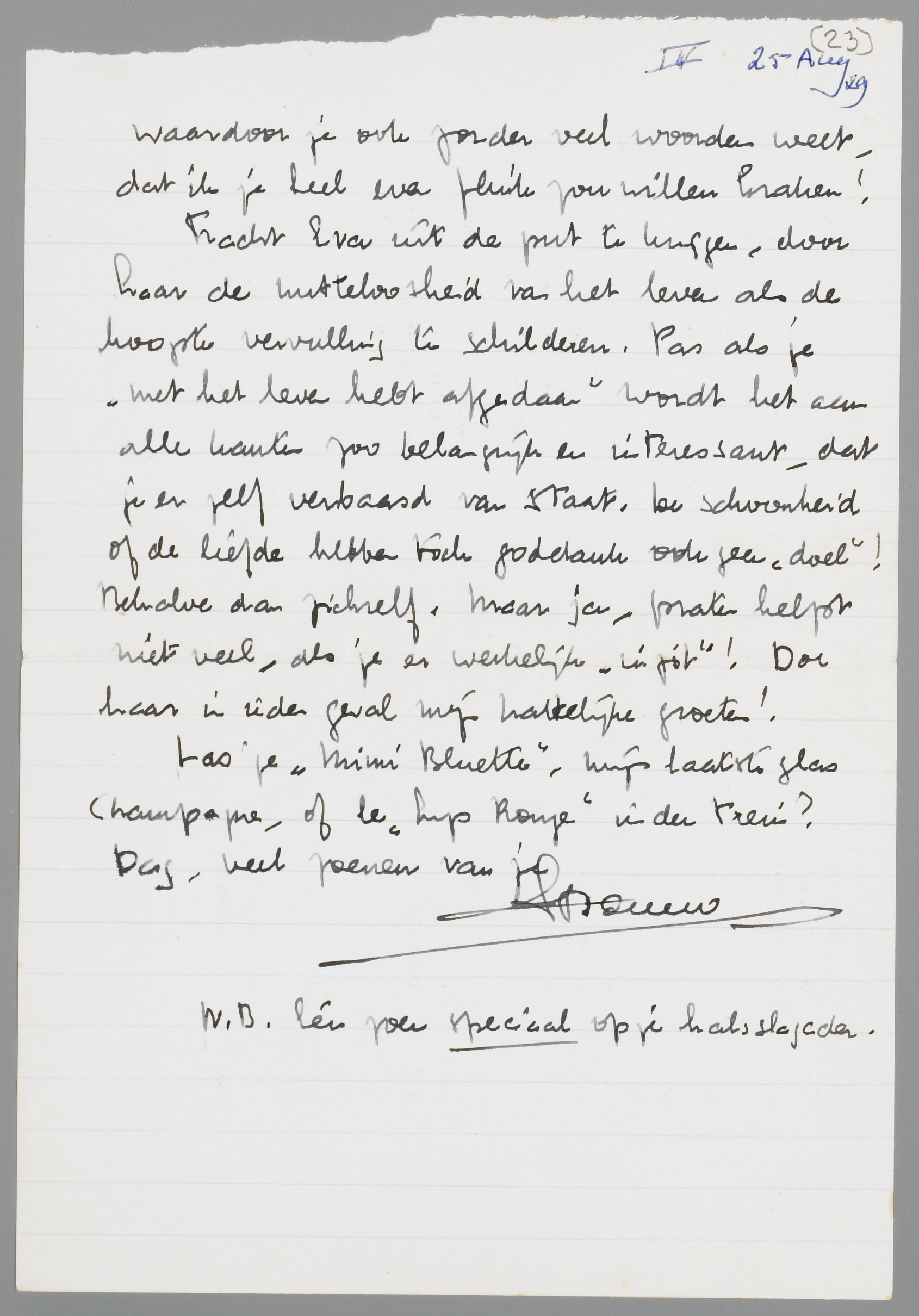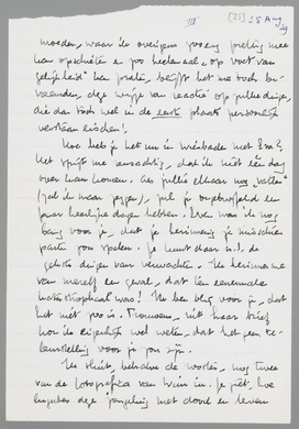 Nu Pjotr, als ik nu niet ophoud (het is trouwens elf uur), geloof ik, dat ik toch je stijl ga imiteeren en je schriftelijk op allerlei plaatsen ga zoenen. Maar omdat ik toch nog zou probeeren te styleeren, doe ik weer een beroep op je verbeeldingskracht, waardoor je ook zonder veel woorden weet, dat ik je heel even flink zou willen [kraken?]!