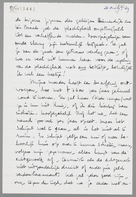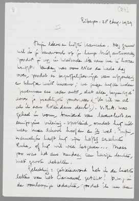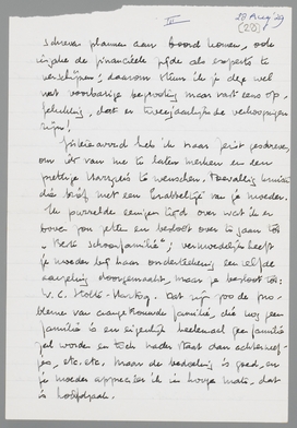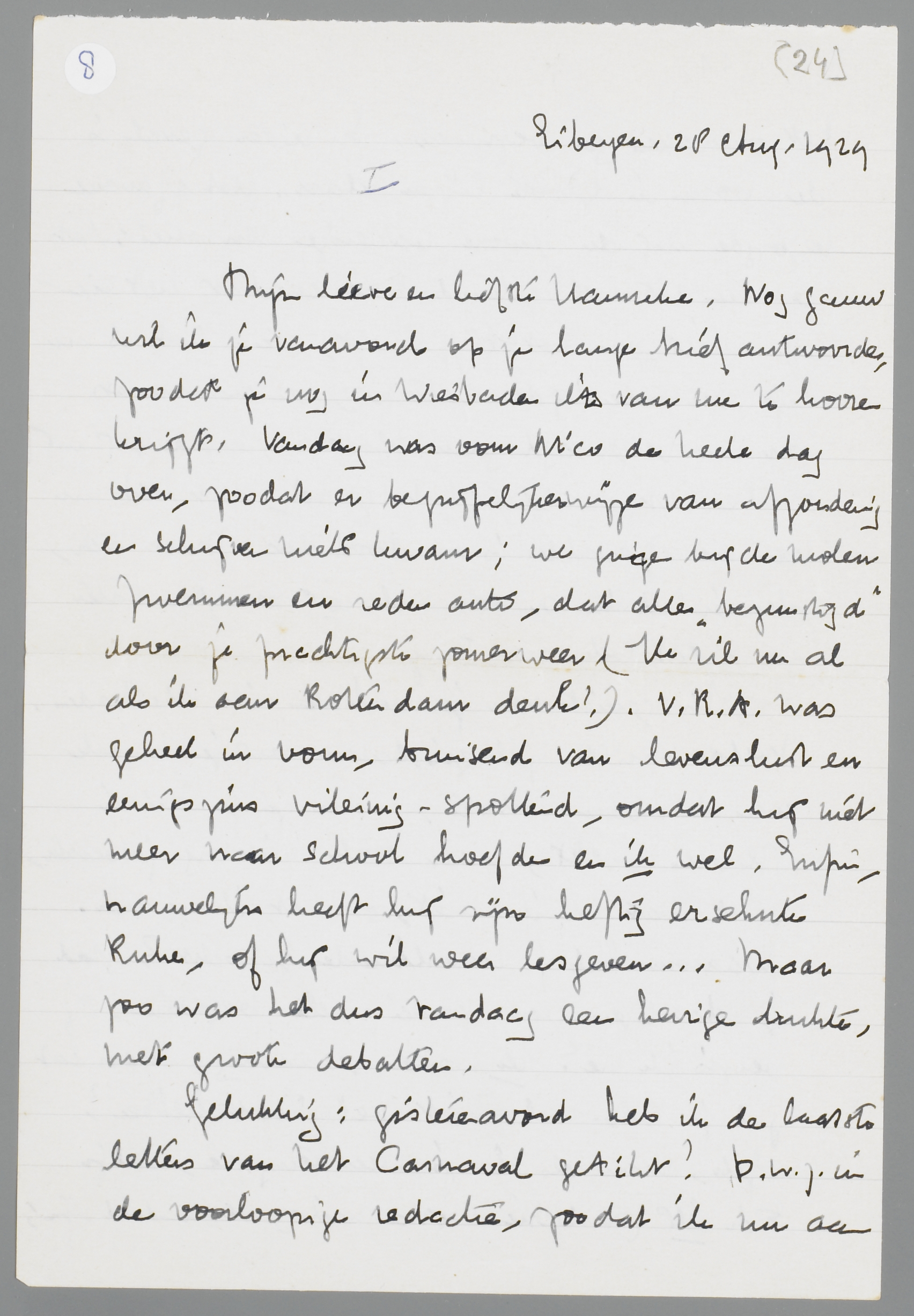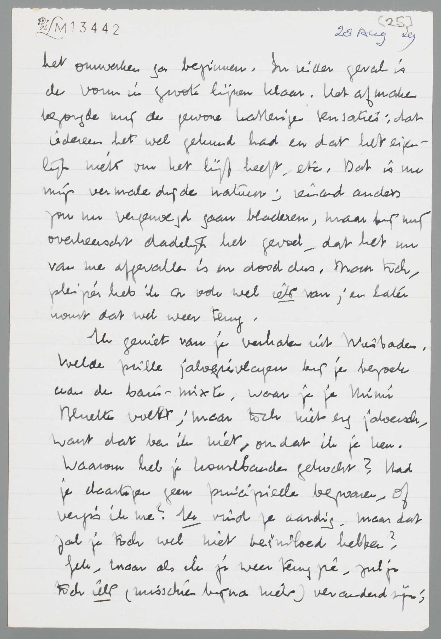 Ik geniet van je verhalen uit Wiesbaden. Voelde prille jaloezievlagen bij je bezoek aan de bain-mixte, waar je je Mimi Bluette voelt; maar toch niet erg jaloersch, want dat ben ik niet, omdat ik je ken. Waarom heb je kousebanden gekocht? Had je daartegen geen principieele bezwaren, of vergis ik me? Ik vind ze aardig, maar dat zal je toch wel niet beïnvloed hebben? Gek, maar als ik je weer terug zie, zul je toch iets (misschien bijna niets) veranderd zijn; niet alleen wat de kousebanden betreft. Ik verlang er naar, dat je weer hier bent en dat ik je een klein beetje kan plagen, heel prettig, anders niet.