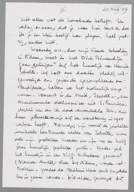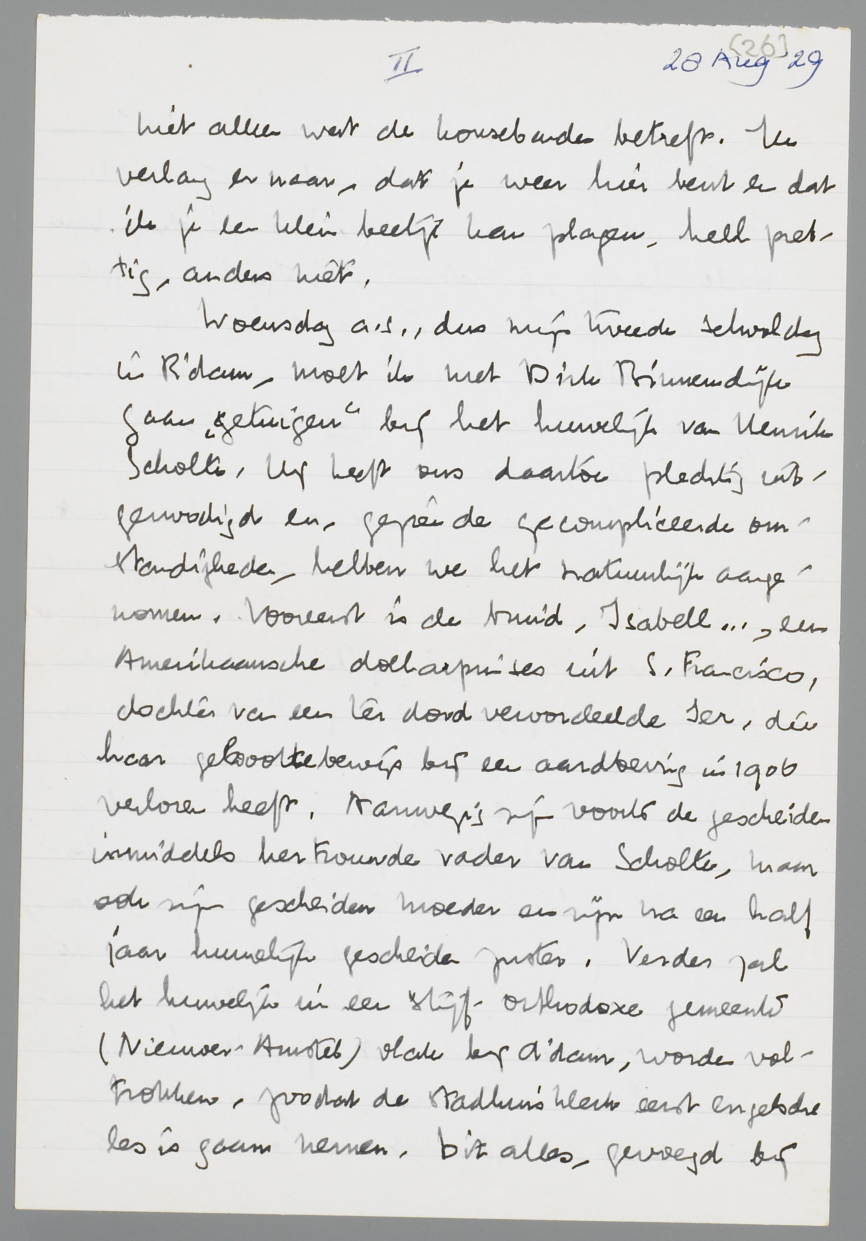 Woensdag a.s., dus mijn tweede schooldag in R'dam, moet ik met Dick Binnendijk gaan ‘getuigen’ bij het huwelijk van Henrik Scholte. Hij heeft ons daartoe plechtig uitgenoodigd en, gezien de gecompliceerde omstandigheden, hebben we het natuurlijk aangenomen. Vooreerst is de bruid, Isabell ..., een Amerikaansche dollarprinses uit S. Francisco, dochter van een ter dood veroordeelde Ier, die haar geboortebewijs bij een aardbeving in 1906 verloren heeft. Aanwezig zijn voorts de gescheiden inmiddels hertrouwde vader van Scholte, maar ook zijn gescheiden moeder en zijn na een half jaar huwelijk gescheiden zuster. Verder zal het huwelijk in een stijf-orthodoxe gemeente (Nieuwer-Amstel) vlak bij A'dam, worden voltrokken, zoodat de stadhuisklerk eerst engelsche les is gaan nemen. Dit alles, gevoegd bij de bizarre figuren der getuigen Binnendijk en ter Braak, zal de plechtigheid ongetwijfeld tot een verheffende maken. Voorspiegelingen van oude sherry zijn natuurlijk bijzaak. Ik zal je van de zaak een getrouw verslag geven; of we er veel uit kunnen leeren voor de regeling van de plechtigheid wat ons betreft, betwijfel ik wel een beetje!