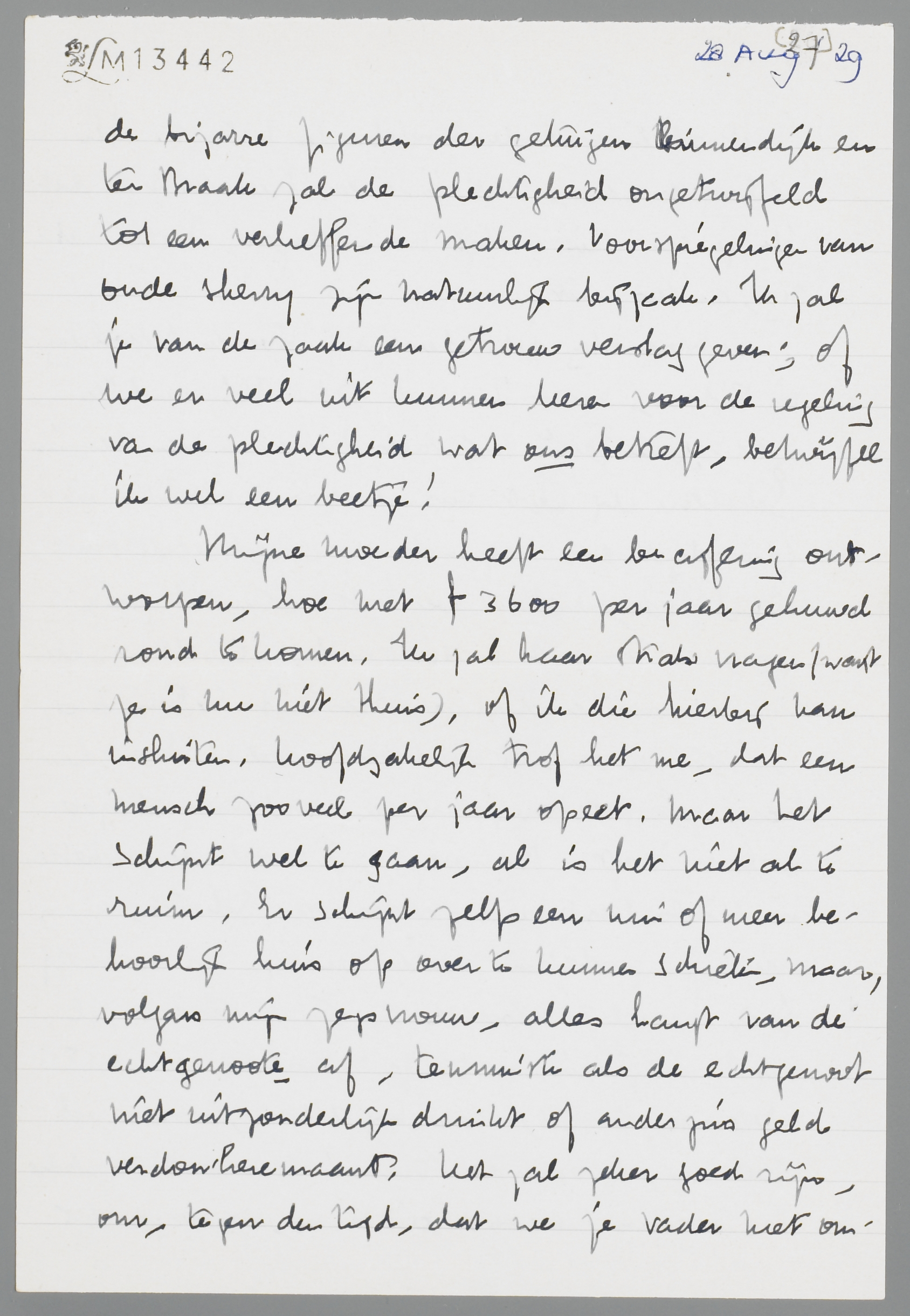 Mijne moeder heeft een becijfering ontworpen, hoe met ƒ3600 per jaar gehuwd rond te komen. Ik zal haar straks vragen (want ze is nu niet thuis), of ik die hierbij kan insluiten. Hoofdzakelijk trof het me, dat een mensch zooveel per jaar opeet. Maar het schijnt wel te gaan, al is het niet al te ruim. Er schijnt zelfs een min of meer behoorlijk huis op over te kunnen schieten, maar, volgens mijn zegsvrouw, alles hangt van de echtgenoote af, tenminste als de echtgenoot niet uitzonderlijk drinkt of anderzins geld verdonkeremaant. Het zal zeker goed zijn, om, tegen den tijd, dat we je vader met omschreven plannen aan boord komen, ook inzake de financieele zijde als experts te verschijnen; daarom stuur ik je deze wel wat voorbarige begrooting maar vast eens op. Gelukkig, dat er tweejaarlijksche verhoogingen zijn!
