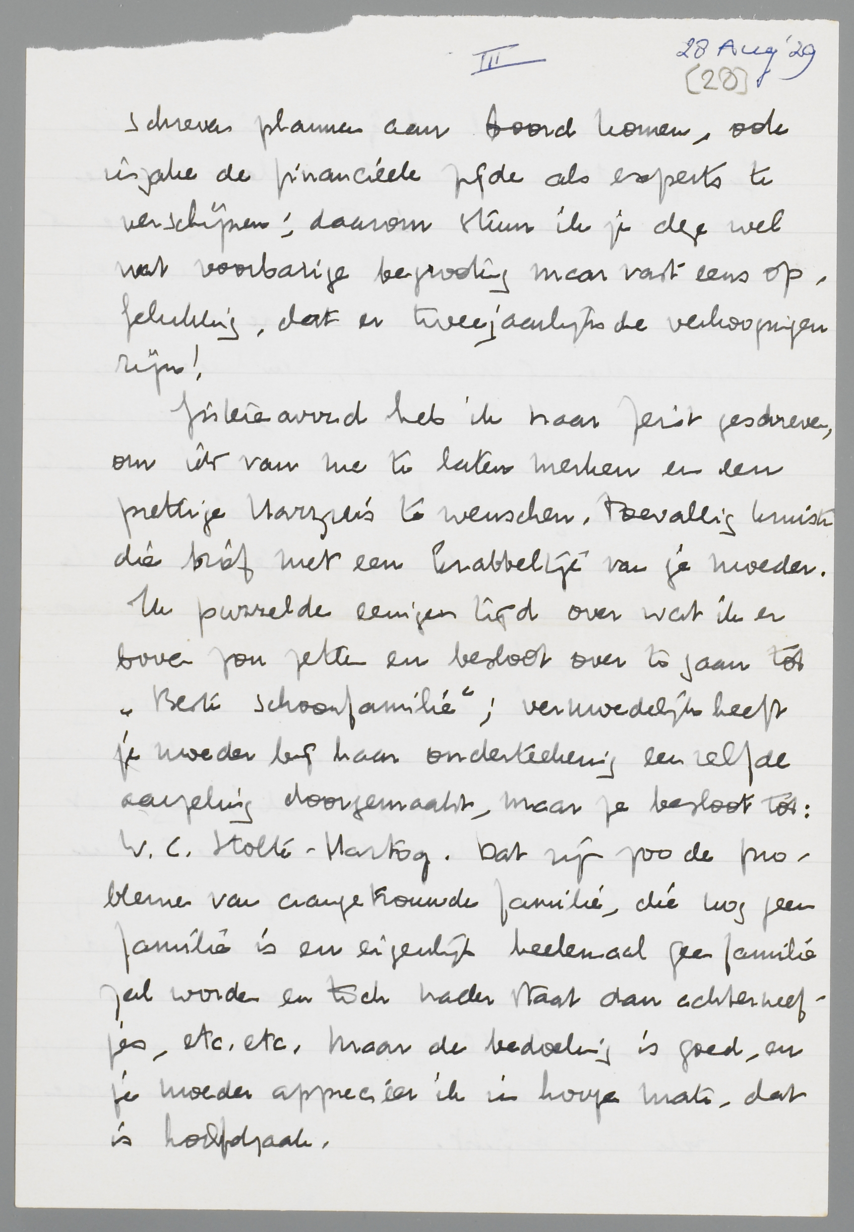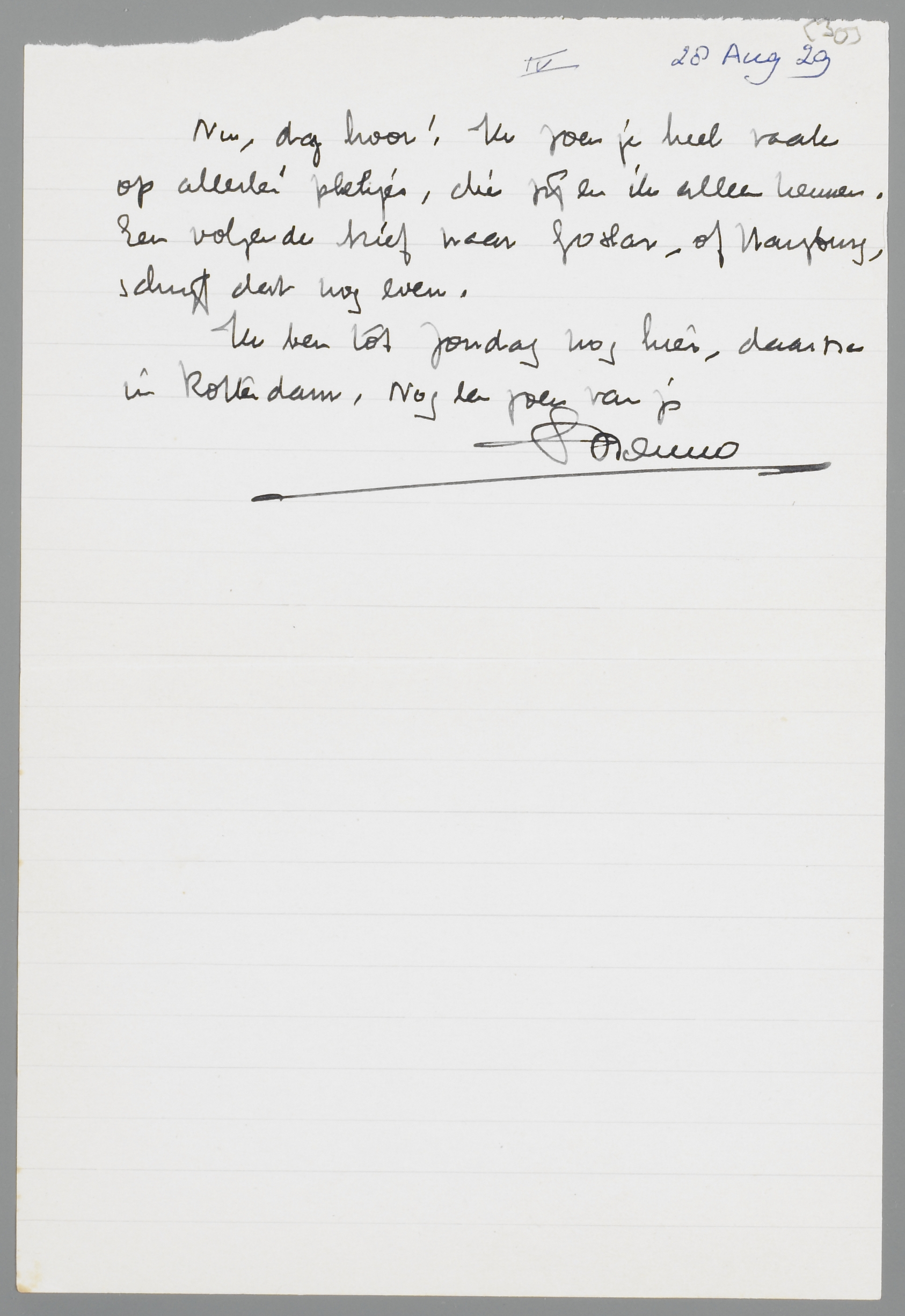 Nog gauw wil ik je vanavond op je lange brief antwoorden, zoodat je nog in Wiesbaden iets van me te hooren krijgt. Vandaag was oom Nico de heele dag over, zoodat er begrijpelijkerwijs van afzondering en schrijven niets kwam; we gingen bij de molen zwemmen en reden auto, dat alles ‘begunstigd’ door je prachtigste zomerweer. (Ik ril nu al als ik aan Rotterdam denk!) v.R.A. was geheel in vorm, bruisend van levenslust en eenigszins vileinig-spottend, omdat hij niet meer naar school hoefde en ik wel. Enfin, nauwelijks heeft hij zijn heftig ersehnte Ruhe, of hij wil weer lesgeven... Maar zoo was het dus vandaag een hevige drukte, met groote debatten.