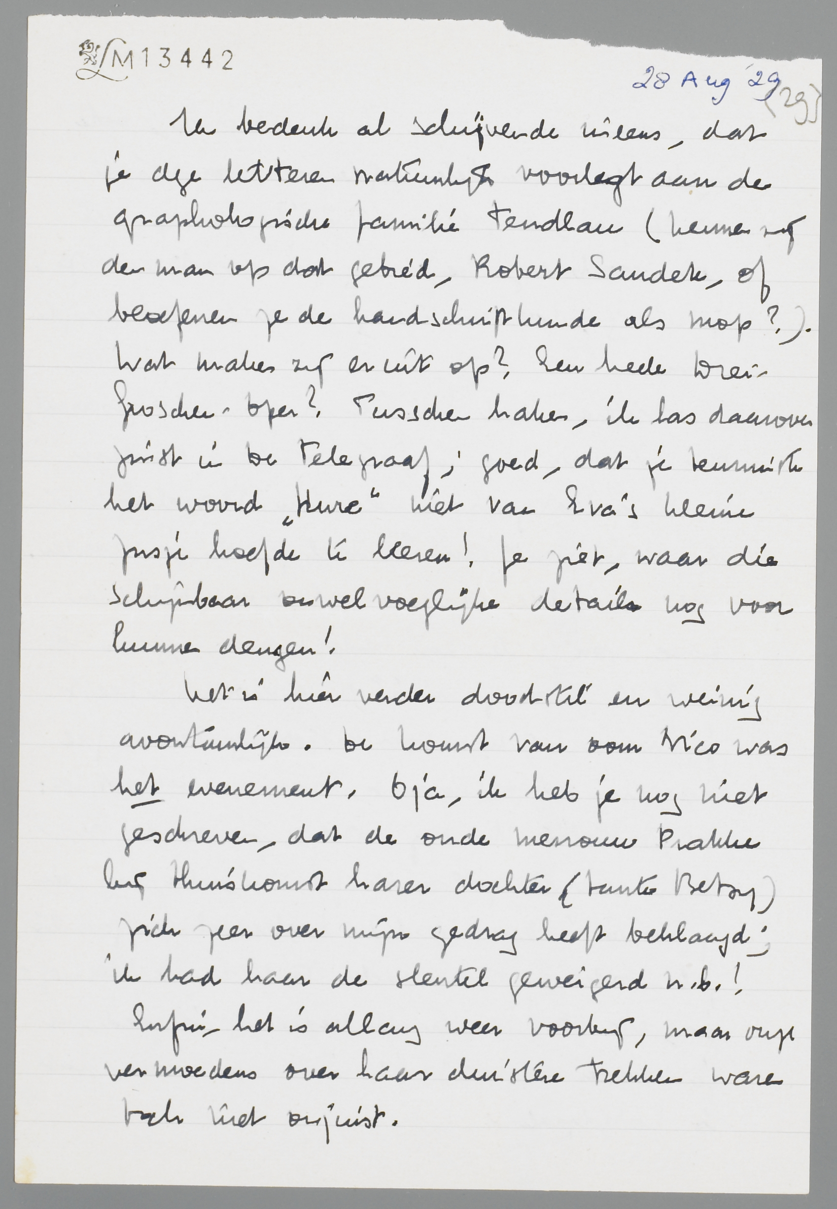 Ik bedenk al schrijvende ineens, dat je deze letteren natuurlijk voorlegt aan de graphologische familie Tendlau (kennen zij de man op dat gebied, Robert Saudek, of beoefenen ze de handschriftkunde als mop?). Wat maken zij er uit op? Een heele Drei-Groschen-Oper? Tusschen haken, ik las daarover juist in De Telegraaf; goed, dat je tenminste het woord ‘Hure’ niet van Eva's kleine zusje hoefde te leeren! Je ziet, waar die schijnbaar onwelvoeglijke details nog voor kunnen deugen!