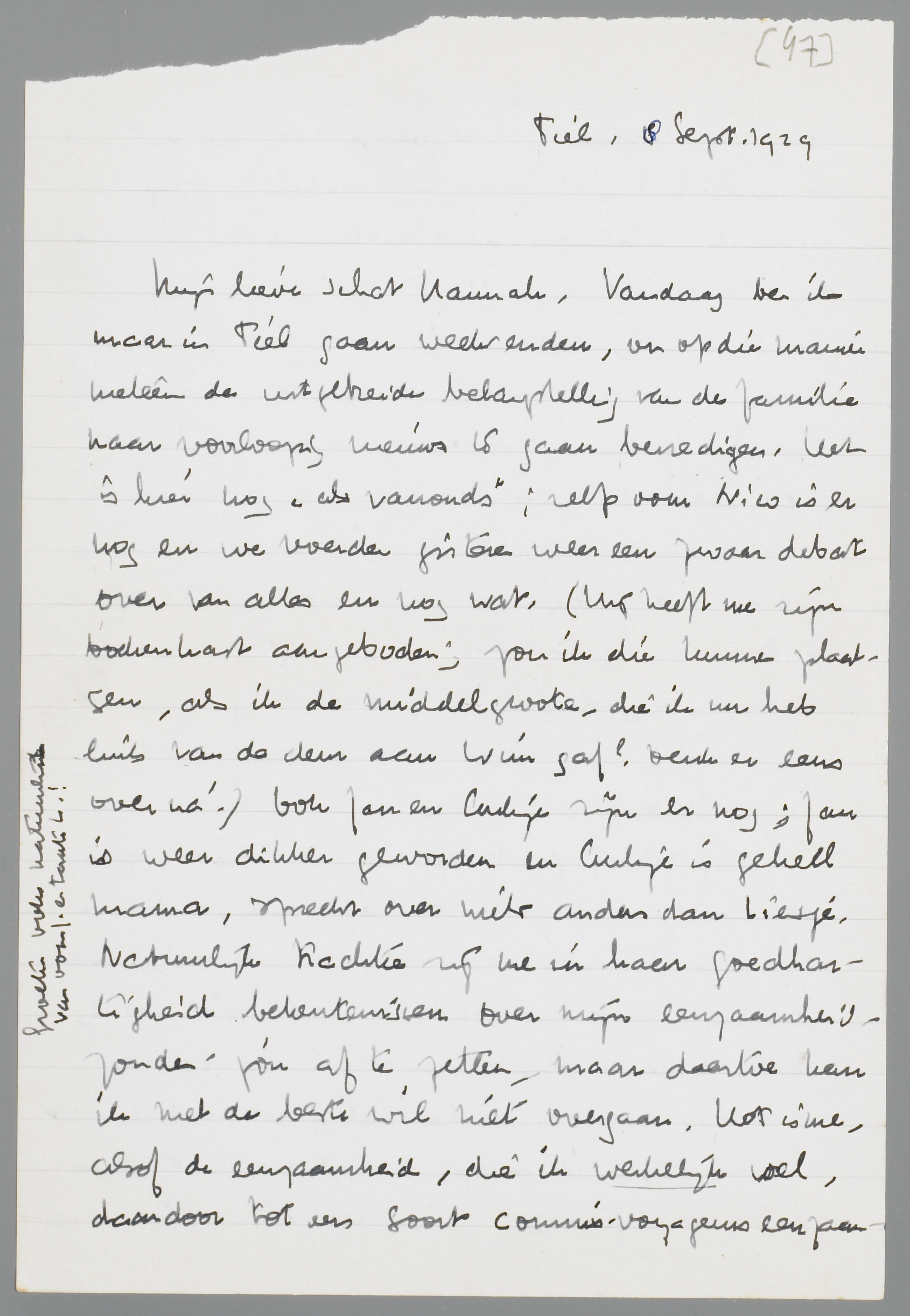 Vandaag ben ik maar in Tiel gaan weekenden, om op die manier meteen de uitgebreide belangstelling van de familie naar voorloopig nieuws te gaan bevredigen. Het is hier nog ‘als vanouds’; zelfs oom Nico is er nog en we voerden gisteren weer een zwaar debat over van alles en nog wat, (Hij heeft me zijn boekenkast aangeboden; zou ik die kunnen plaatsen, als ik de middelgroote - die ik nu heb links van de deur aan Wim gaf? Denk er eens over na!) Ook Jan en Aukje zijn er nog; Jan is weer dikker geworden en Aukje is geheel mama, spreekt over niets anders dan Liesje. Natuurlijk trachtte zij me in haar goedhartigheid bekentenissen over mijn eenzaamheid-zonder-jou af te zetten, maar daartoe kan ik met de beste wil niet overgaan. Het is me, alsof de eenzaamheid, die ik werkelijk voel, daardoor tot een soort commis-voyageurs eenzaamheid zou worden. Zoo zal ze dus van mij wel de indruk hebben gekregen, dat je afwezigheid eigenlijk wijst op hardvochtigheid bij jou en afgestomptheid bij mij; of zoo iets. Maar jij begrijpt wel, waarom ik er tegenover haar of Tante Lize geen groote verhalen over kan doen, hoe is je mis of waarom. Maar het is zoo goed bedoeld, en daarom erger ik me ondanks alles over mezelf, als ik niet als eenzame poseer! - Ze hadden een briefkaart van je en waren je daarvoor erg dankbaar. We maakten vanmorgen een autorit, waarbij ik oud-leerling Zondag passeerde, die luide teekenen van herkenning gaf. Ik ook natuurlijk!