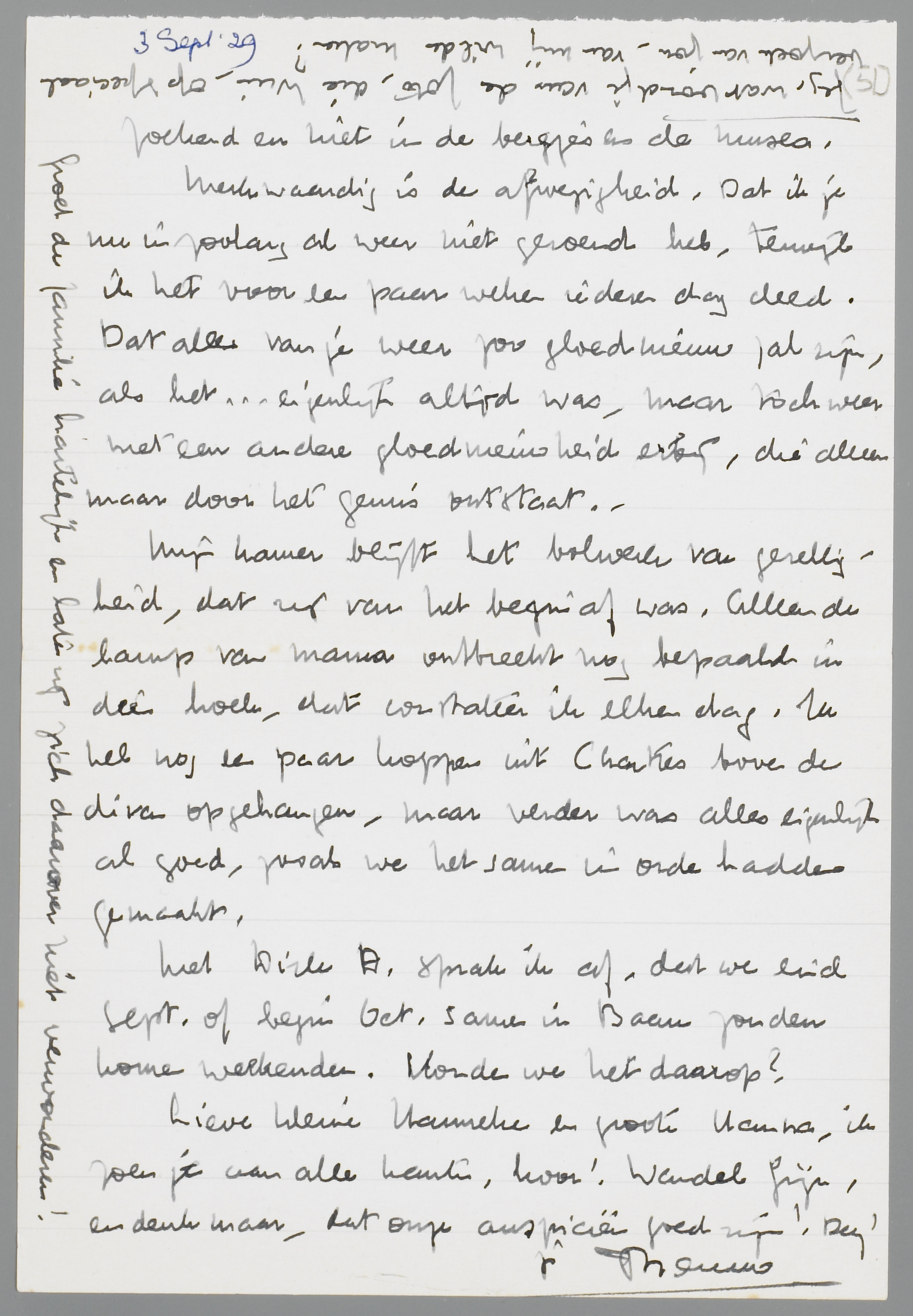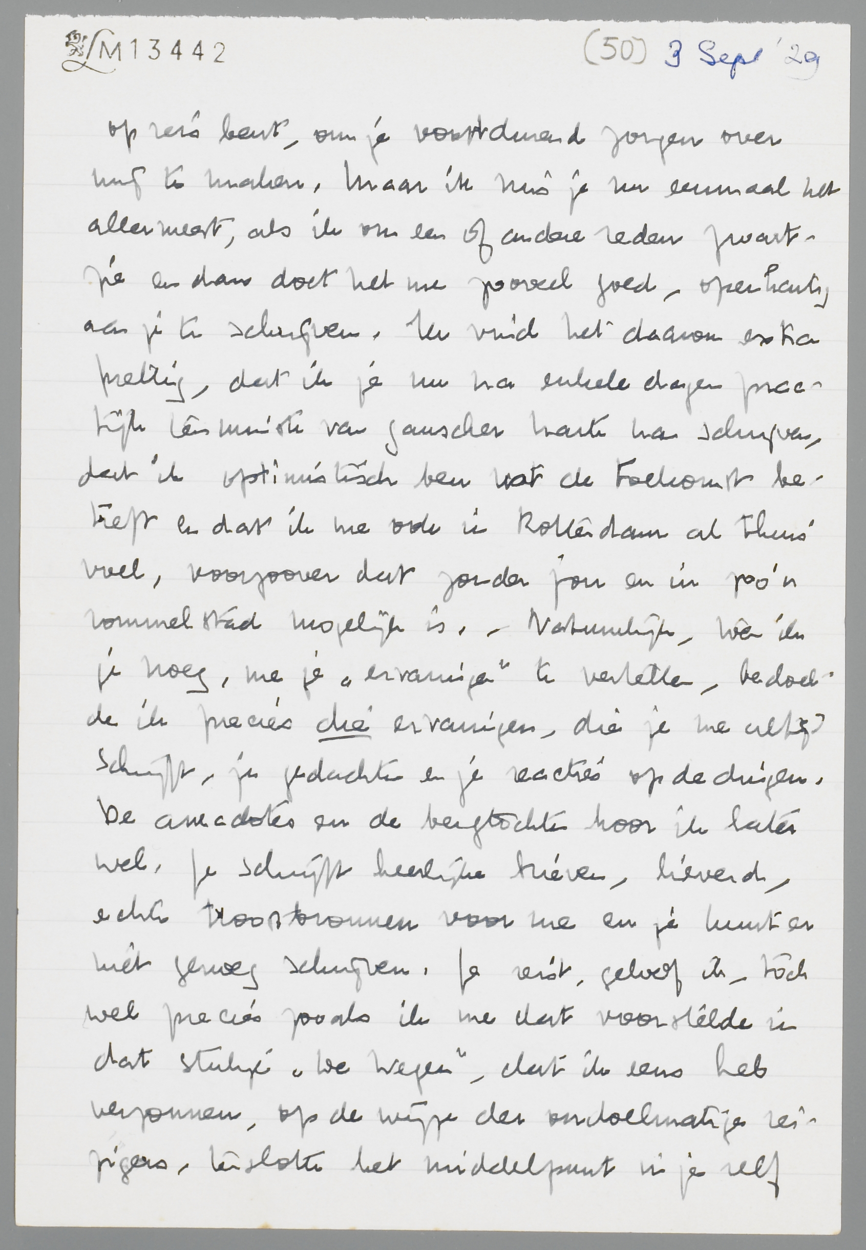 Ik heb me er na je eerste brief van 5 september wel een beetje een verwijt van gemaakt, dat ik al mijn voorbijgaande melancholieën maar jou klakkeloos aan je schreef, terwijl je toch niet op reis bent, om je voortdurend zorgen over mij te maken. Maar ik mis je nu eenmaal het allermeest, als ik om een of andere reden zwart zie en dan doet het me zooveel goed, openhartig aan je te schrijven. Ik vind het daarom extra onprettig, dat ik je nu na enkele dagen practijk tenminsten van ganscher harte kan schrijven, dat ik optimistisch ben wat de toekomst betreft en dat ik me ook in Rotterdam al thuis voel, voorzoover dat zonder jou en in zoo’n rommelstad mogelijk is. Natuurlijk, toen ik je vroeg, me je ‘ervaringen’ te vertellen, bedoelde ik precies die ervaringen, die je me altijd schrijft - je gedachten en je reacties op de dingen. De anecdotes en de bergtochten hoor ik later wel. Je schrijft heerlijke brieven, lieverd, echte troostbronnen voor me en je kunt er niet genoeg schrijven. Je reist, geloof ik, toch wel precies zooals ik me dat voorstelde in dat stukje ‘De Wegen’, dat ik eens heb verzonnen, op de wijze der ondoelmatige reizigers, tenslotte het middelpunt in je zelf zoekend en niet in de bergjes en de musea.