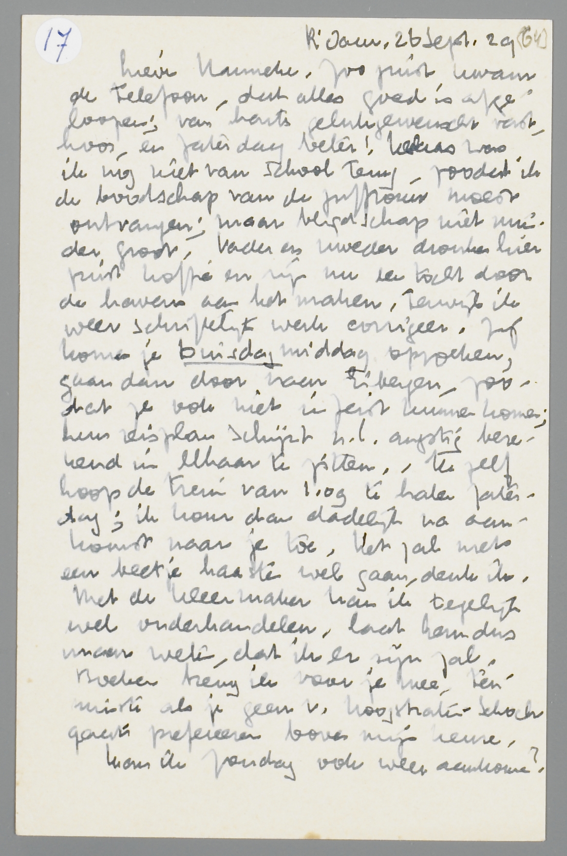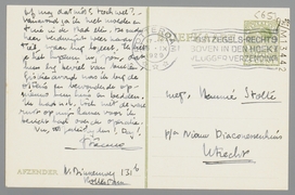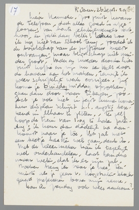 Zoo juist kwam de telefoon, dat alles goed is afgeloopen; van harte gelukgewenscht vast, hoor, en zaterdag beter! Helaas was ik nog niet van school terug, zoodat ik de boodschap van de juffrouw moest ontvangen; maar blijdschap niet minder groot. Vader en moeder dronken hier juist koffie en zijn nu een tocht door de havens aan het maken, terwijl ik weer schriftelijk werk corrigeer. Zij komen je Dinsdag middag opzoeken, gaan dan door naar Eibergen - zoodat ze ook niet in Zeist kunnen komen; hun reisplan schijnt n.l. angstig berekend in elkaar te zitten. Ik zelf hoop de trein van 1.09 te halen zaterdag; ik kom dan dadelijk na aankomst naar je toe. Het zal met een beetje haasten wel gaan, denk ik.