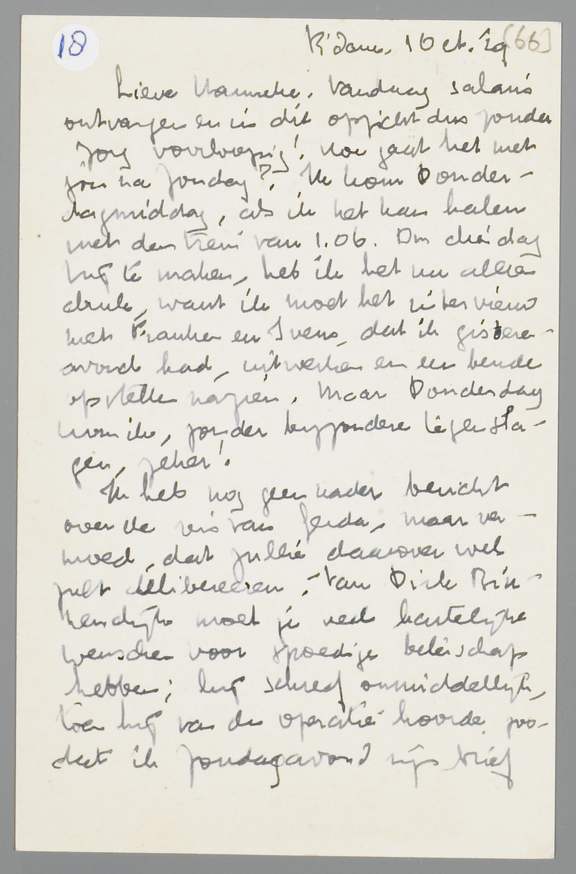 Ik heb nog geen nader bericht over de reis van Gerda, maar vermoed, dat jullie daarover wel zult delibereeren. Van Dirk Binnendijk moet je veel hartelijke wenschen voor spoedige beterschap hebben; hij schreef onmiddellijk, toen hij van de operatie hoorde zoodat ik zondagavond zijn brief hier vond.