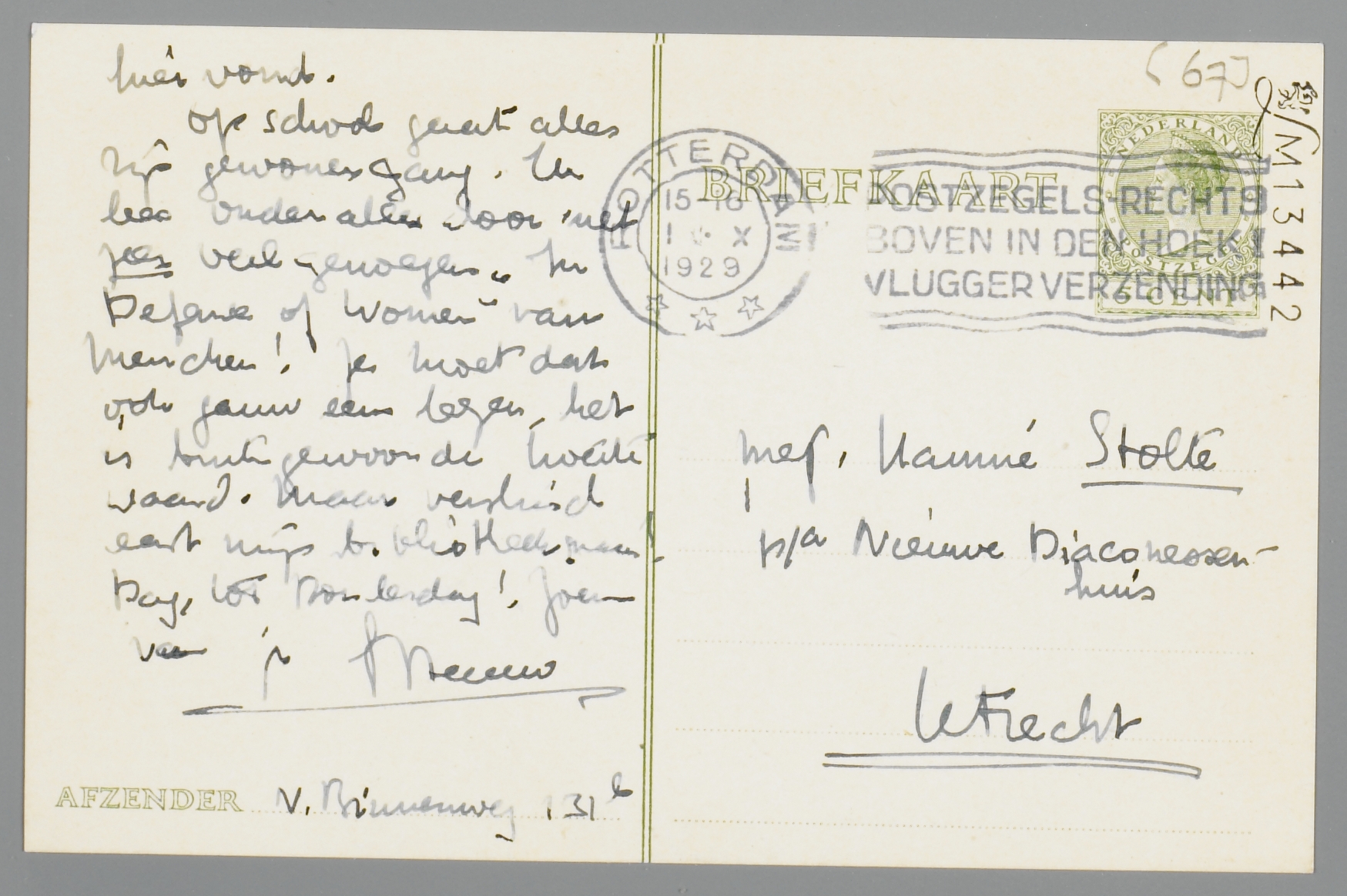 Vandaag salaris ontvangen en in dit opzicht dus zonder zorg voorloopig! Hoe gaat het met jou na zondag? Ik kom Donderdagmiddag, als ik het kan halen met den trein van 1.06. Om die dag vrij te maken, heb ik het nu alleen druk want ik moet het interview van Franken en Ivens, dat ik gisterenavond had, uitwerken en een bende opstellen nazien, maar Donderdag kom ik, zonder bijzondere tegenslagen, zeker!