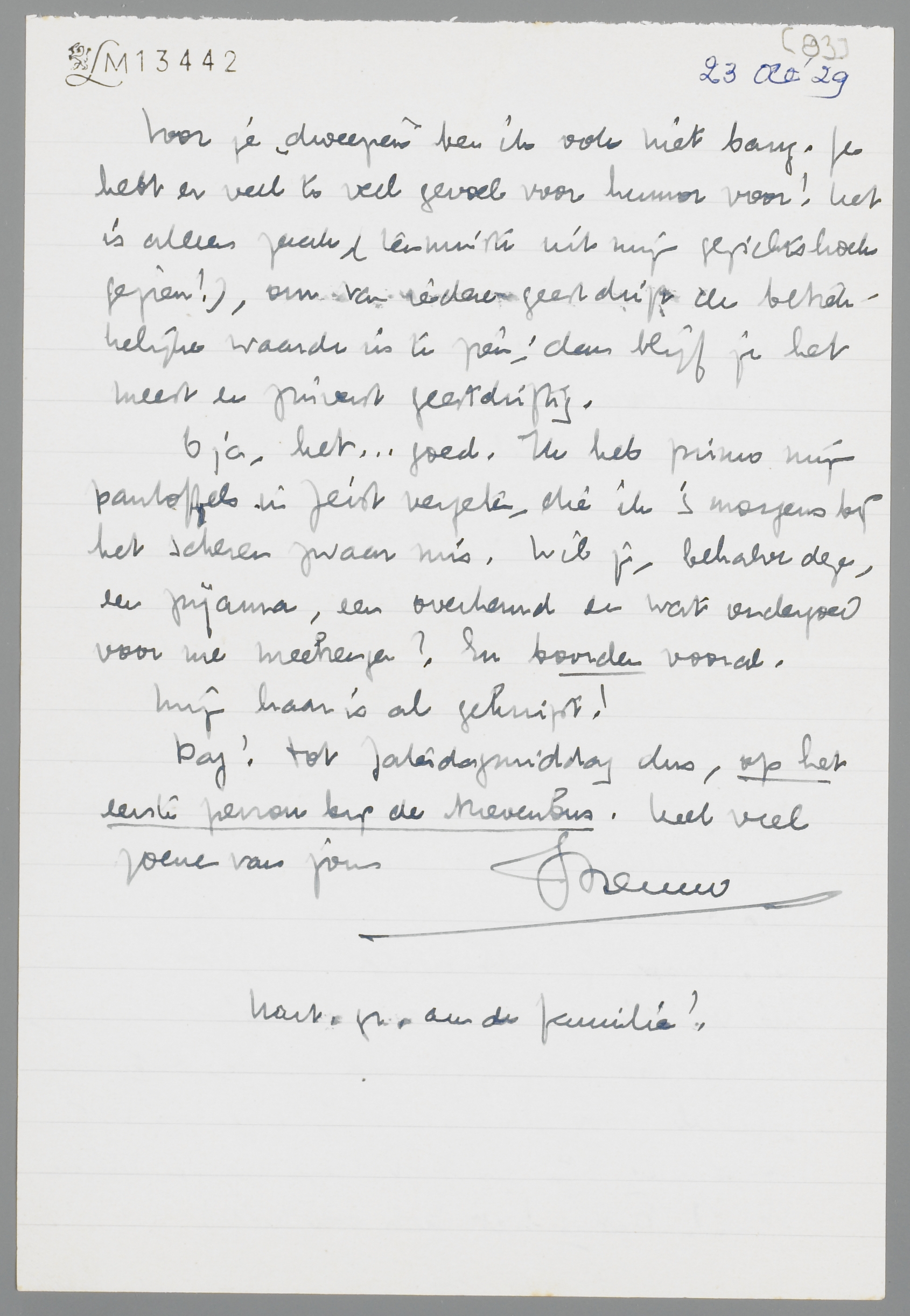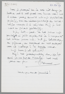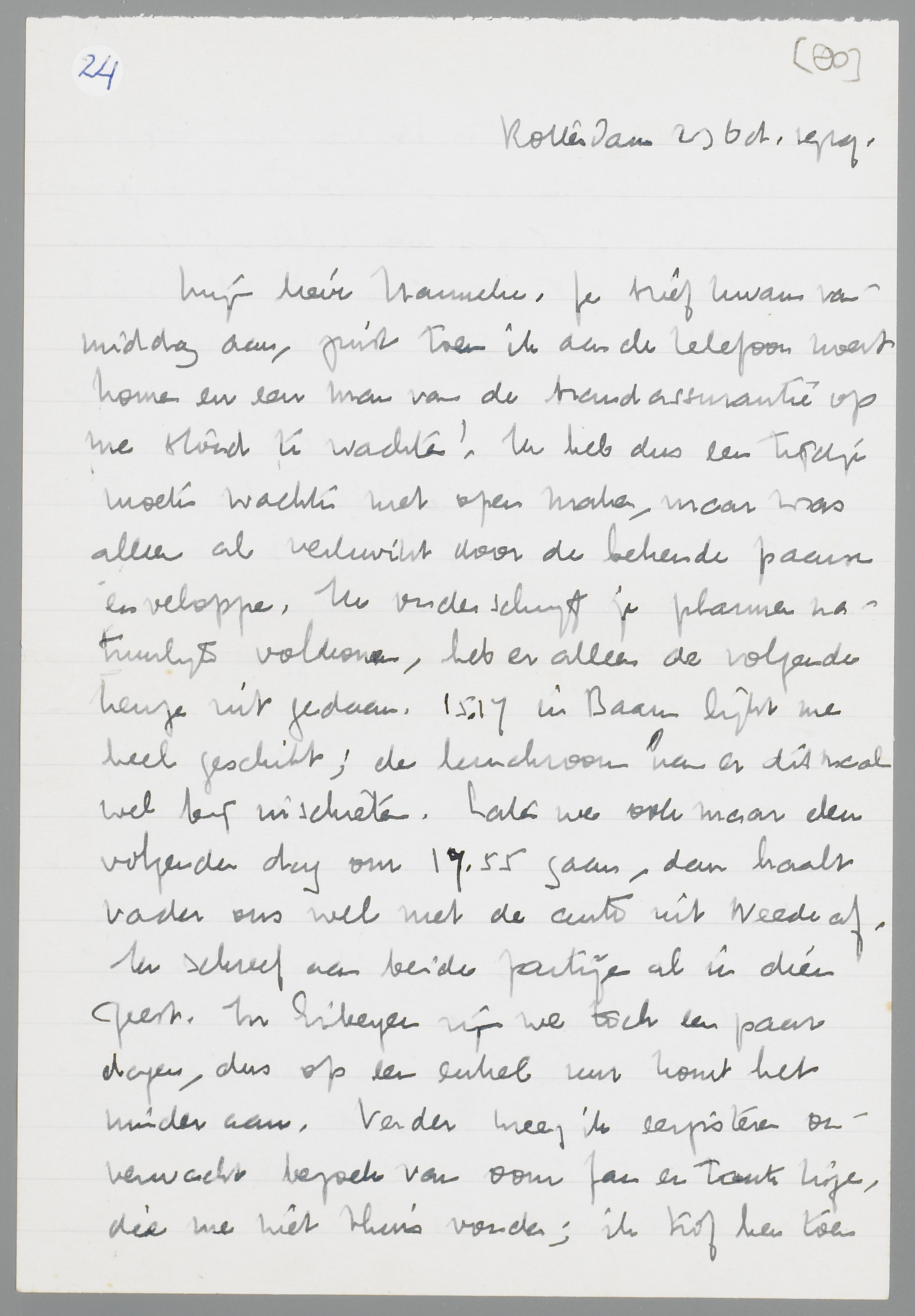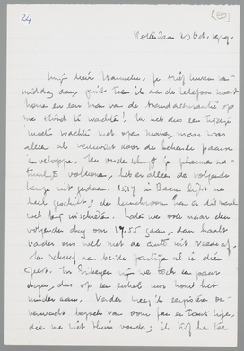 O ja, het ... goed. Ik heb primo mijn pantoffels in Zeist vergeten, die ik ‘s morgens bij het scheren zwaar mis. Wil je, behalve deze, een pyama, een overhemd en wat ondergoed voor me meebrengen? En boorden vooral.