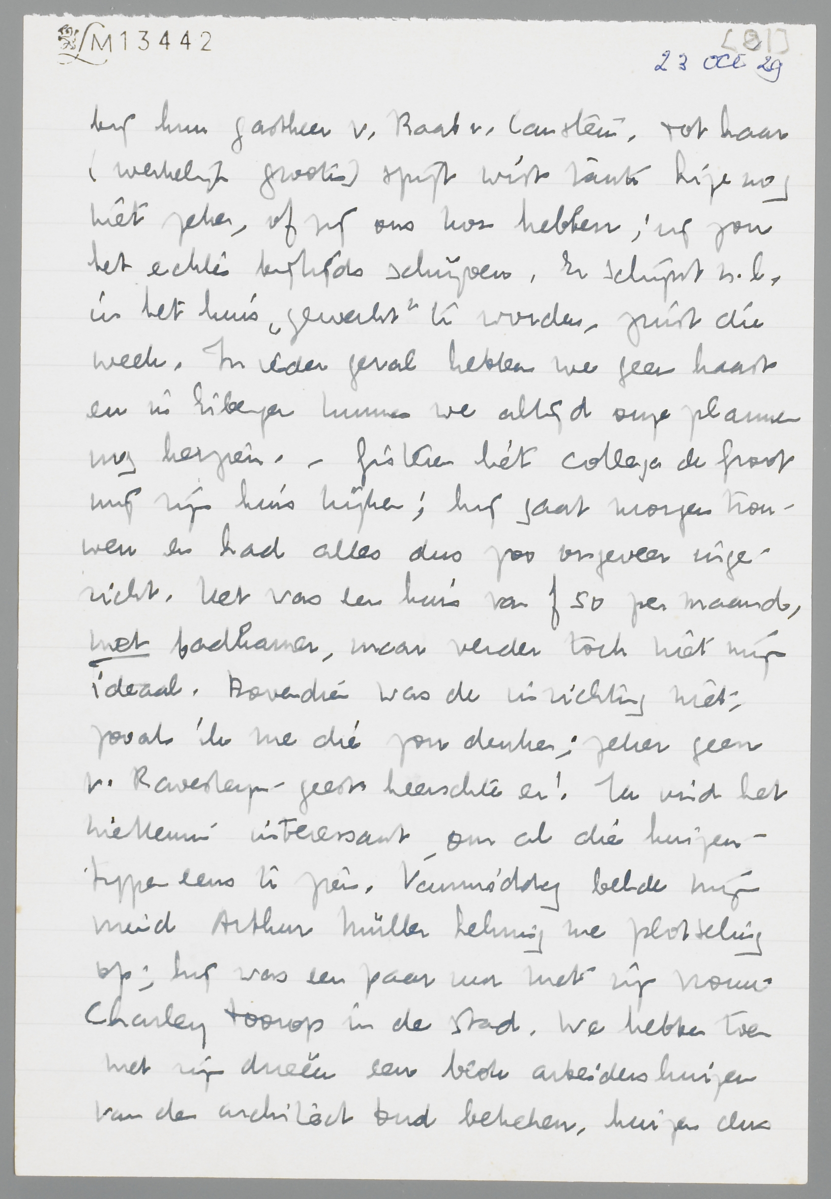 Ravensteyn-geest heerschte er! Ik vind het niettemin interessant om al die huizentypen eens te zien. Vanmiddag belde mijn vriend Arthur Müller Lehning me plotseling op; hij was een paar uur met zijn vrouw Charley Toorop in de stad. We hebben toen met zijn drieën een blok arbeidershuizen van de architect Oud bekeken, huizen dus van ± f 20 in de maand, werkelijk buitengewoon aardig, met leuke kleuren en veel licht, voor ons natuurlijk veel te klein, maar toch een model van goedkoope woningbouw, die aan alle eischen voldoet. Het is een heel dorp bij Rotterdam, merkwaardig en mooi als geheel ook. Maar in de enkele huizen, die al bewoond waren, prijkten al weer de afzichtelijke Trijpen meubelen c.s.!