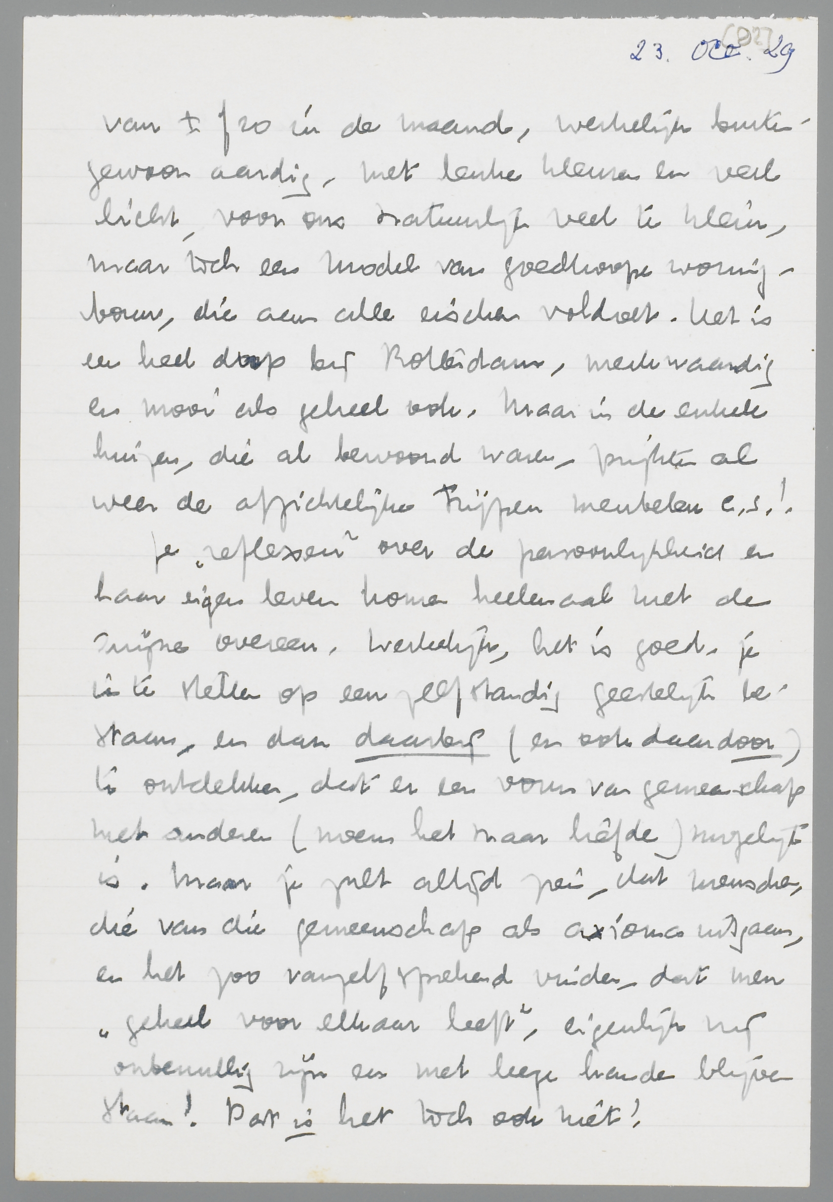Je ‘reflexen’ over de persoonlijkheid en haar eigen leven komen heelemaal met de mijne overeen. Werkelijk, het is goed je in te stellen op een zelfstandig geestelijk bestaan, en dan daarbij (en ook daardoor) te ontdekken, dat er een vorm van gemeenschap met anderen (noem het maar liefde) mogelijk is. Maar je zult altijd zien, dat menschen, die van die gemeenschap als axioma uitgaan, en het zoo vanzelfsprekend vinden, dat men ‘geheel voor elkaar leeft’, eigenlijk vrij onbenullig zijn en met leege handen blijven staan! Dat is het toch ook niet!