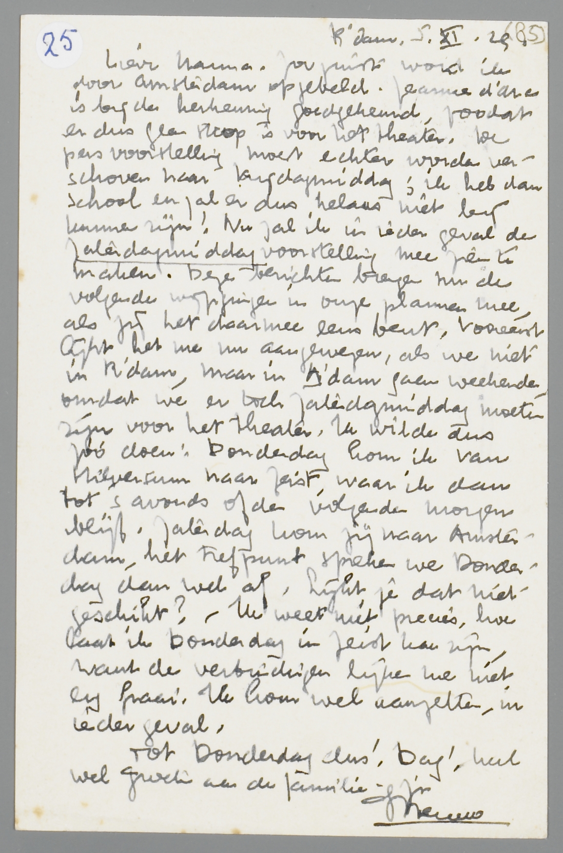 Zoo juist wordt ik door Amsterdam opgebeld. Jeanne d’Arc is bij de herkeuring goedgekeurd, zoodat er dus geen strop is voor het theater. De persvoorstelling moest echter worden verschoven naar Vrijdagmiddag, ik heb dan school en zal er dus helaas niet bij kunnen zijn! Nu zal ik in ieder geval de zaterdagmiddag voorstelling mee zien te maken. Deze berichten brengen nu de volgende wijzigingen in onze plannen mee, als jij het daarmee eens bent. Vooreerst lijkt het me nu aangewezen, als we niet in R'dam, maar in A’dam gaan weekenden omdat we er toch Zaterdagmiddag moeten zijn voor het theater. Ik wilde dus zoo doen: Donderdag kom ik van Hilversum naar Zeist, waar ik dan tot ‘s avonds of de volgende morgen blijf. Zaterdag kom jij naar Amsterdam, het trefpunt spreken we Donderdag dan wel af. Lijkt je dat niet geschikt? Ik weet niet precies, hoe laat ik Donderdag in Zeist kan zijn, want de verbindingen lijken me niet erg fraai. Ik kom wel aanzetten, in ieder geval,