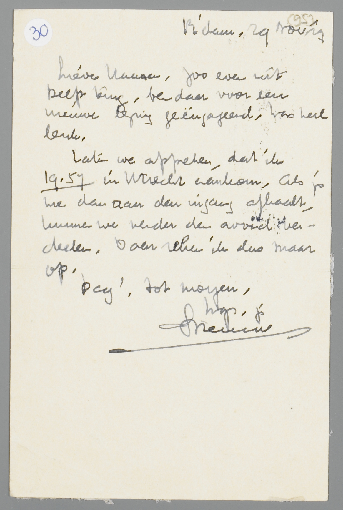 Zoo even uit Delft terug. Ben daar voor een nieuwe lezing geëngageerd. Was heel leuk. Laten we afspreken, dat ik 19.57 in Utrecht aankom. Als je me dan aan den ingang afhaalt, kunnen we verder de avond verdeelen. Daar reken ik dus maar op.