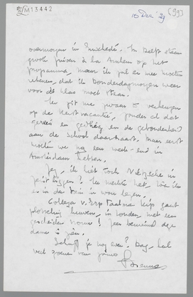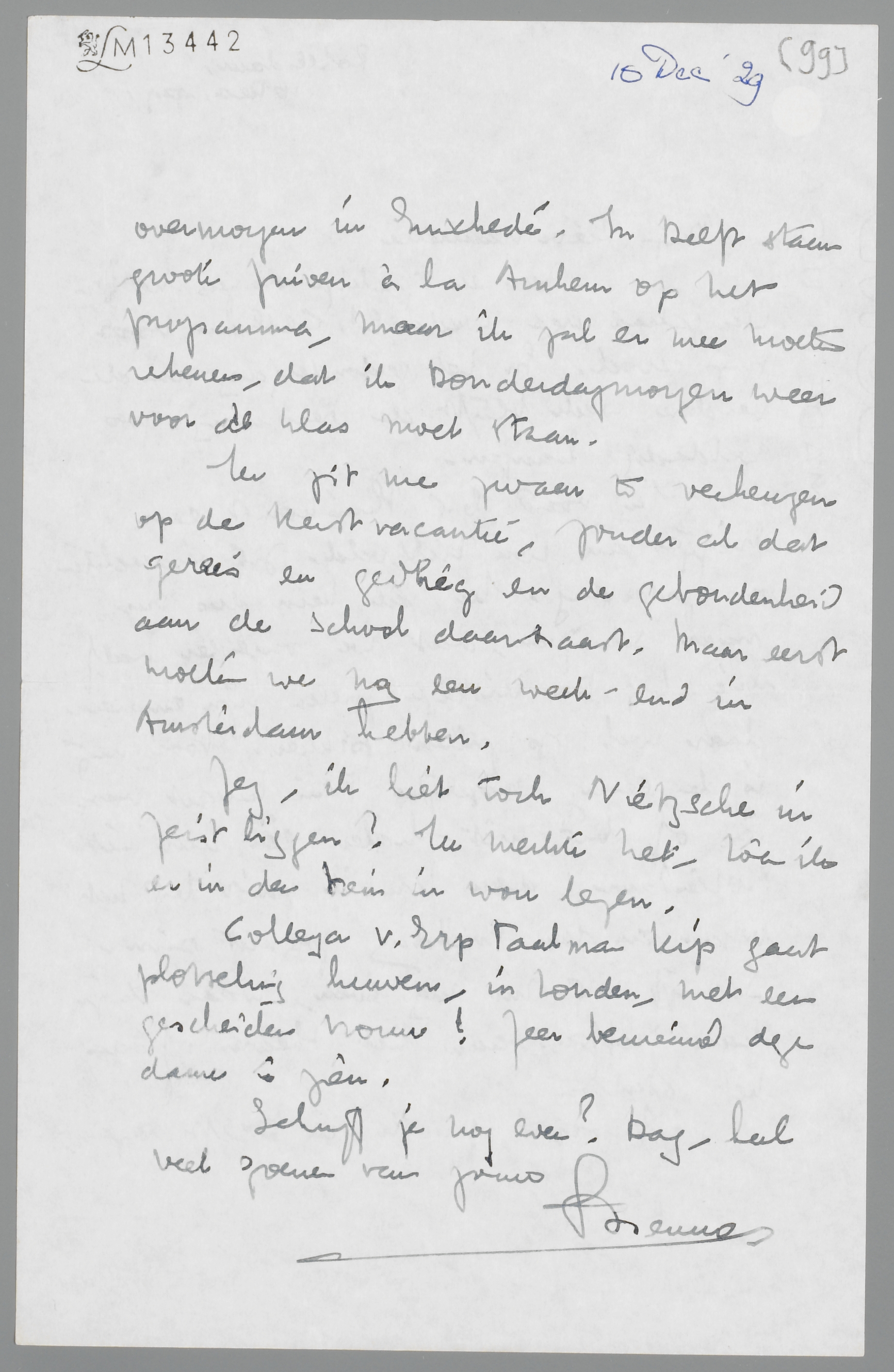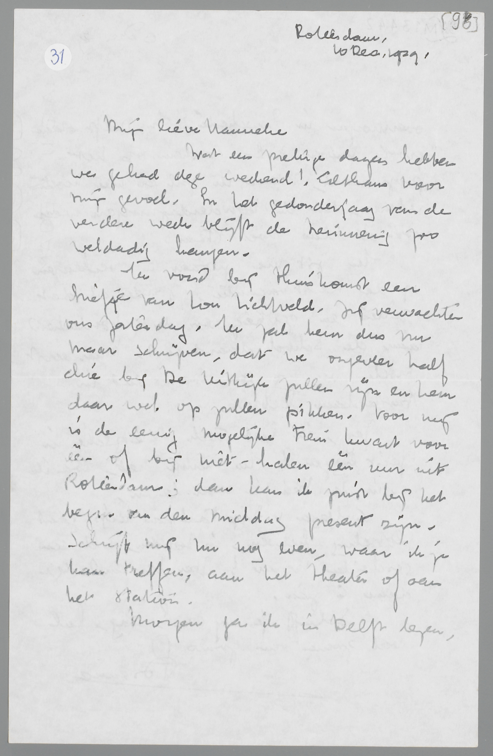 Ik vond bij thuiskomst een briefje van Lou Lichtveld. Zij verwachten ons Zaterdag. Ik zal hem dus nu maar schrijven, dat we ongeveer half drie bij De Uitkijk zullen zijn en hem daar wel op zullen pikken. Voor mij is de eenig mogelijke trein kwart voor één of bij niet-halen één uur uit Rotterdam; dan kan ik juist bij het begin van den middag present zijn. Schrijf mij nu nog even, waar ik je kan treffen, aan het theater of aan het station.