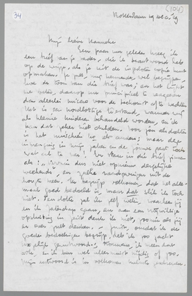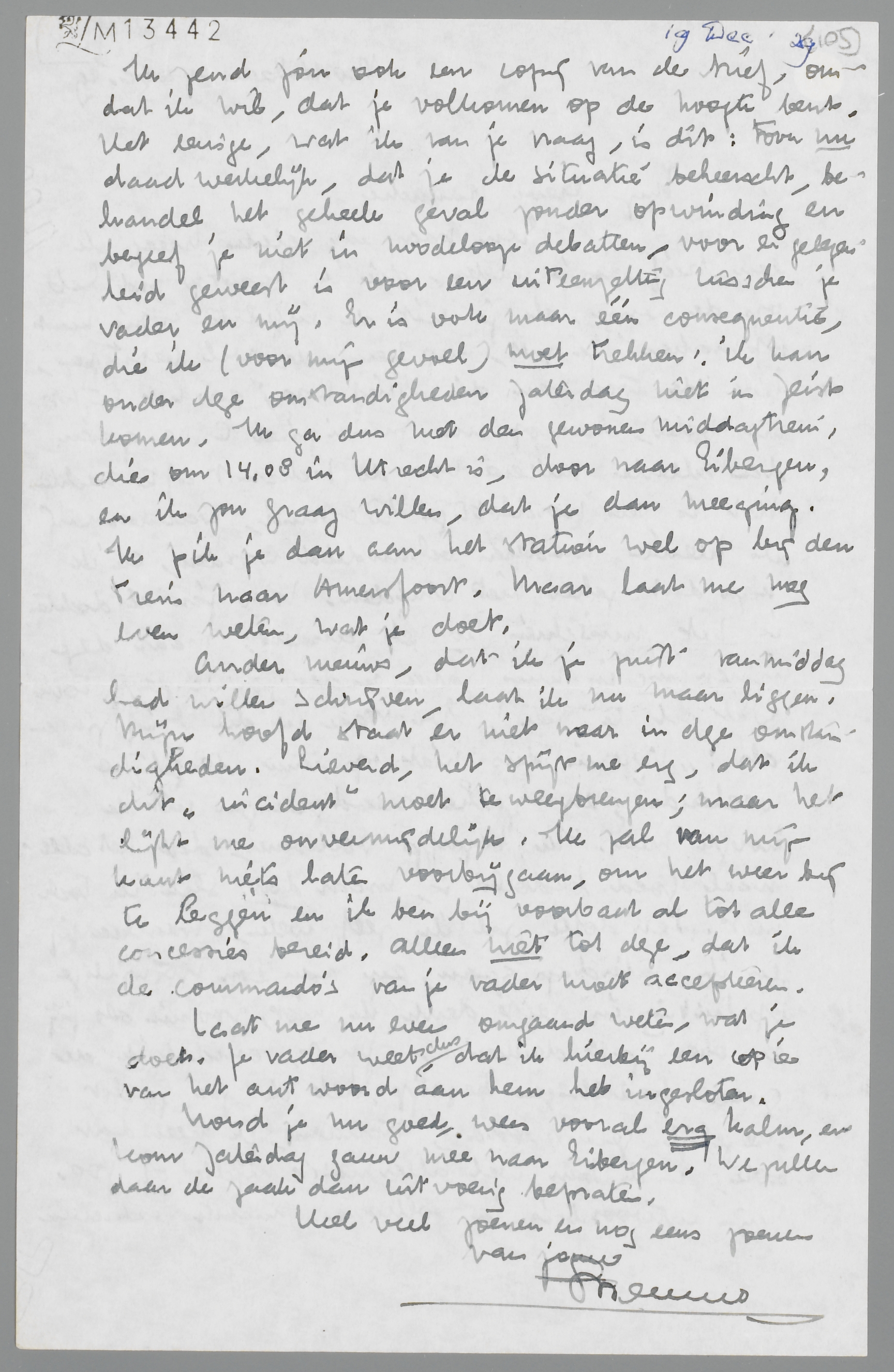 Een paar uur geleden kreeg ik een brief van je vader, die ik beantwoord heb op de wijze, als je uit de ingesloten copie kunt opmaken. Je zult, mij kennende, wel begrijpen, hoe de toon van die brief was; en het lijkt me beter, daarop nu principieel te reageeren dan allerlei misere voor de toekomst af te wachten. Het is een noodlottige toestand, wanneer wij als kleine kinderen behandeld worden, en ik kan dat zeker niet dulden. Voor jou als dochter is het misschien nog iets anders; maar deze inmenging in mijn zaken en de jouwe gaat toch wat al te ver! Er staan in die brief zinnen als: ‘verzin dus niet opnieuw dergelijke weekends’, en zulke raadgevingen uit de hoogte meer. Ik begrijp volkomen, dat het allemaal goed bedoeld is, maar dat slik ik toch niet. Tenslotte zal ik zelf weten, waarheen jij en ik Zaterdag gaan, en aan een vrijwillige opsluiting in Zeist denk ik niet, zoomin als jij er over zult denken. Juist, omdat ik de goede bedoelingen begrijp, heb ik zoo zacht mogelijk geantwoord; trouwens, ik meen dat ook, en ik ben wel allerminst nijdig of zoo. Mijn antwoord is in volkomen kalmte geschreven. Ik zend jou ook een copie van de brief omdat ik wil, dat je volkomen op de hoogte bent. Het eenige, wat ik van je vraag, is dit: toon nu daadwerkelijk, dat je de situatie beheerscht, behandel het geheele geval zonder opwinding en begeef je niet in noodelooze debatten, voor er gelegenheid geweest is voor een uiteenzetting tusschen je vader en mij. Er is ook maar één consequentie, die ik (voor mijn gevoel, moet trekken; ik kan onder deze omstandigheden Zaterdag niet in Zeist komen. Ik ga dus met den gewonen middagtrein, die om 14.08 in Utrecht is, door naar Eibergen, en ik zou graag willen, dat je dan meeging. Ik pik je dan aan het station wel op bij den trein naar Amersfoort. Maar laat me nog even weten, wat je doet.