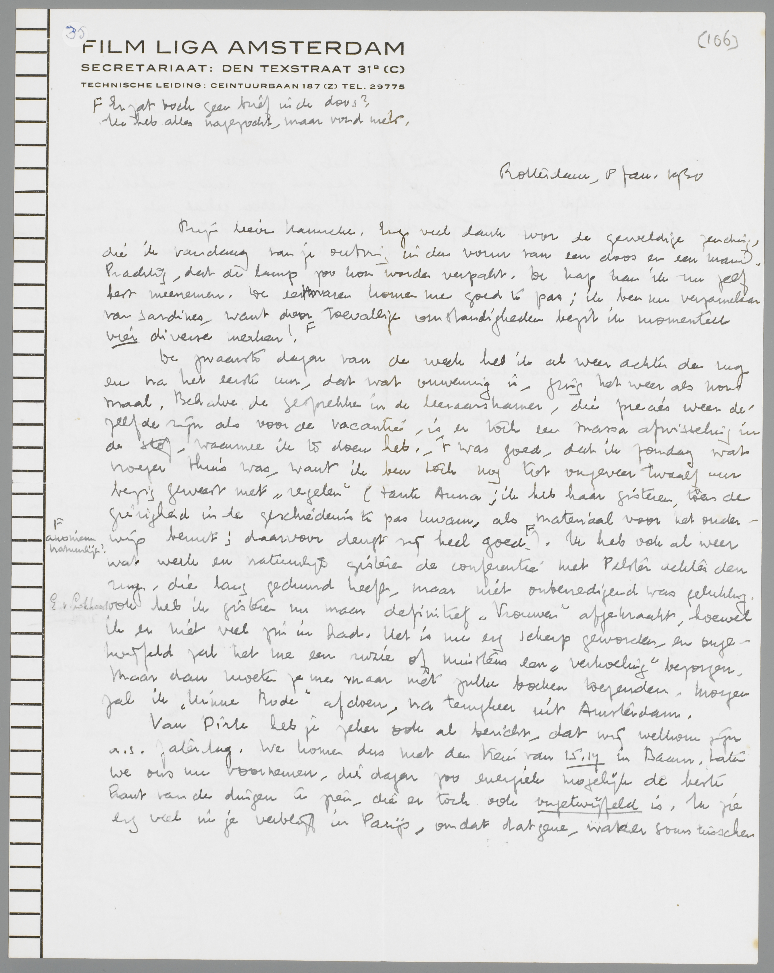 De zwaarste dagen van de week heb ik al weer achter den rug en na het eerste uur, dat wat onwennig is, ging het weer als normaal. Behalve de gesprekken in de leeraarskamer, die precies weer dezelfde zijn als voor de vacantie, is er toch een massa afwisseling van de stof, waarmee ik te doen heb. Het was goed, dat ik zondag wat vroeger thuis was, want ik ben toch nog tot ongeveer twaalf uur bezig geweest met ‘regelen’ (tante Anna; ik heb haar gisteren, toen de gierigheid in de geschiedenis te pas kwam, als materiaal voor het onderwijs benut; daarvoor deugt zij heel goed, anoniem natuurlijk!). Ik heb ook al weer wat werk en natuurlijk gisteren de conferentie met Pelster achter den rug, die lang geduurd heeft, maar niet onbevredigend was gelukkig. ook heb ik gisteren nu maar definitief ‘Vrouwen’ afgekraakt, hoewel ik er niet veel zin in had. Het is nu erg scherp geworden, en ongetwijfeld zal het me een ruzie of minstens een ‘verkoeling’ bezorgen, maar dan moeten ze me maar niet zulke boeken toezenden. Morgen zal ik ‘Hinne Rode’ afdoen, na terugkeer uit Amsterdam.