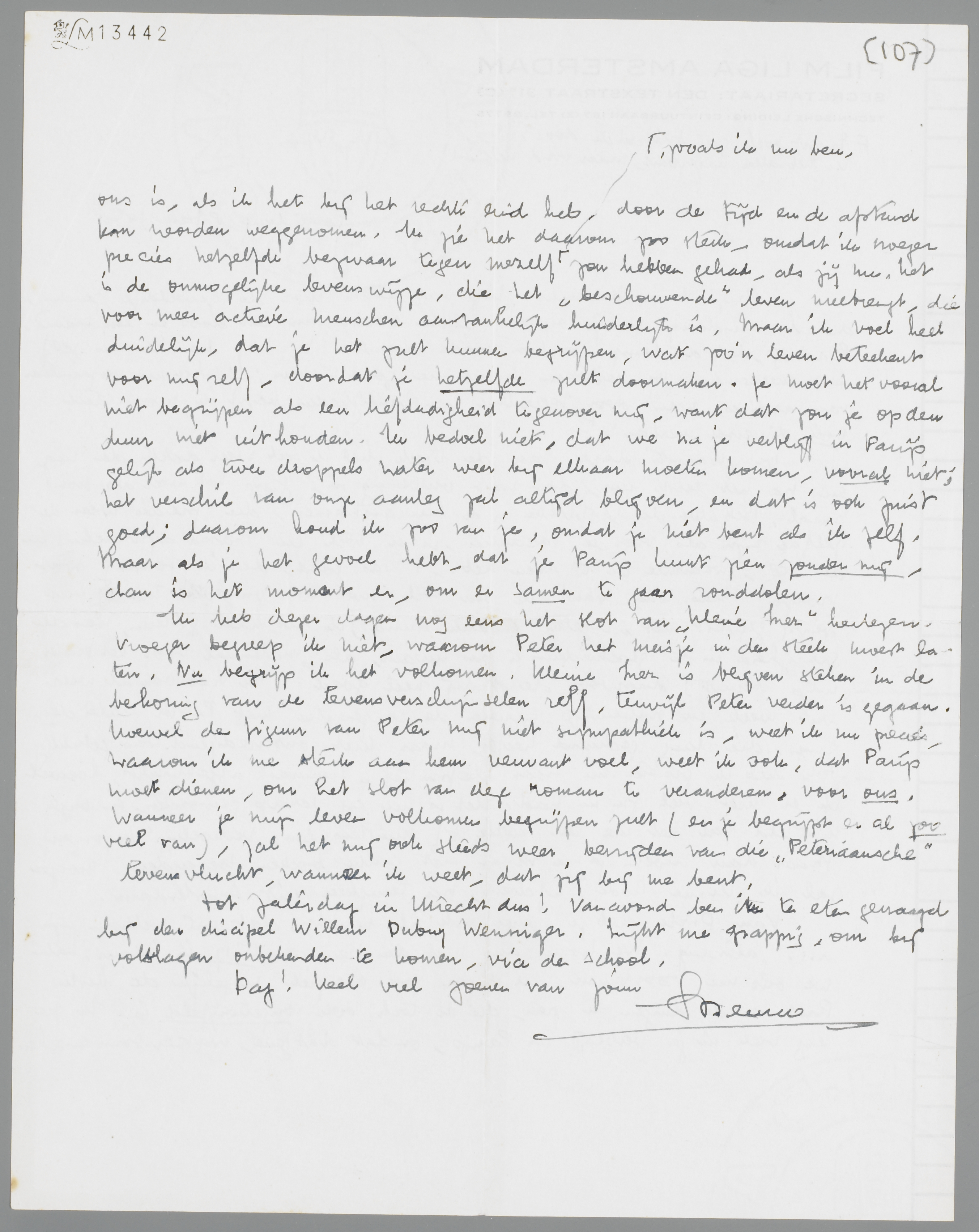 Ik heb dezer dagen nog eens het slot van ‘Kleine Inez’ herlezen. Vroeger begreep ik niet, waarom Peter het meisje in den steek moest laten. Nu begrijp ik het volkomen. Kleine Inez is blijven steken in de bekoring van de levensverschijnselen zelf, terwijl Peter verder is gegaan. Hoewel de figuur van Peter mij niet sympathiek is, weet ik nu precies waarom ik me sterk aan hem verwant voel, weet ik ook, dat Parijs moet dienen, om het slot van deze roman te veranderen, voor ons. Wanneer je mijn leven volkomen begrijpen zult (en je begrijpt er al zoo veel van), zal het mij ook steeds weer bevrijden van die ‘Peteriaansche’ levensvlucht, wanneer ik weet, dat jij bij me bent.