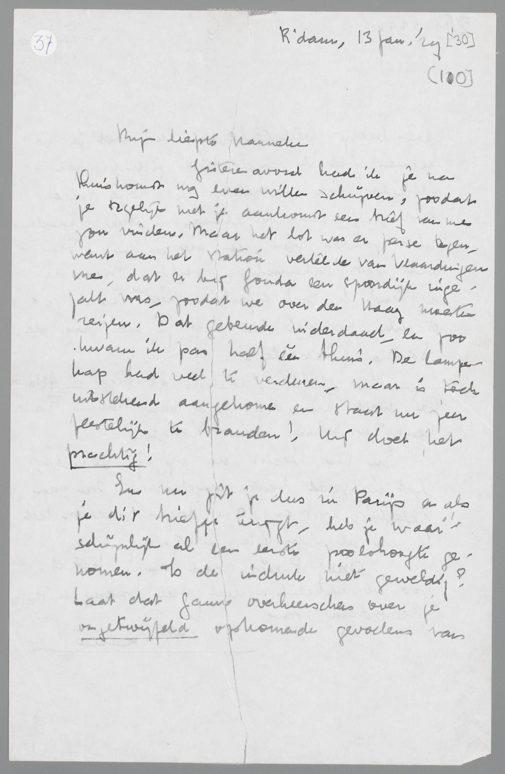 Gisterenavond had ik je na thuiskomst nog even willen schrijven, zoodat je tegelijk met je aankomst een brief van me zou vinden, maar het lot was er perse tegen, want aan het station vertelde van Vlaardingen me, dat er bij Gouda een spoordijk ingezakt was, zoodat we over Den Haag moesten reizen. Dat gebeurde inderdaad, en zoo kwam ik pas half één thuis. De lampenkap had veel te verduren, maar is toch uitstekend aangekomen en staat nu zeer feestelijk te branden! Hij doet het prachtig!