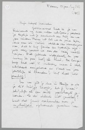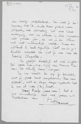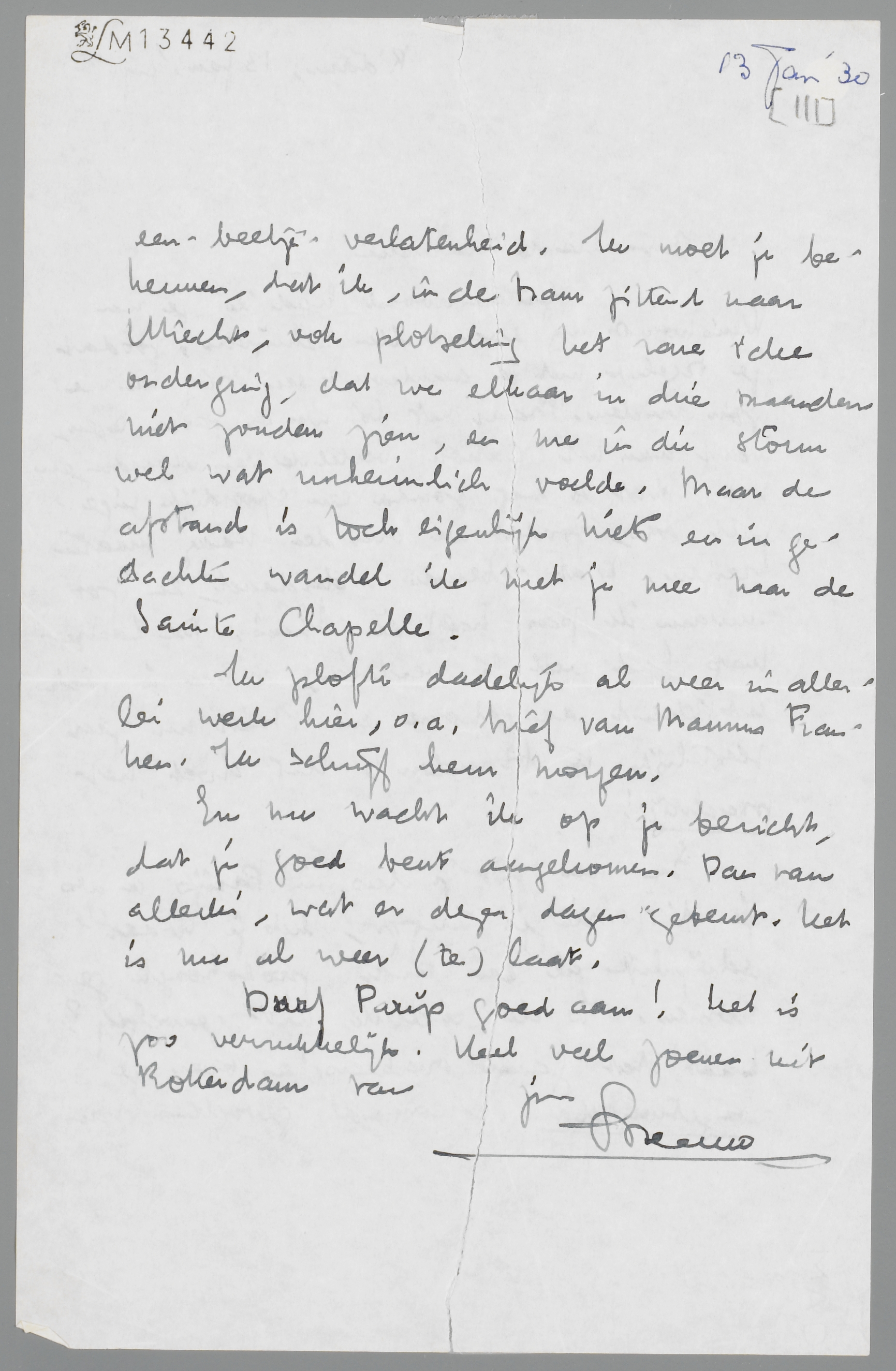 En nu zit je dus in Parijs en als je dit briefje krijgt, heb je waarschijnlijk al een eerste poolshoogte genomen. Is de indruk niet geweldig? Laat dat gauw overheerschen over je ongetwijfeld vrijkomende gevoelens van een-beetje-verlatenheid. Ik moet je bekennen, dat ik, in de tram zittend naar Utrecht, ook plotseling het rare idee onderging, dat we elkaar in drie maanden niet zouden zien, en me in die storm wel wat unheimlich voelde. Maar de afstand is toch eigenlijk niets en in gedachten wandel ik met je mee naar de Sainte Chapelle.
