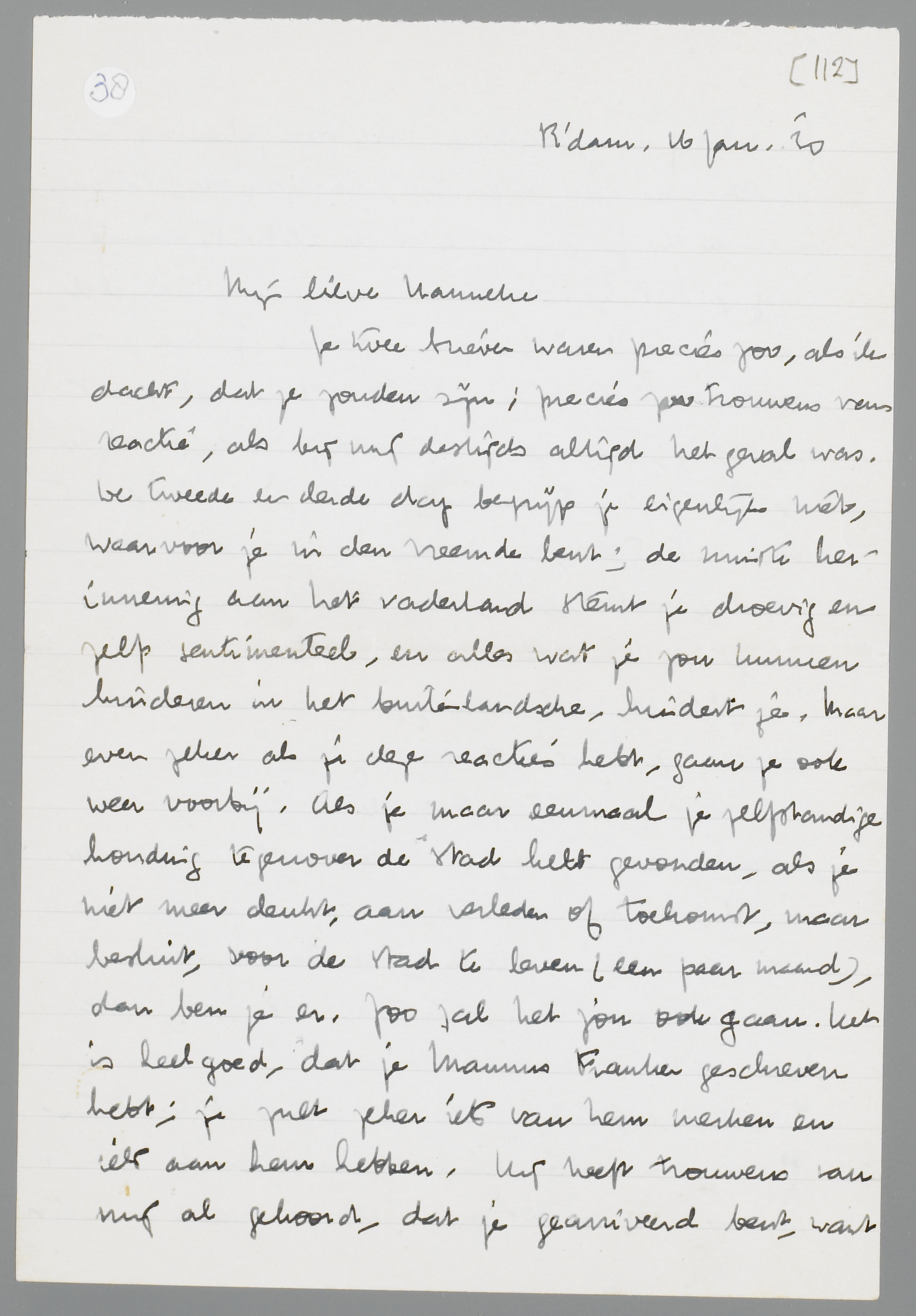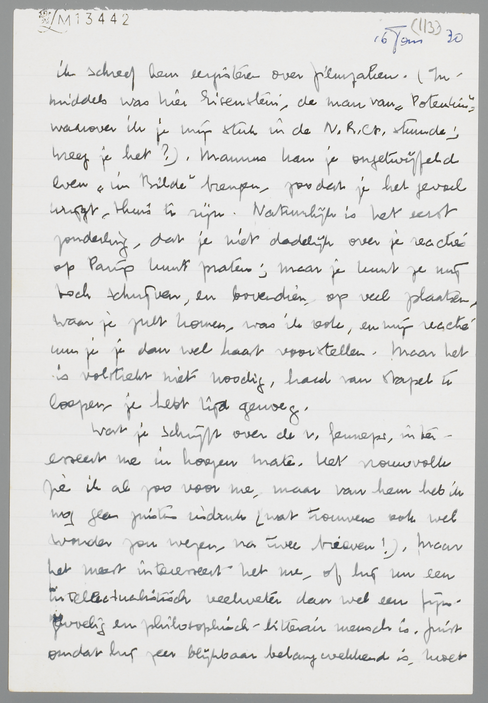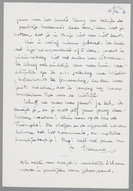De eerste dagen ben je nu al door, en ik weet, dat je, als je deze brief hebt, al weer de reden van je Parijsche bezoek in ziet. Maar ga er vooral veel op uit, orienteer je in de métro en zie veel, niet toerist-achtig, maar intens. Ga om mij een pleizier te doen, eens gauw naar het musée Cluny en bekijk de prachtige Madonna’s daar eens; dan weet je meteen, dat je in Parijs niet voor niets bent.