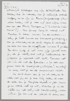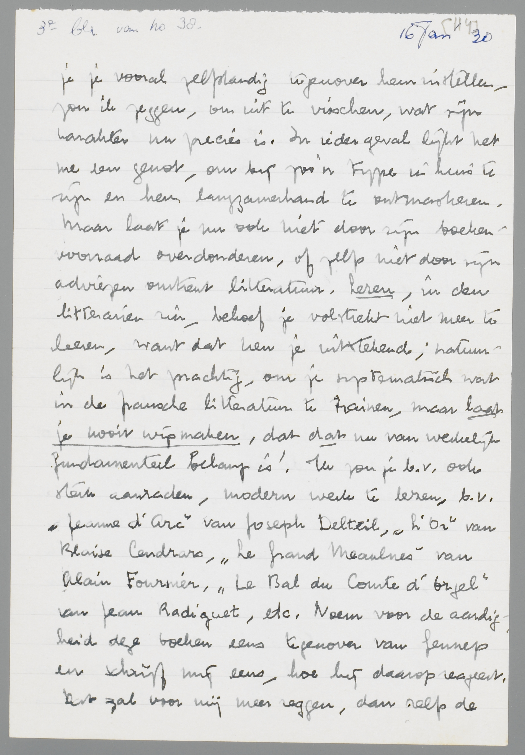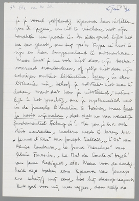 Wat je schrijft over de v. Genneps, interesseert me in hoogen mate. Het vrouwvolk zie ik al zoo voor me, maar van hem heb ik nog geen juisten indruk (wat trouwens ook wel wonder zou wezen, na twee brieven!). Maar het meest interesseert het me, of hij nu een intellectualistisch veelweter dan wel een fijngevoelig en philosophisch-literair mensch is. Juist omdat hij zeer blijkbaar belangwekkend is, moet je je vooral zelfstandig tegenover hem instellen, zou ik zeggen, om uit te visschen, wat zijn karakter nu precies is. In ieder geval lijkt het me een genot, om bij zoo’n type in huis te zijn en hem langzamerhand te ontmaskeren. Maar laat je nu ook niet door zijn boekenvoorraad overdonderen, of zelfs niet door zijn adviezen omtrent litteratuur. Lezen, in den litterairen zin, behoef je volstrekt niet meer te leeren, want dat ken je uitstekend; natuurlijk is het prachtig, om je systematisch wat in de fransche litteratuur te trainen, maar laat je nooit wijsmaken, dat dat nu van werkelijk fundamenteel belang is! Ik zou je b.v. ook sterk aanraden, modern werk te lezen, b.v. ‘Jeanne d’Arc’ van Joseph Delteil, ‘L'Or’ van Blaise Cendrars, ‘Le Grand Meaulnes’ van Alain Fournier, ‘Le Bal du Comte d’Orgel’ van Jean Radiguet, etc. Noem voor de aardigheid deze boeken eens tegenover van Gennep en schrijf mij eens, hoe hij daarop reageert. Dit zal voor mij meer zeggen, dan zelfs de uitvoerigste catalogus van zijn bibliotheek. De boeken, die ik noemde, kun je natuurlijk overal krijgen, en zijn in Frankrijk goedkoop (Tusschen haken, wil je voor mij eens kijken naar een ex. van Henri Bergson, ‘L’Evolution Créatrice’?). Van Gennep hoop ik vooral met Paschen te leeren kennen. En de anderen... Och, je hebt humor en carnavalsgeest genoeg, om je daarover, na de eerste dagen, te verheugen en ook om van de afwijkende normen te genieten. Pas dan krijg je het ware vrije gevoel over je, als je voelt, dat met je hollandsche begrippen je zekerheid niet valt, trouwens net zoo min als met de fransche. Ga ook eens gauw naar de avantgarde ‘uitkijken’, en schrijf me eens, wat je van de programma’s vindt.