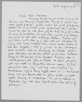 Vanwege de Zondag en omdat ik in Zeist ben en mij blocnote vergeten heb, schrijf ik op dit ongewoon fraaie papier! Gisteren kwam hier juist je brief aan, zoodat ik van je laatste gestes op de hoogte ben, al vermoed ik, dat ik wel gauw zelf een brief van je zal vinden. Ik zond je inmiddels, na mijn brief nog de Vrije Bladen; die zul je nu ook zeker ontvangen hebben. Mama zegt mij daar juist, dat ze je deze week zal schrijven; ik breng dat maar dadelijk over, want anders mocht ik het eens vergeten. Stel je gerust: ik ben uitvoerig in bad geweest, heb me omstandig van allerlei schoon goed voorzien, en ben dus geheel in een reine toestand. Maar ik was pas om 12 uur beneden! Trof hier alles in welstand aan, ook Johan en Phieta. De eerste zit juist met zijn vader te dispuleeren over de vraag of hij vanavond mee ‘mag’ met mij naar Eisenstein in Amsterdam. (Jij in Parijs lacht, denk ik!) Die houdt daar n.l. een voordracht en Johan tracht zijn goed recht daarop te verdedigen. Ik zal er vanavond in Rotterdam nog wel even bij schrijven, hoe het is afgeloopen.