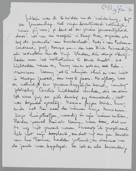 Gisteren was ik te midden van de vriendenkring, bij De Gemeenschap. Veel vragen beantwoord natuurlijk. Waar jij was; je bent al een geziene persoonlijkheid daar! Het was een receptie in Pays-Bas, ongeveer als bij de promotie van Donkersloot. Rede’s van Fockema, Andreae, Prof. Pompe en... den heer Dirk Binnendijk, als redacteur van de Vrije Bladen, die eenige stoutigheden over het katholicisme te berde bracht. De Lichtvelden waren er, Emmy was er ook en ook Rien... Marsman. Henny zat te schrijven thuis en was niet te bewegen geweest, om mee te gaan. Na afloop was er natuurlijk een gemeenschappelijke borrel, waarbij plotseling Cecilia Lichtveld verscheen, die van arm tot arm ging en zich daarbij erg amuseerde. Het was bepaald gezellig. Daarna gingen Dirk-Enny en ik met Rien naar de nieuwen huize Marsman. Deze thuisgetroffen, waardig in zijn nieuwe milieu. Beiden, zoowel Rien als Henny waren boos, dat we er nog niet geweest waren, waarop ik gerepliceerd heb met mijn boosheid, omdat zij ons geen bericht van hun trouwen hadden gestuurd; en daarmee was de zaak weer bijgelegd. Ik heb er alle bewondering voor, zooals zij van een schijntje geld hun huis uitstekend hebben ingericht. Er staat weinig, maar wat er staat is goed en het geheel is werkelijk bewonderenswaardig. Gematigde stijl van Ravesteyn, veel hebben ze zelf gedaan. 's Avonds ging ik door naar Zeist, niet, dan na een heerlijk cadeau voor je te hebben gekocht, dat ik in Utrecht zag, waar ik onmiddellijk op verliefd werd en dat ik dus onmiddellijk annexeerde. Ik zeg niet, wat het is; het is te groot, om te verzenden, maar met Paschen zul je het wel zien. Blijf tot zoolang maar nieuwsgierig.