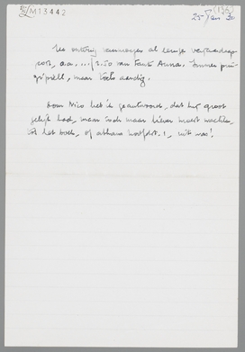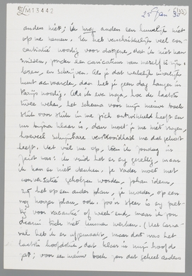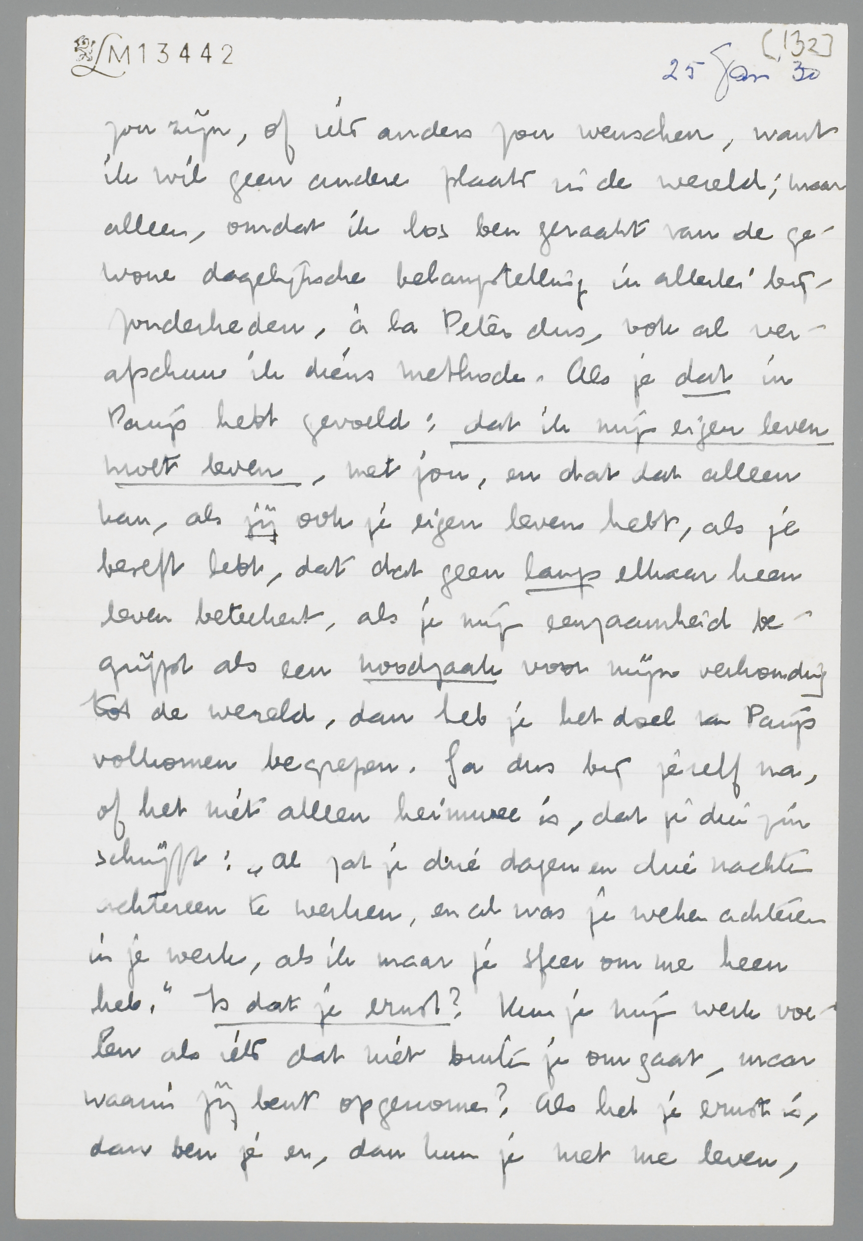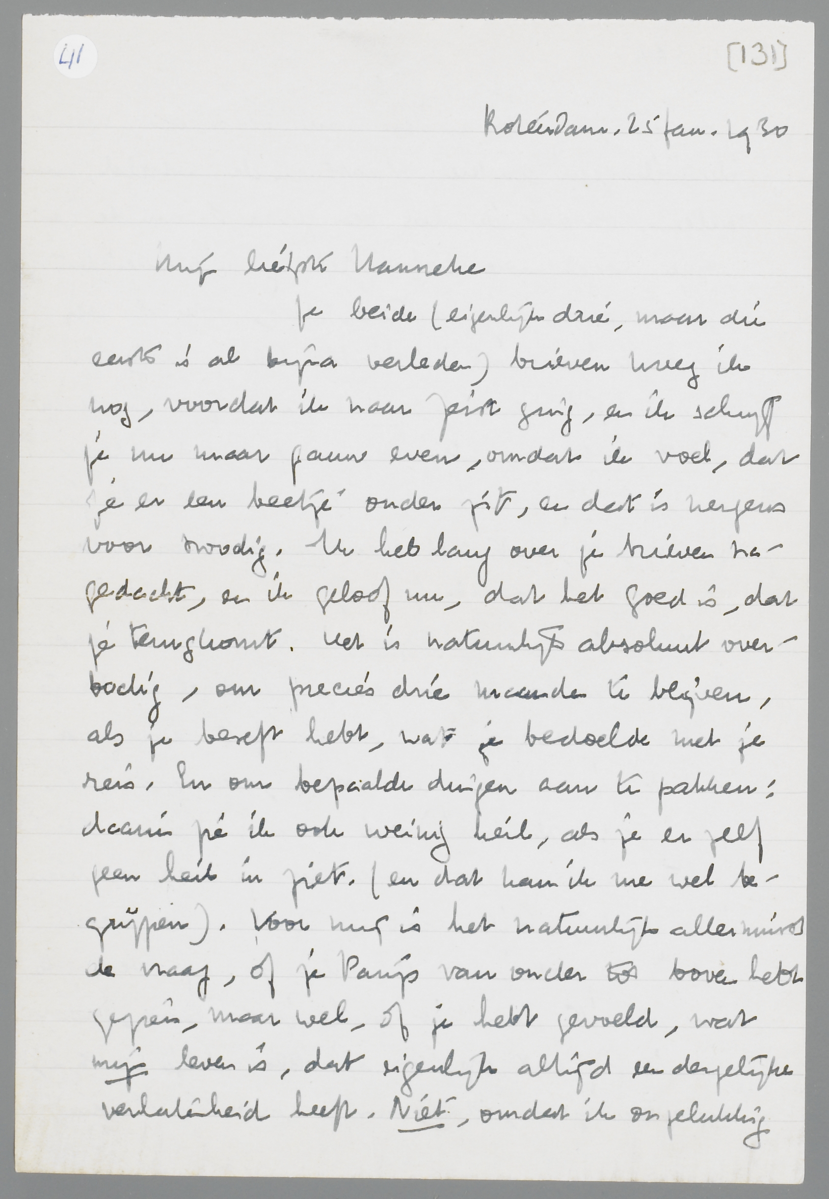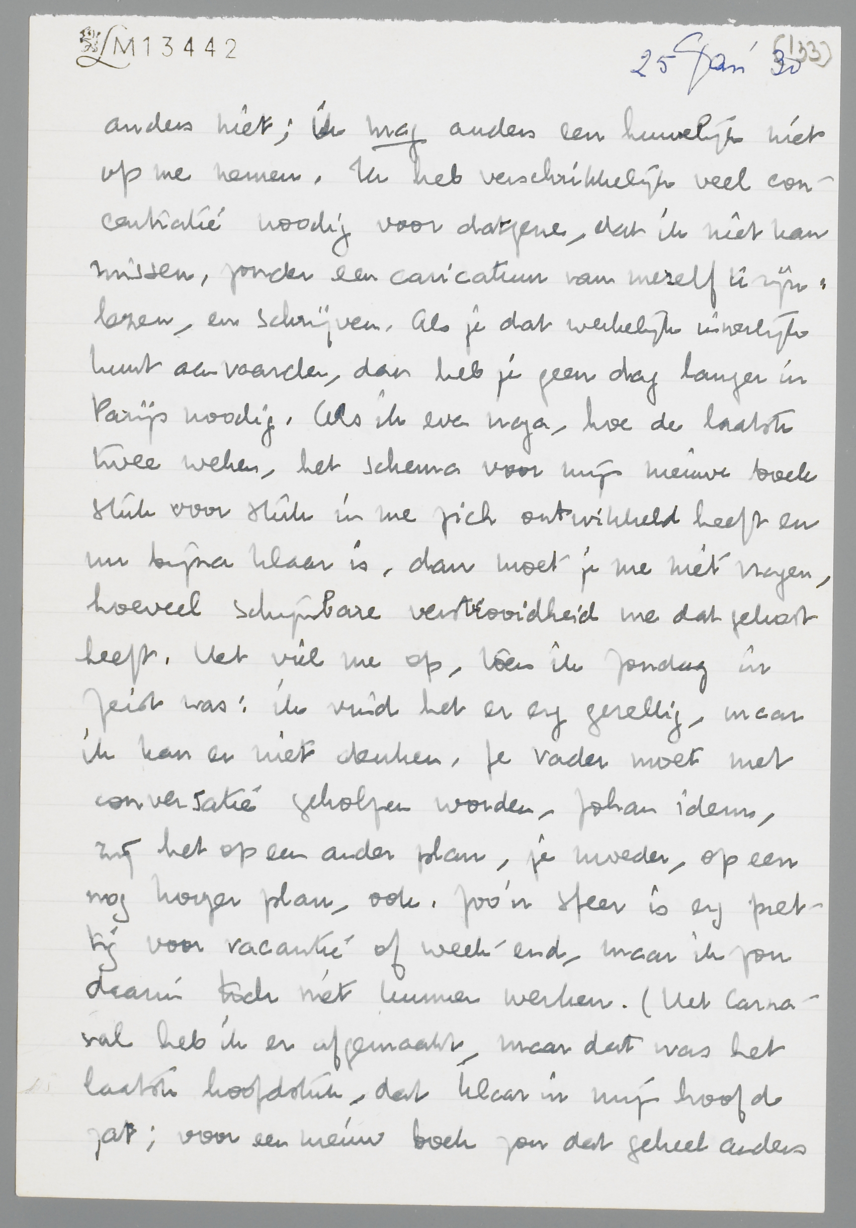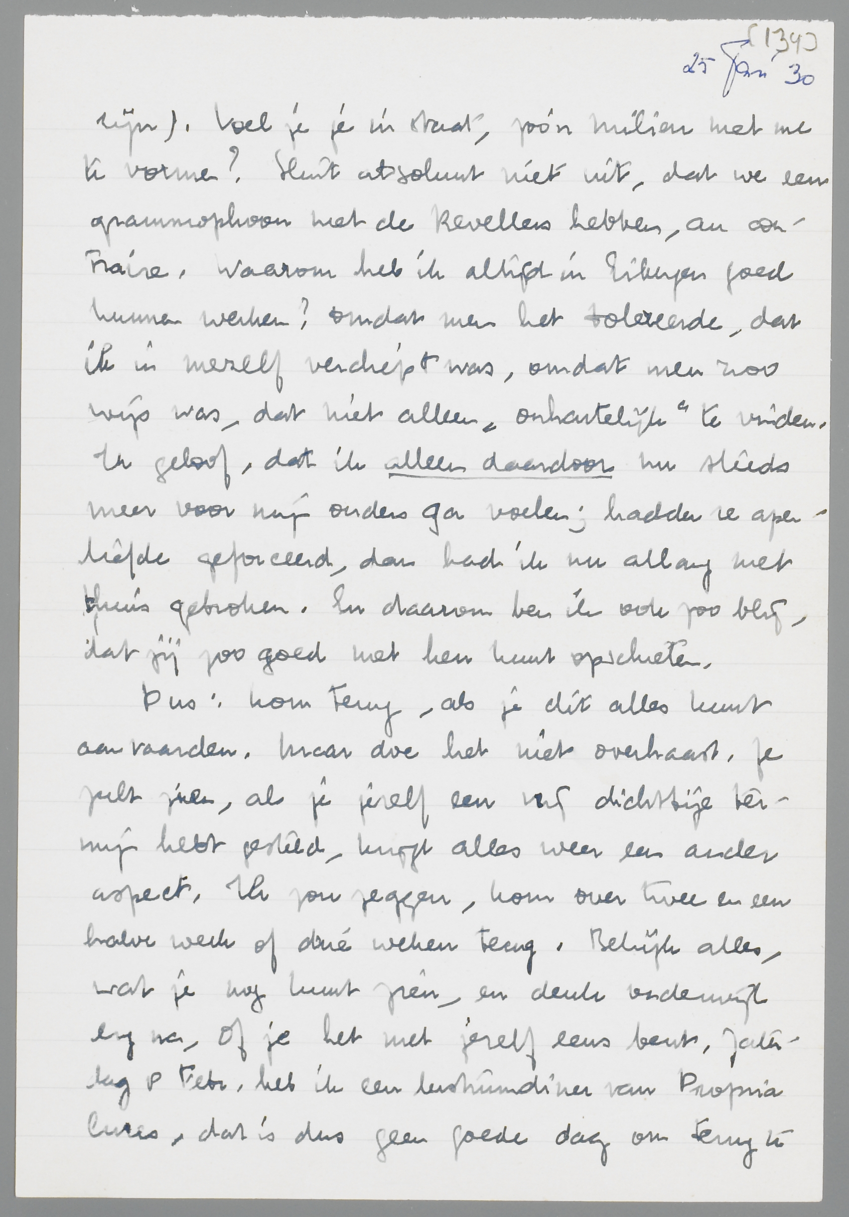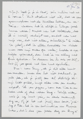 Je beide (eigenlijk drie, maar die eerste is al bijna verleden) brieven kreeg ik nog, voordat ik naar Zeist ging, en ik schrijf je nu maar gauw even, omdat ik voel, dat je er een beetje onder zit, en dat is nergens voor noodig. Ik heb lang over je brieven nagedacht, en ik geloof nu, dat het goed is, dat je terugkomt. Het is natuurlijk absoluut overbodig, om precies drie maanden te blijven, als je beseft hebt, wat je bedoelde met je reis. En om bepaalde dingen aan te pakken: daarin zie ik ook weinig heil, als je er zelf geen hart in ziet. (En dat kan ik best wel begrijpen). Voor mij is het natuurlijk allerminst de vraag, of je Parijs van onder tot boven hebt gezien, maar wel, of je hebt gevoeld, wat mijn leven is, dat eigenlijk altijd een dergelijke verlatenheid heeft. Niet, omdat ik ongelukkig zou zijn, of iets anders zou wenschen, want ik wil geen andere plaats in de wereld; maar alleen, omdat ik los ben geraakt van de gewone dagelijksche belangstelling in allerlei bijzonderheden, à la Peter dus, ook al verafschuw ik diens methode. Als je dat in Parijs hebt gevoeld: dat ik mijn eigen leven moet leven, met jou, en dat dat alleen kan, als jij ook je eigen leven hebt, als je beseft hebt, dat dat geen langs elkaar heen leven beteekent, als je mijn eenzaamheid begrijpt als een noodzaak voor mijn verhouding tot de wereld, dan heb je het doel van Parijs volkomen begrepen. Ga dus bij jezelf na, of het niet alleen heimwee is, dat je dien zin schrijft: ‘al zat je drie dagen en drie nachten achtereen te werken, en al was je weken achtereen in je werk, als ik maar je sfeer om me heen heb’. Is dat je ernst? Kun je mijn werk voelen als iets dat niet buiten je omgaat, maar waarin jij bent opgenomen? Als het je ernst is, dan ben je er, dan kun je met me leven, anders niet; ik mag anders een huwelijk niet op me nemen. Ik heb verschrikkelijk veel concentratie noodig voor datgene, dat ik niet kan missen, zonder een caricatuur van mezelf te zijn: lezen en schrijven. Als je dat werkelijk innerlijk kunt aanvaarden, dan heb je geen dag langer in Parijs noodig. Als ik even naga, hoe de laatste twee weken, het schema voor mijn nieuwe boek stuk voor stuk in me zich ontwikkeld heeft en nu bijna klaar is, dan moet je me niet vragen, hoeveel schijnbare verstrooidheid me dat gekost heeft. Het viel me op, toen ik Zondag in Zeist was: ik vind het er erg gezellig, maar ik kan er niet denken. Je vader moet met conversatie geholpen worden, Johan idem, zij het op een ander plan, je moeder, op een nog hooger plan, ook. Zoo’n sfeer is erg prettig voor vacantie of week-end, maar ik zou daarin toch niet kunnen werken. (Het Carnaval heb ik er afgemaakt, maar dat was het laatste hoofdstuk, dat klaar in mijn hoof zat; voor een nieuw boek zou dat geheel anders zijn). Voel je je in staat, zoo’n milieu met me te vormen? Sluit absoluut niet uit, dat we een grammophoon met de Revellers hebben, au contraire. Waarom heb ik altijd in Eibergen goed kunnen werken? Omdat men het tolereerde, dat ik in mezelf verdiept was, omdat men zoo wijs was, dat niet alleen ‘onhartelijk’ te vinden. Ik geloof, dat ik alleen daardoor nu steeds meer voor mijn oudes ga voelen; hadden ze apenliefde geforceerd, dan had ik nu allang met thuis gebroken. En daarom ben ik ook zoo blij, dat jij zoo goed met hen kunt opschieten.
