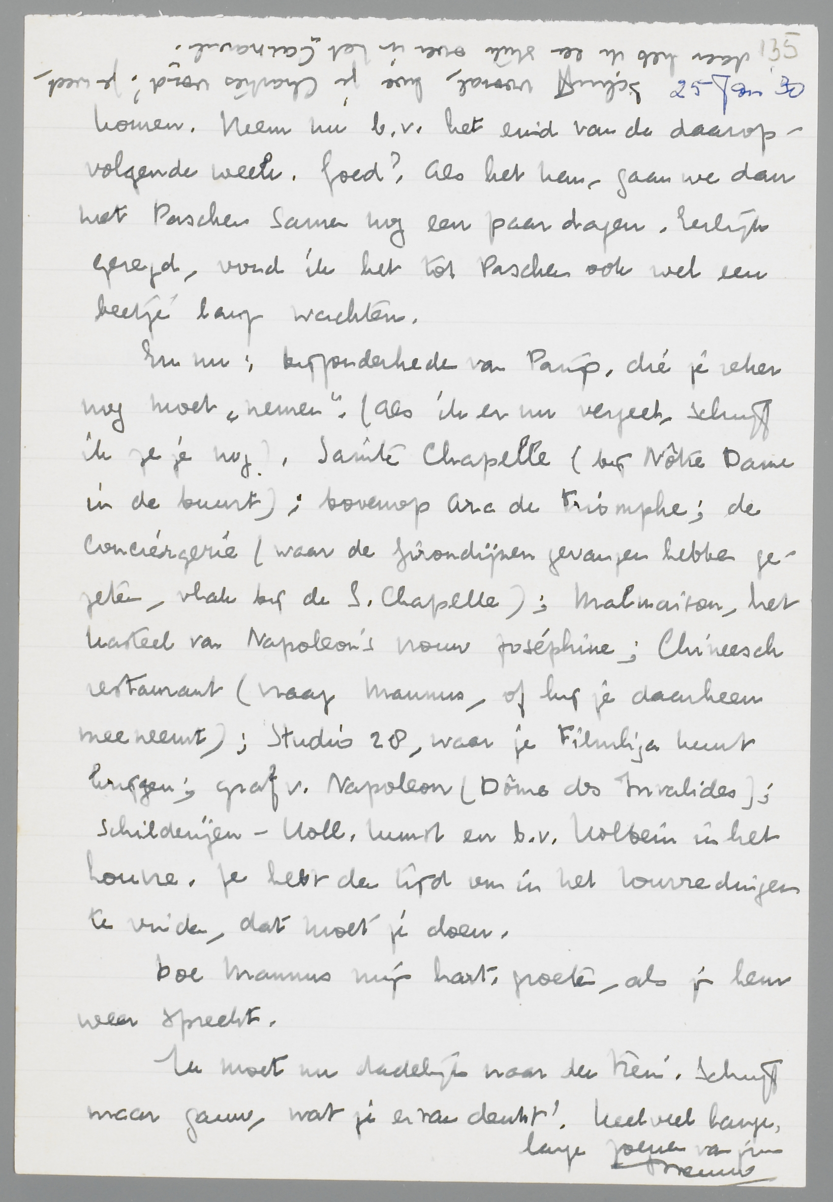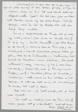 En nu: bijzonderheden van Parijs, die je zeker nog moet ‘nemen’. (Als ik er nu vergeet, schrijf ik ze je nog: Sainte Chapelle (bij Nôtre Dame in de buurt); bovenop Arc de Triomphe; de Conciergerie (waar de Girondijnen gevangen hebben gezeten, vlak bij de S. Chapelle); Malmaison, het kasteel van Napoleon’s vrouw Josephine; Chineesch restaurant (vraag Mannus, of hij je daarheen meeneemt); Studio 28, waar je Filmliga kunt krijgen; graf van Napoleon (Dôme des Invalides); schilderijen - Holl. kunst en b.v. Holbein in het Louvre. Je hebt den tijd om in het Louvre dingen te vinden, dat moet je doen.