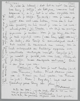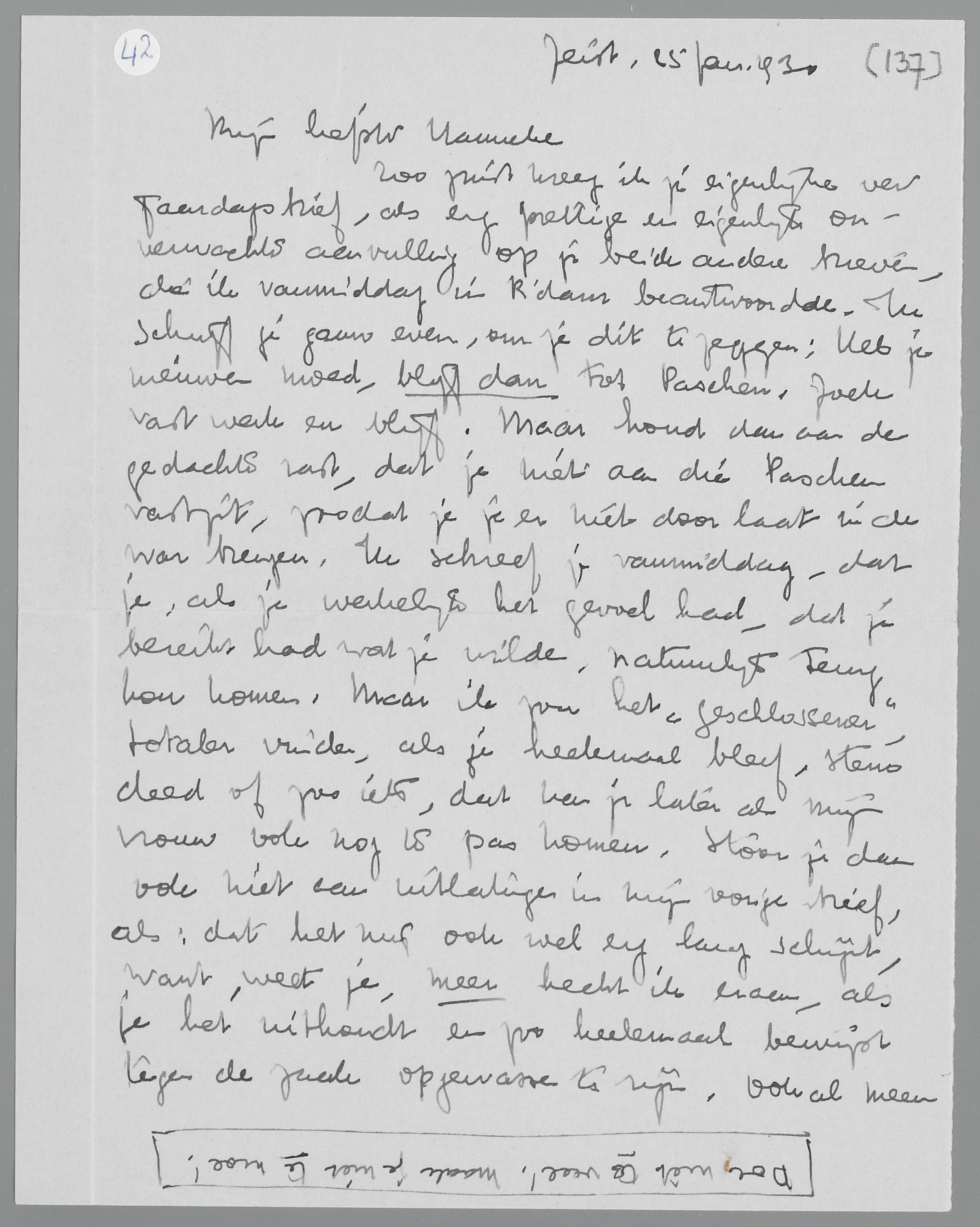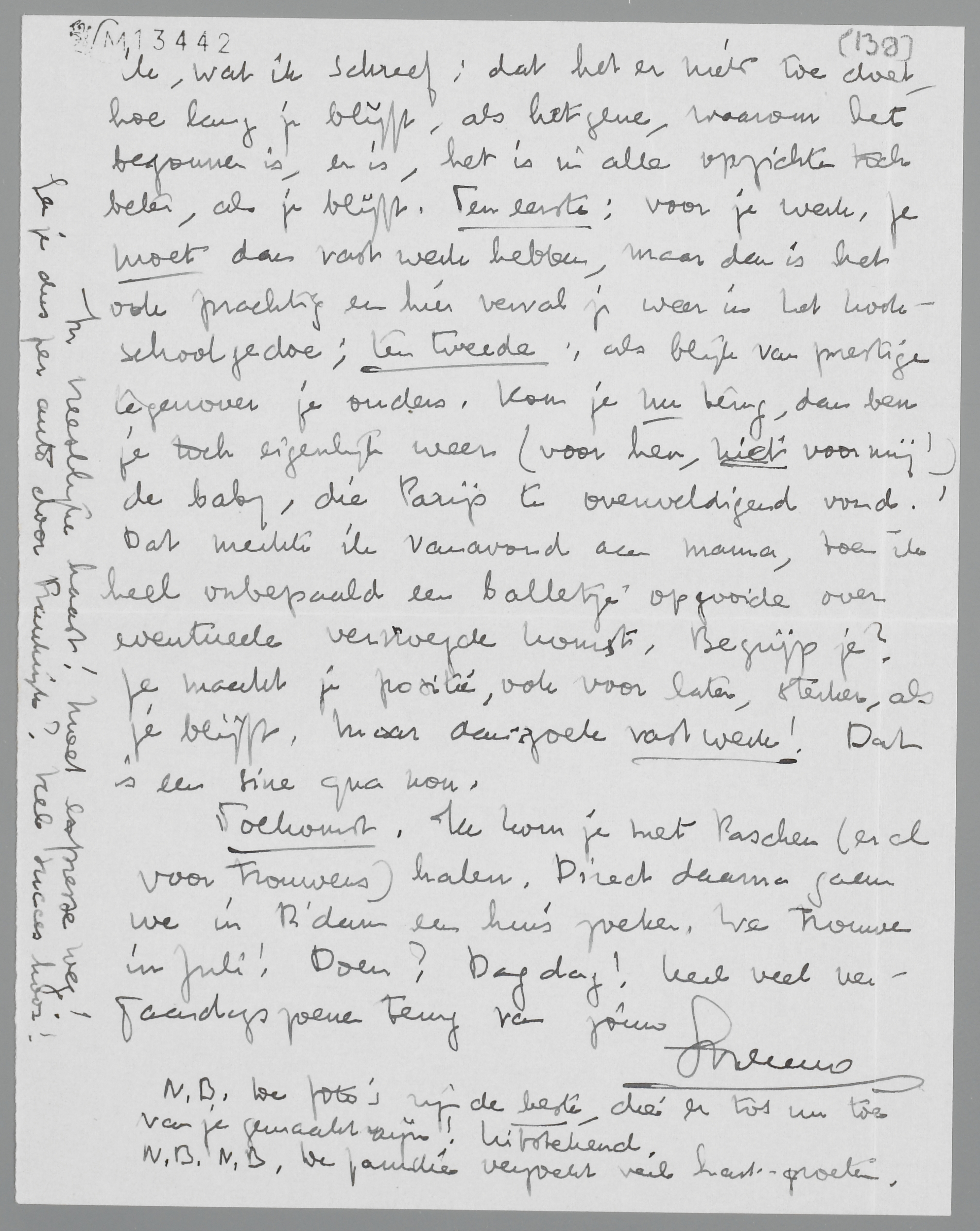 Zoo juist kreeg ik je eigenlijke verjaardagsbrief, als erg prettige en eigenlijk onverwachtse aanvulling op je beide andere brieven, die ik vanmiddag in R'dam beantwoordde. Ik schrijf je gauw even, om je dit te zeggen: Heb je nieuwen moed, blijf dan tot Paschen. Zoek vast werk en blijf. Maar houd dan aan de gedachte vast, dat je niet aan die Paschen vastzit, zoodat je je er niet door laat in de war brengen. Ik schreef je vanmiddag, dat je, als je werkelijk het gevoed had, dat je bereikt had wat je wilde, natuurlijk terug kan komen. Maar ik zou het ‘geschlossener’, totaler vinden, als je heelemaal bleef, stene deed of zoo iets, dat kan je later als mijn vrouw te pas komen. Stoor je dan ook niet aan uitlatingen in mijn vorige brief, als: dat het mij ook wel erg lang schijnt, want, weet je, meer hecht ik eraan, als je het uithoudt en zoo heelemaal bewijst tegen de zaak opgewassen te zijn. Ook al meen ik, wat ik schreef: dat het er niets toe doet, hoe lang je blijft, als hetgene, waarom het begonnen is, er is, het is in alle opzichten toch beter, als je blijft. Ten eerste: voor je werk, je moet dan vast werk hebben, maar dan is het ook prachting en hier verval je weer in het kookschoolgedoe; ten tweede: als blijk van prestige tegenover je ouders. Kom je nu terug, dan ben je toch eigenlijk weer (voor hen, niet voor mij!) de baby, die Parijs te overweldigend vond. Dat merkte ik vanavond aan mama, toen ik heel onbepaald een balletje opgooide over eventueele vervroegde komst. Begrijp je? Je maakt je positie, ook voor later, sterker, als je blijft, maar dan: zoek vast werk! Dat is een sine qua non.