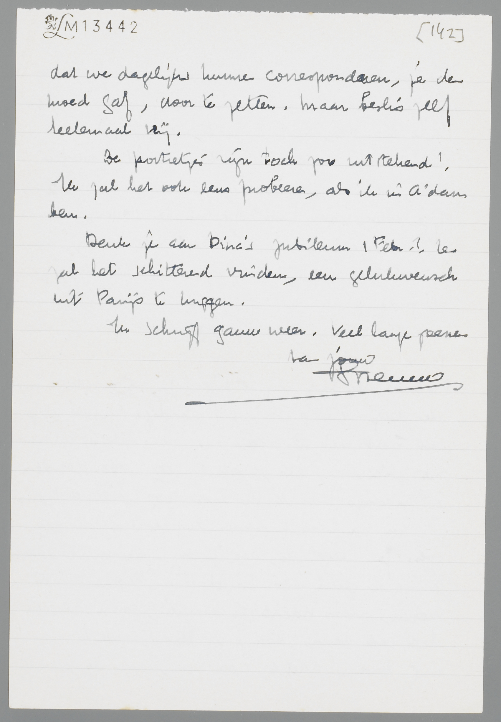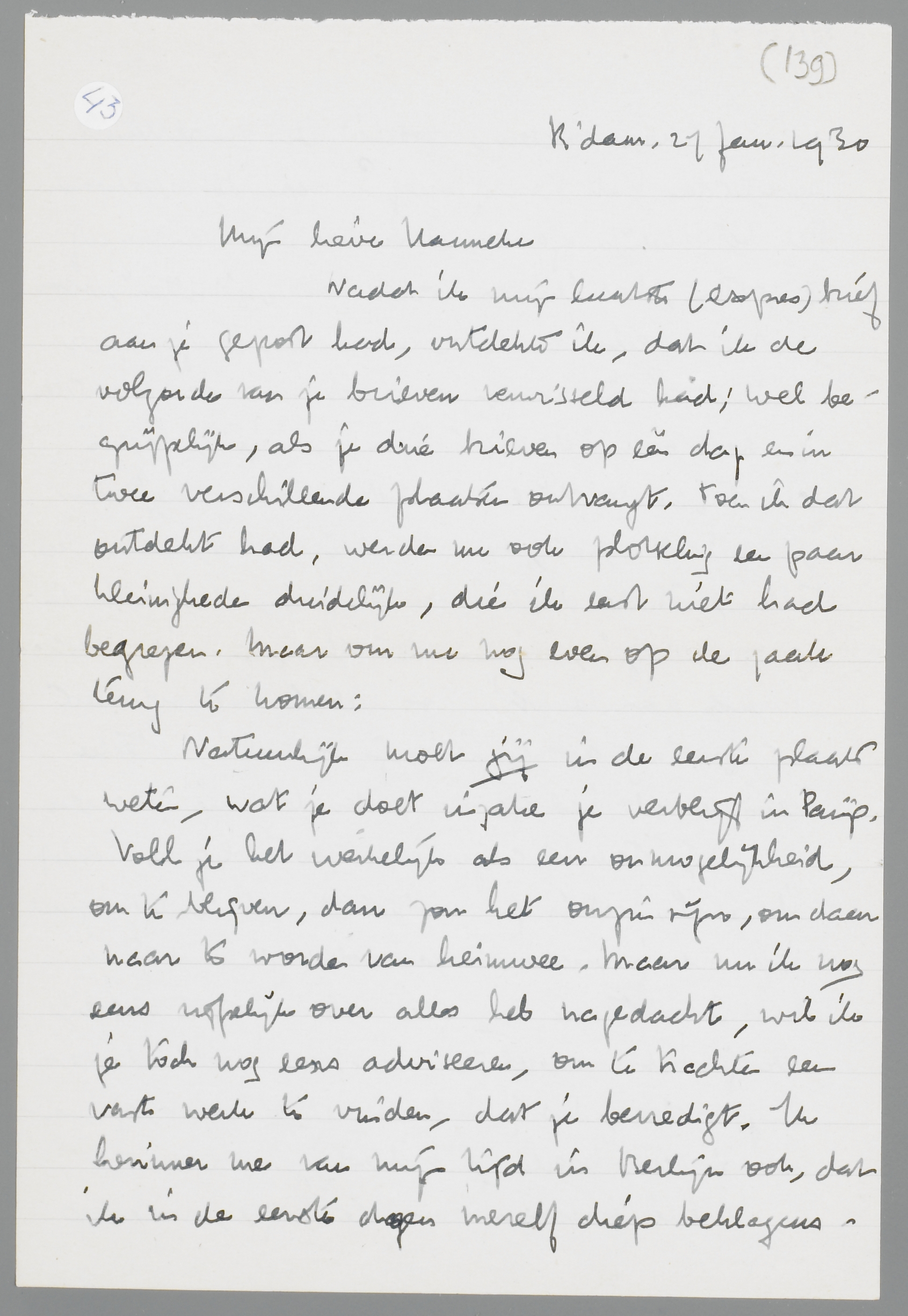 Nadat ik mijn laatste (expres)brief aan je gepost had, ontdekte ik, dat ik de volgorde van je brieven verwisseld had; wel begrijpelijk, als je drie brieven op één dag en in twee verschillende plaatsten ontvangt. Toen ik dat ontdekt had, werden me ook plotseling een paar kleinigheden duidelijk, die ik eerst niet had begrepen. Maar om nu nog even op de zaak terug te komen: