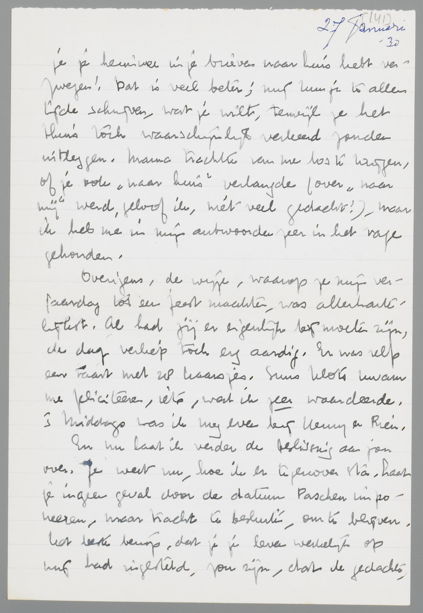 Hulde overigens voor de wijze, waarop je je heimwee in je brieven naar huis hebt verzwegen! Dat is veel beter; mij kun je te allen tijde schrijven, wat je wilt, terwijl ze het thuis toch waarschijnlijk verkeerd zouden uitleggen. Mama trachtte van me los te krijgen, of je ook ‘naar huis’ verlangde (over ‘naar mij’ werd, geloof ik, niet veel gedacht!), maar ik heb me in mijn antwoorden zeer in het vage gehouden.