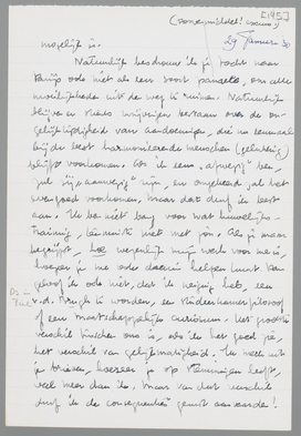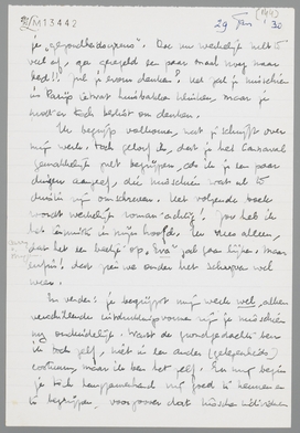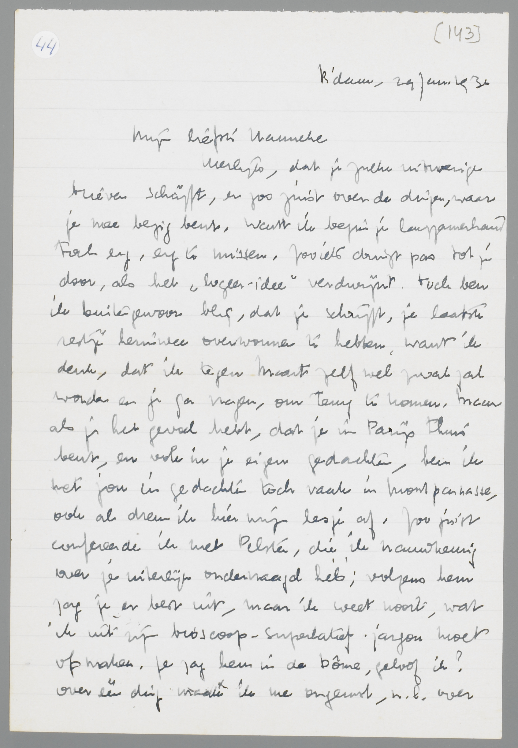 Heerlijk, dat je zulke uitvoerige brieven schrijft, en zoo juist over de dingen, waar je mee bezig bent. Want ik begin je langzamerhand toch erg, erg te missen. Zoo iets dringt pas tot je door, als het ‘logeer-idee’ verdwijnt. Toch ben ik buitengewoon blij, dat je schrijft, je laatste restje heimwee overwonnen te hebben, want ik denk, dat ik tegen Maart zelf wel zwak zal worden en je ga vragen, om terug te komen. Maar als je het gevoel hebt, dat je in Parijs thuis bent, en ook in je eigen gedachten, ben ik met jou in gedachten toch vaak in Mont-Parnasse, ook al dreun ik hier mijn lesje af. Zoo juist confereerde ik met Pelster, die ik nauwkeurig over je uiterlijk ondervraagd heb; volgens hem zag je er best uit, maar ik weet nooit, wat ik uit zijn bioscoop-superlatief-jargon moet opmaken. Je zag hem in de Dôme, geloof ik? Over één ding maakte ik me ongerust, n.l. over je ‘gezondheidsgrens’. Doe nu werkelijk niet te veel af, ga geregeld een paar maal vroeg naar bed!! Zul je erom denken? Het zal je misschien in Parijs ietwat huisbakken klinken, maar je moet er toch beslist om denken.