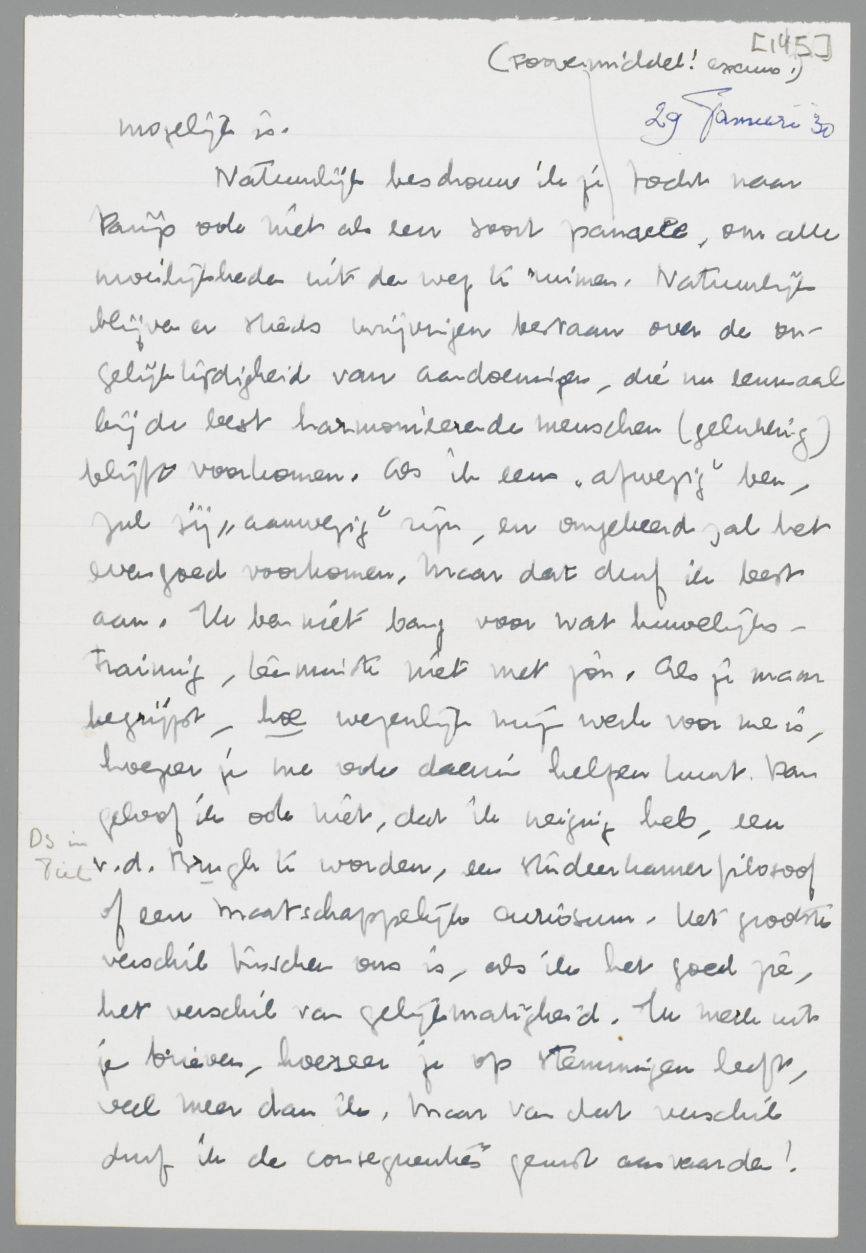 Natuurlijk beschouw ik je tocht naar Parijs ook niet als een soort panacee (toovermiddel! excuus), om alle moeilijkheden uit den weg te ruimen. Natuurlijk blijven er steeds wrijvingen bestaan over de ongelijktijdigheid van aandoeningen, die nu eenmaal bij de best harmonieerende menschen (gelukkig) blijft voorkomen. Als ik eens ‘afwezig’ ben, zul jij ‘aanwezig’ zijn, en omgekeerd zal het evengoed voorkomen, maar dat durf ik best aan. Ik ben niet bang voor wat huwelijkstraining, tenminste niet met jou. Als je maar begrijpt, hoe wezenlijk mijn werk voor me is, hoezeer je me ook daarin helpen kunt. Dan geloof ik ook niet, dat ik neiging heb, een v.d. Brugh te worden, een studeerkamerfilosoof of een maatschappelijk curiosum. Het grootste verschil tusschen ons is, als ik het goed zie, het verschil van gelijkmatigheid. Ik merk uit je brieven, hoezeer je op stemmingen leeft, veel meer dan ik, maar van dat verschil durf ik de consequenties gerust aanvaarden!