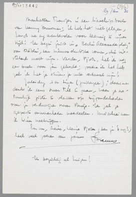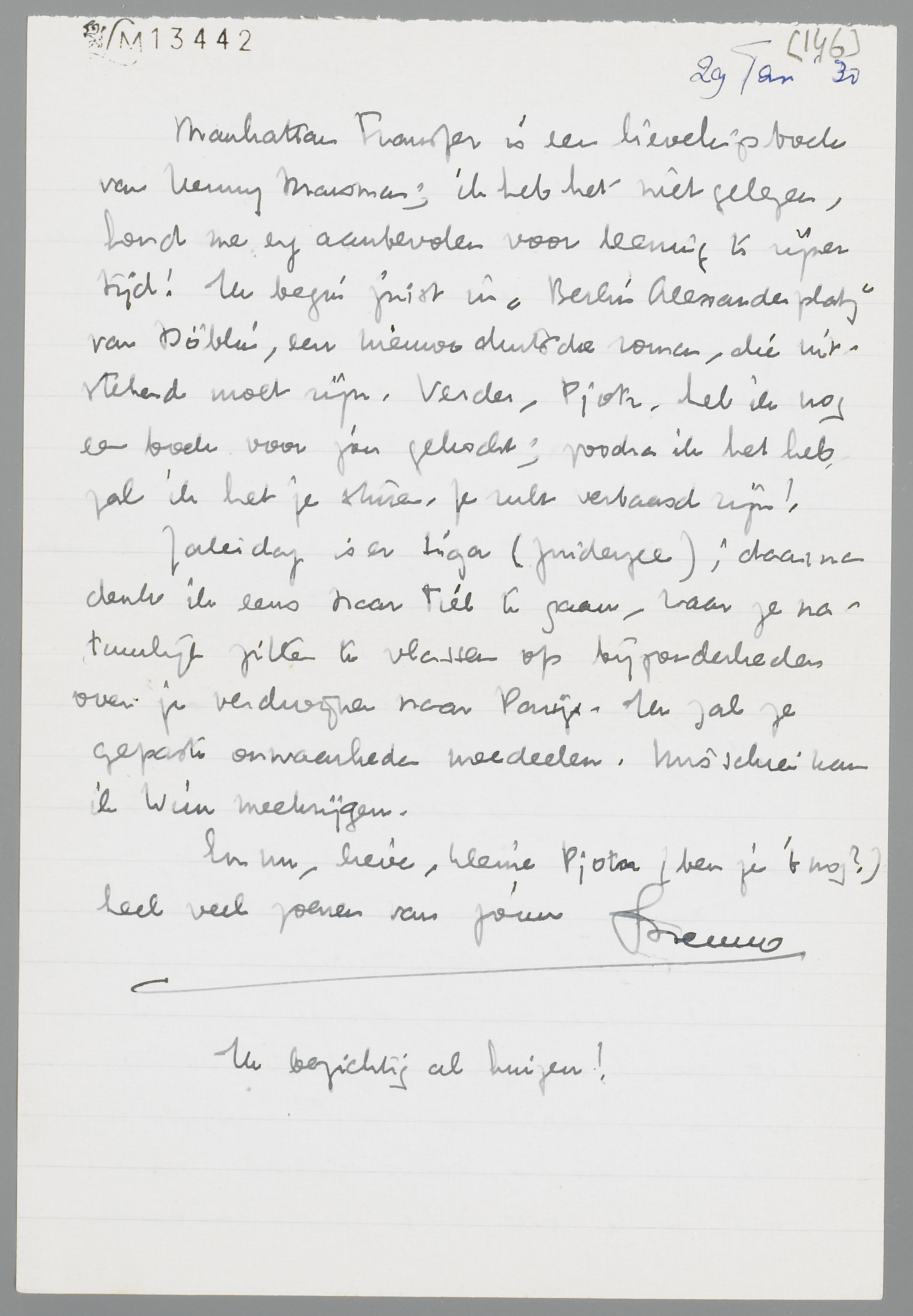 Manhattam Transfer is een lievelingsboek van Henny Marsman; ik heb het niet gelezen, houd me erg aanbevolen voor leezing te zijner tijd! Ik begin juist in ‘Berlin Alexander Platz’ van Döblin, een nieuwe duitsche roman, die uitstekend moet zijn. Verder, Pjotr, heb ik nog een boek voor jou gekocht; zoodra ik het heb zal ik het je sturen. Je zult verbaasd zijn!