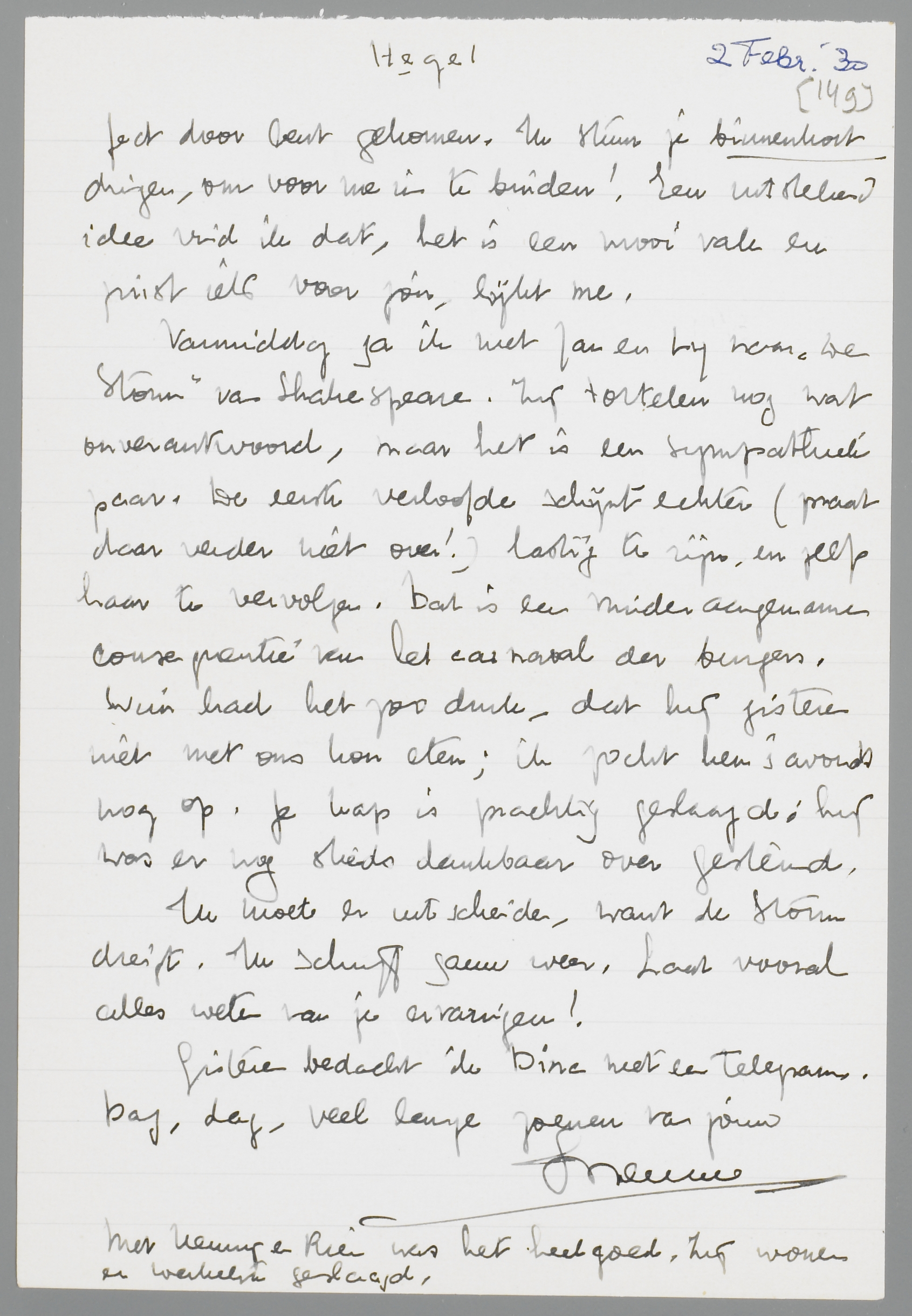 Vanmiddag ga ik met Jan en Ly naar ‘De Storm’ van Shakespeare. Zij tortelen nog wat onverantwoord, maar het is een sympathiek paar. De eerse verloofde schijnt echter (praat daar verder niet over!) lastig te zijn, en zelfs haar te vervolgen. Dat is een minder aangename consequentie van het carnaval der burgers.
