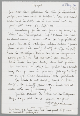 Ik zit nu te schrijven aan het bureau des heeren van Beusekom, in de den Texstr. Plannen, om naar Tiel te gaan, heb ik moeten opgeven, aangezien men daar al gasten had voor vandaag. Ik zal het nu nog maar wat moeten uitstellen, want volgende week is het P.C. diner. Gisteren was er Liga; geheel nederlandsch programma, zoo als je zult zien uit het blad (ik stuur het je met gelijke post op). Het was een succes fou, en weer eens een echte Ligadag. Een volkomen onbekende man uit Wormerveer, Dick Laan, maakte een kostelijke film ‘Voetbal’' die geweldig werd toegejuicht. Verder was Mal prachtig in zijn studie’s, en Zuiderzee is ook een uitstekend ding. Het bestuur kwam dus grijnzend uit het theater.