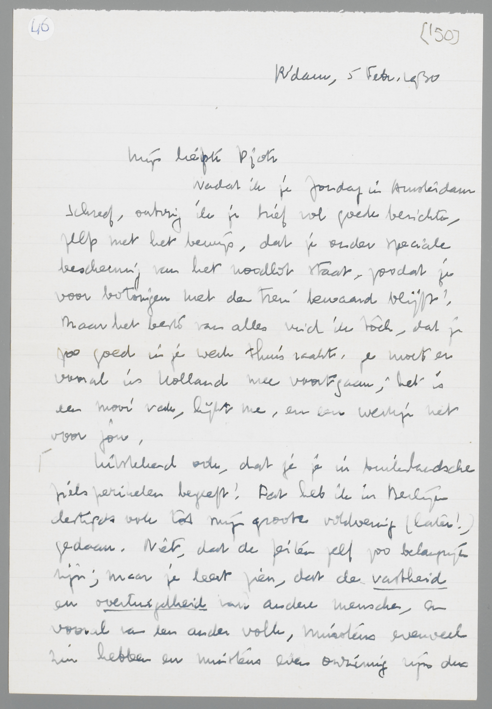 Voor alles ben ik dus blij, dat je het zoo goed maakt. Hoe zal ik je terugzien? Zul je veel veranderd zijn? Naar dat moment zie ik nu al uit. Het zal gauw genoeg komen, als jij het maar goed hebt.
