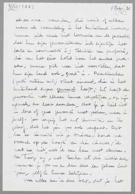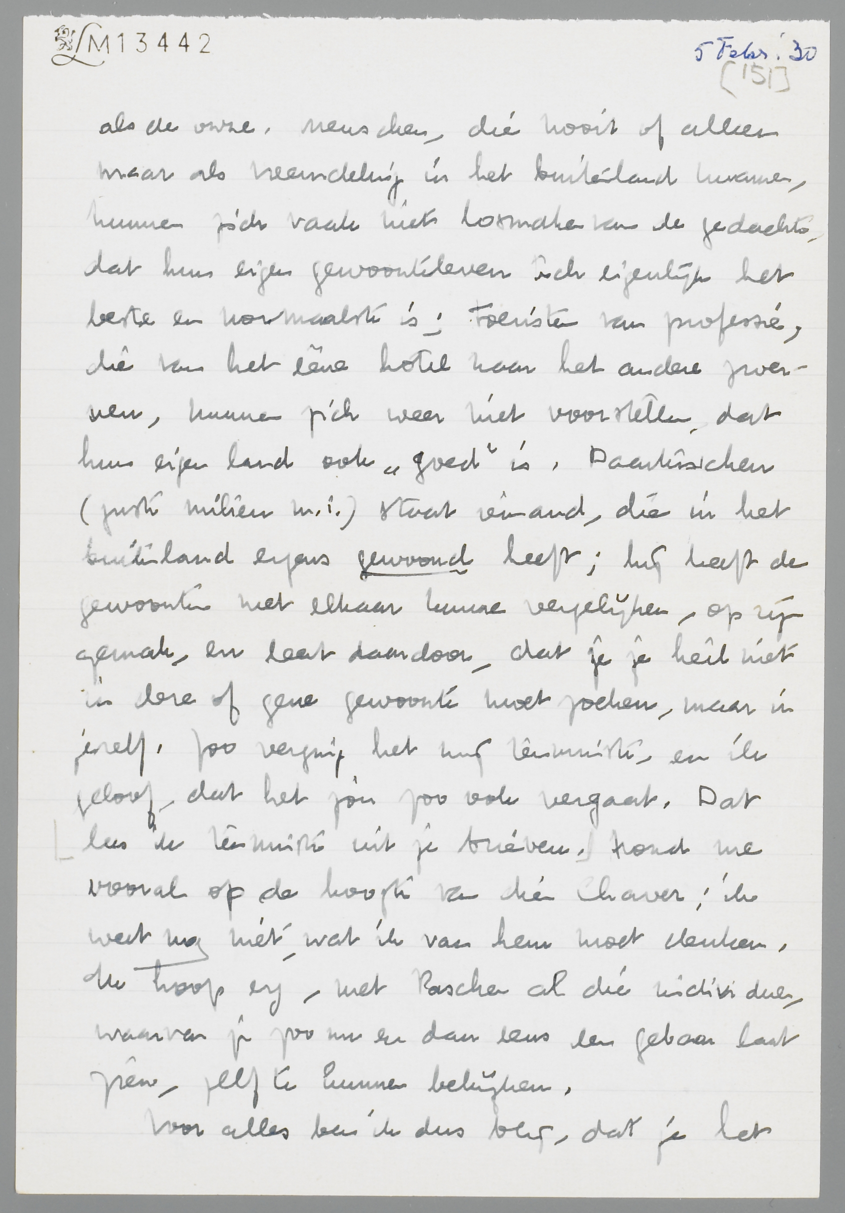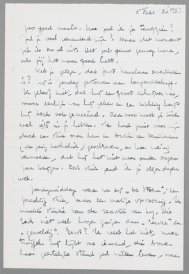 Uitstekend ook, dat je je in buitenlandsche zielsperikelen begeeft! Dat heb ik in Berlijn destijds ook tot mijn groote voldoening (later!) gedaan. Niet, dat de feiten zelf zoo belangrijk zijn, maar je leert zien, dat de vastheid en overtuigdheid van andere menschen, en vooral van een ander volk, minstens evenveel zin hebben en minstens even onzinnig zijn dus als de onze. Menschen, die nooit of alleen maar als vreemdeling in het buitenland kwamen, kunnen zich vaak niet losmaken van de gedachte, dat hun eigen gewoonteleven toch eigenlijk het beste en normaalste is; toeristen van professie, die van het ééne hotel naar het andere zwerven, kunnen zich weer niet voorstellen, dat hun eigen land ook ‘goed’ is. Daartusschen (juste milieu m.i.) staat iemand, die in het buitenland ergens gewoond heeft; hij heeft de gewoonten met elkaar kunnen vergelijken, op zijn gemak, en leert daardoor, dat je je heil niet in deze of gene gewoonte moet zoeken, maar in jezelf. Zoo verging het mij tenminste, en ik geloof, dat het jou zoo ook vergaat. Dat lees ik tenminste uit je brieven. Houd me vooral op de hoogte van dien Chavez: ik weet nog niet, wat ik van hem moet denken. Ik hoop erg, met Paschen al die individuen, waarvan je zoo nu en dan eens een gebaar laat zien, zelf te kunnen bekijken.