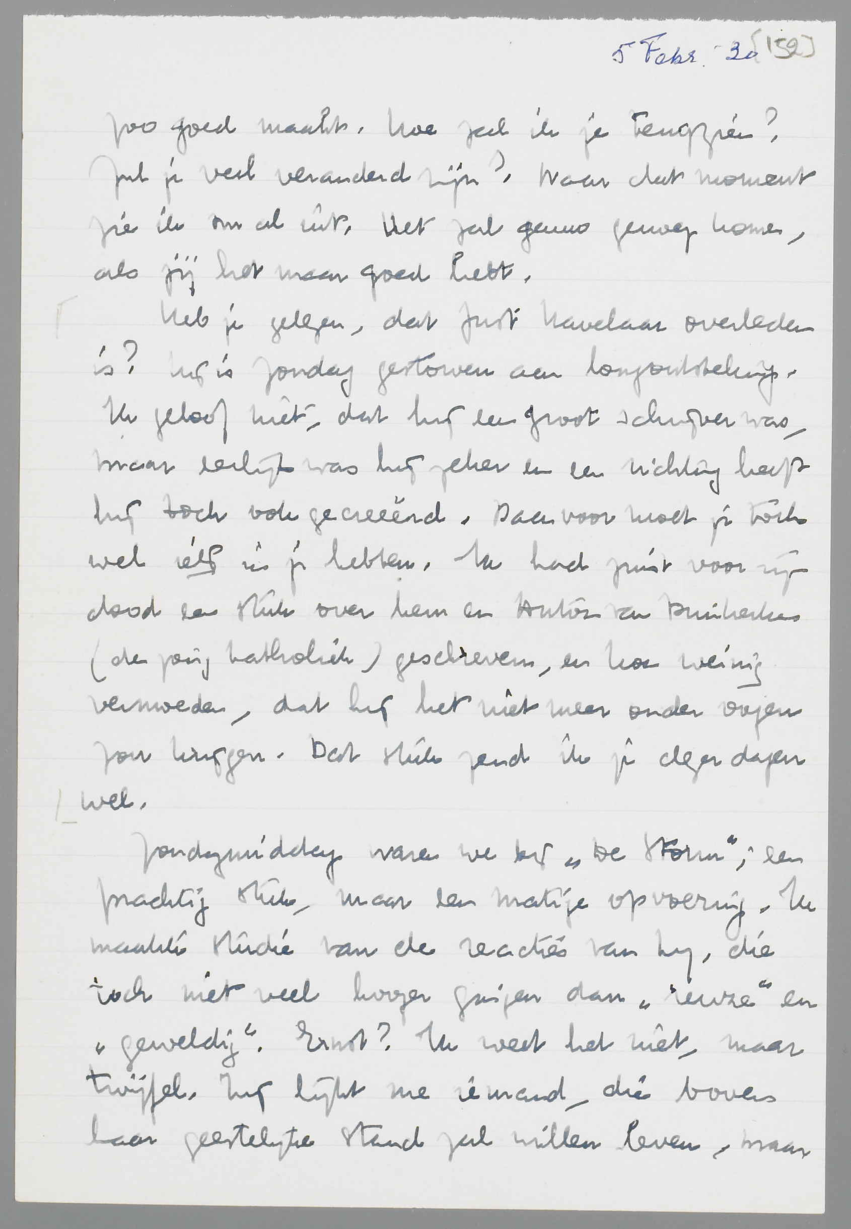 Heb je gelezen, dat Just Havelaar overleden is? Hij is Zondag gestorven aan longontsteking. Ik geloof niet, dat hij een groot schrijver was, maar eerlijk was hij zeker en een richting heeft hij toch ook gecreëerd. Daarvoor moet je toch wet iets in je hebben. Ik had juist voor zijn dood een stukje over hem en Anton van Duinkerken (de jong katholiek) geschreven, en kon weinig vermoeden, dat hij het niet meer onder oogen zou krijgen. Dat stuk zend ik je dezer dagen wel.
