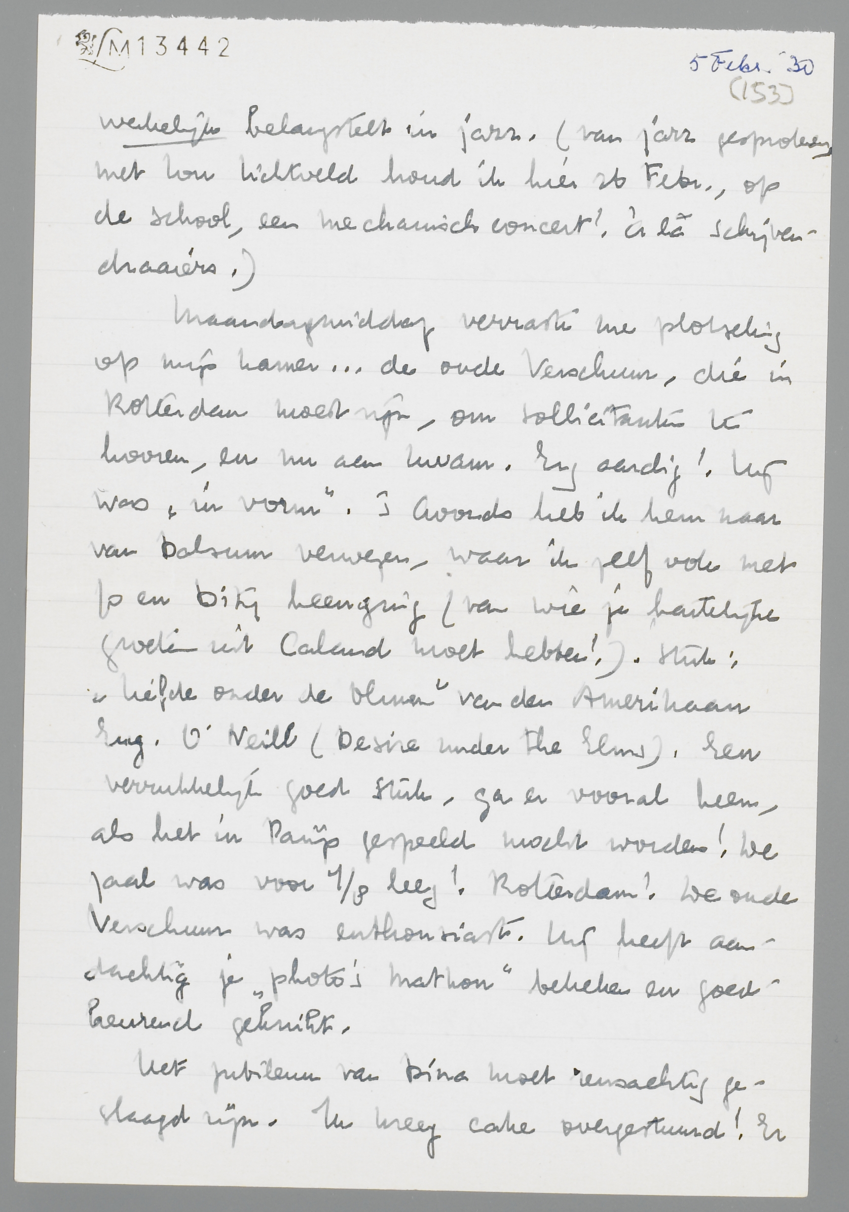 Maandagmiddag verraste me plotseling op mijn kamer… de oude Verschuur, die in Rotterdam moest zijn, om sollicitanten te hooren, en nu aan kwam. Erg aardig! Hij was ‘in vorm’. 's Avonds heb ik hem naar van Dalsum verwezen, waar ik zelf ook met Jo en Dity heenging (van wie je hartelijke groeten uit Caland moet hebben!). Stuk: ‘Liefde onder de Olmen’ van den Amerikaan Eug. O'Neill (Desire under the Elms). Een verrukkelijk goed stuk, ga er vooral heen, als het in Parijs gespeeld mocht worden! De zaal was voor 7/8 leeg! Rotterdam! De oude Verschuur was enthousiast. Hij heeft aandachtig je ‘photo's Mathon’ bekeken en goedkeurend geknikt.